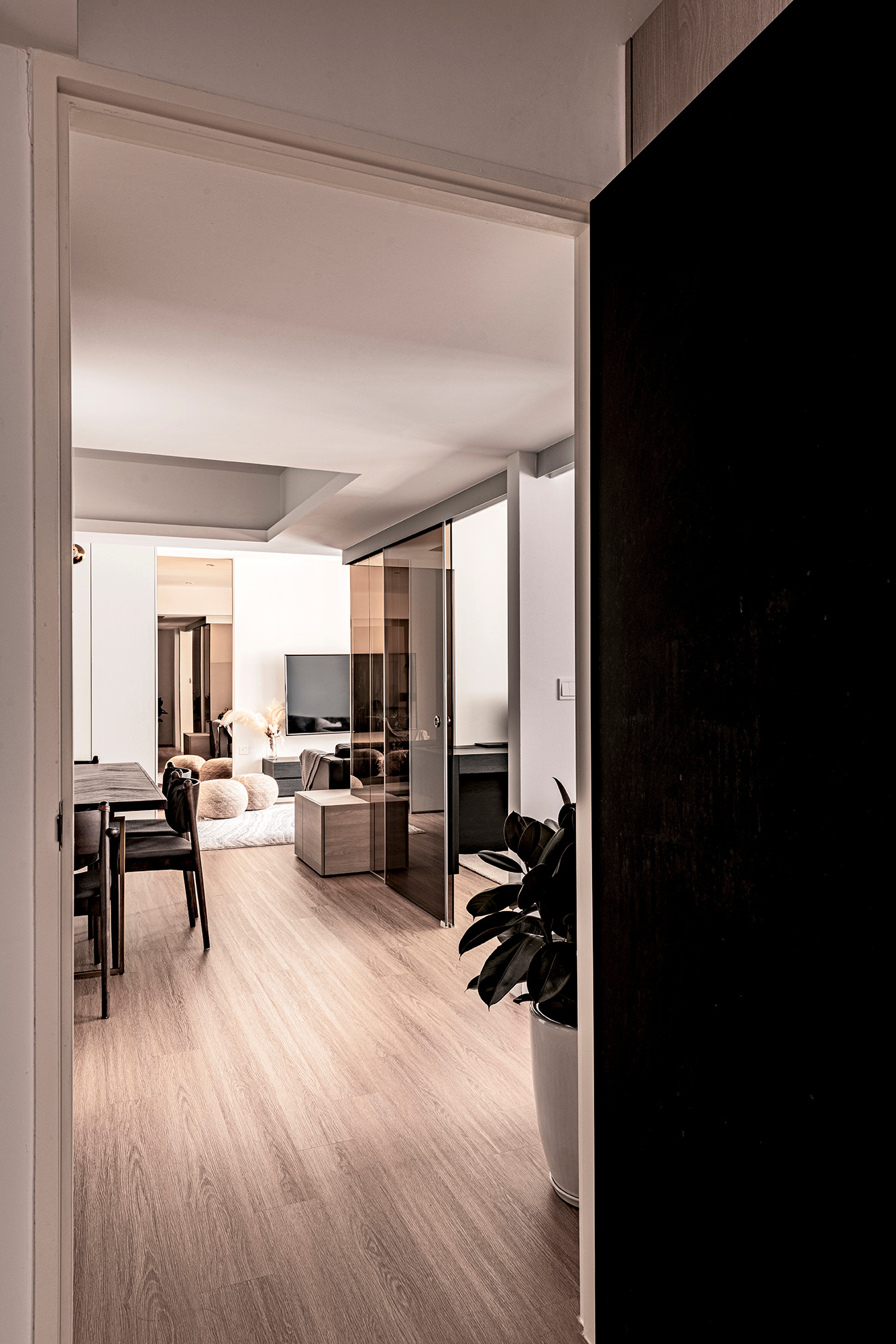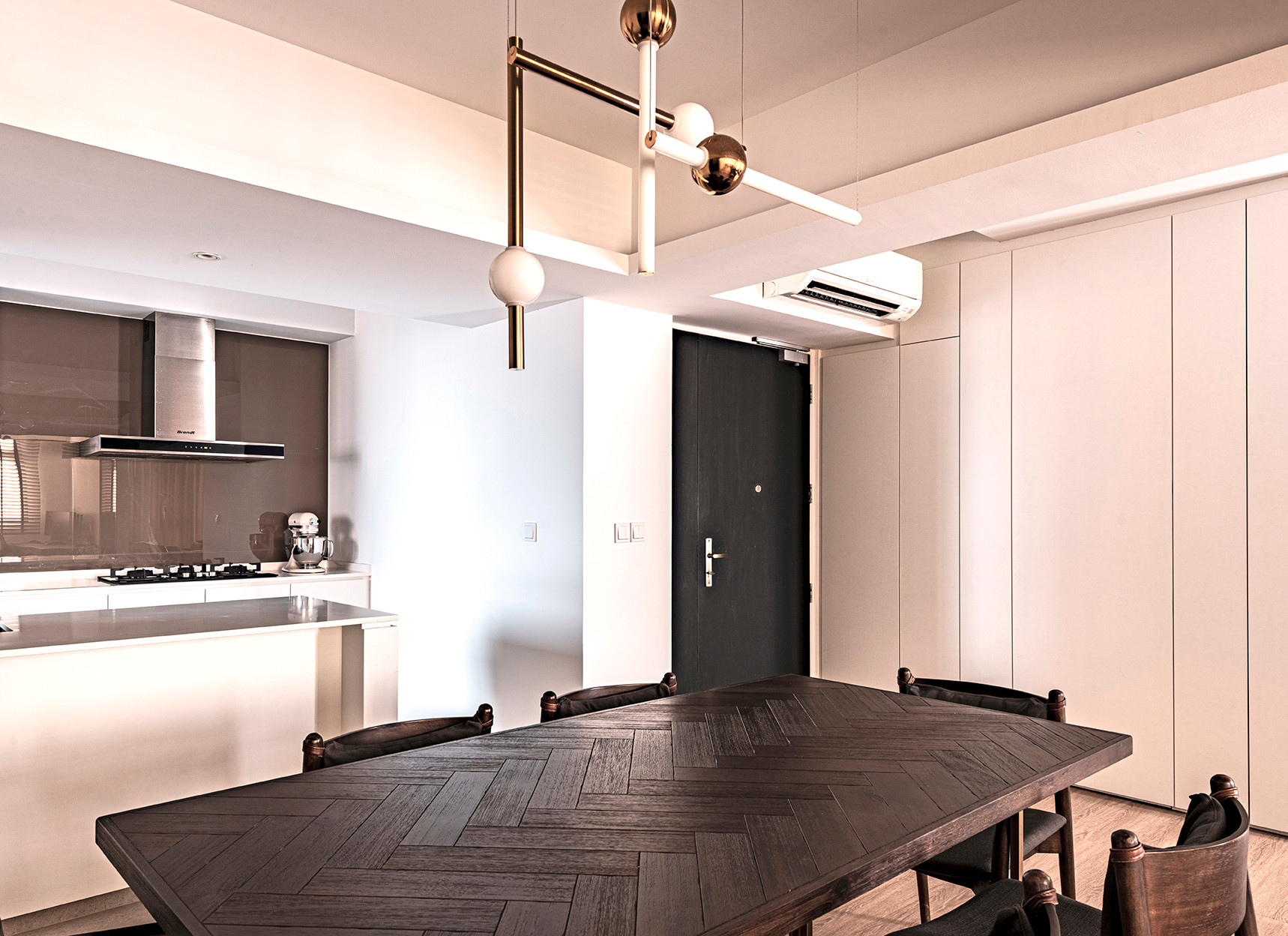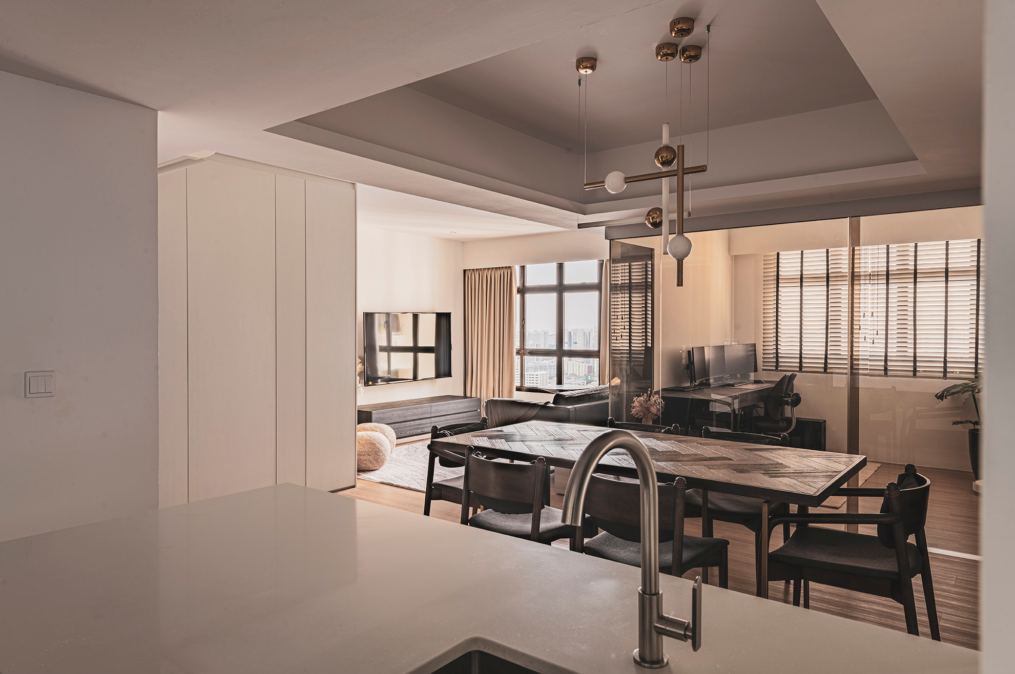 The owners wanted a bigger living space as they often host gatherings and hence we merged the kitchen, dining and living areas together to form an integrated space & also reduced the size of the study and child’s room to open up the dining area a bit more.