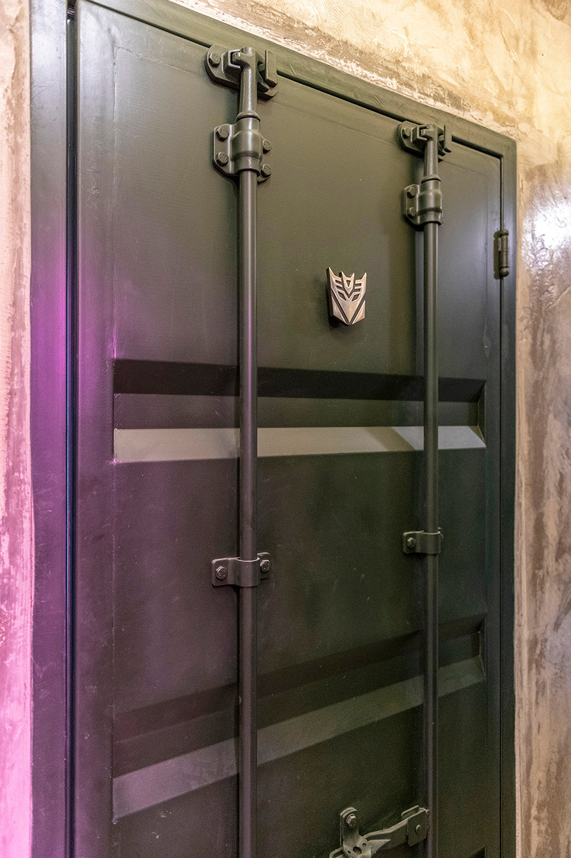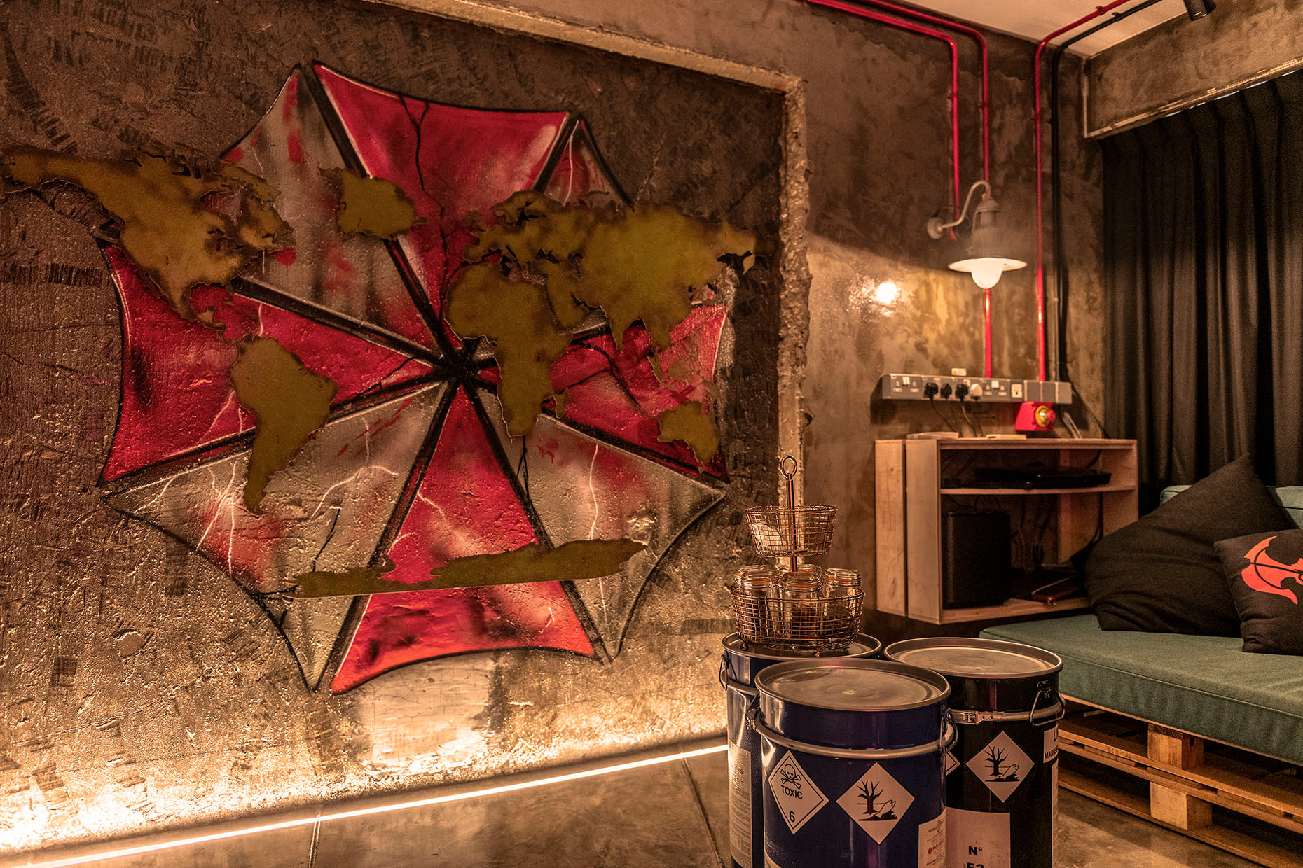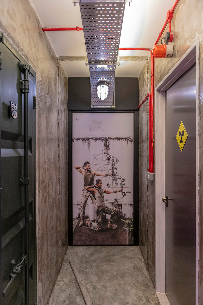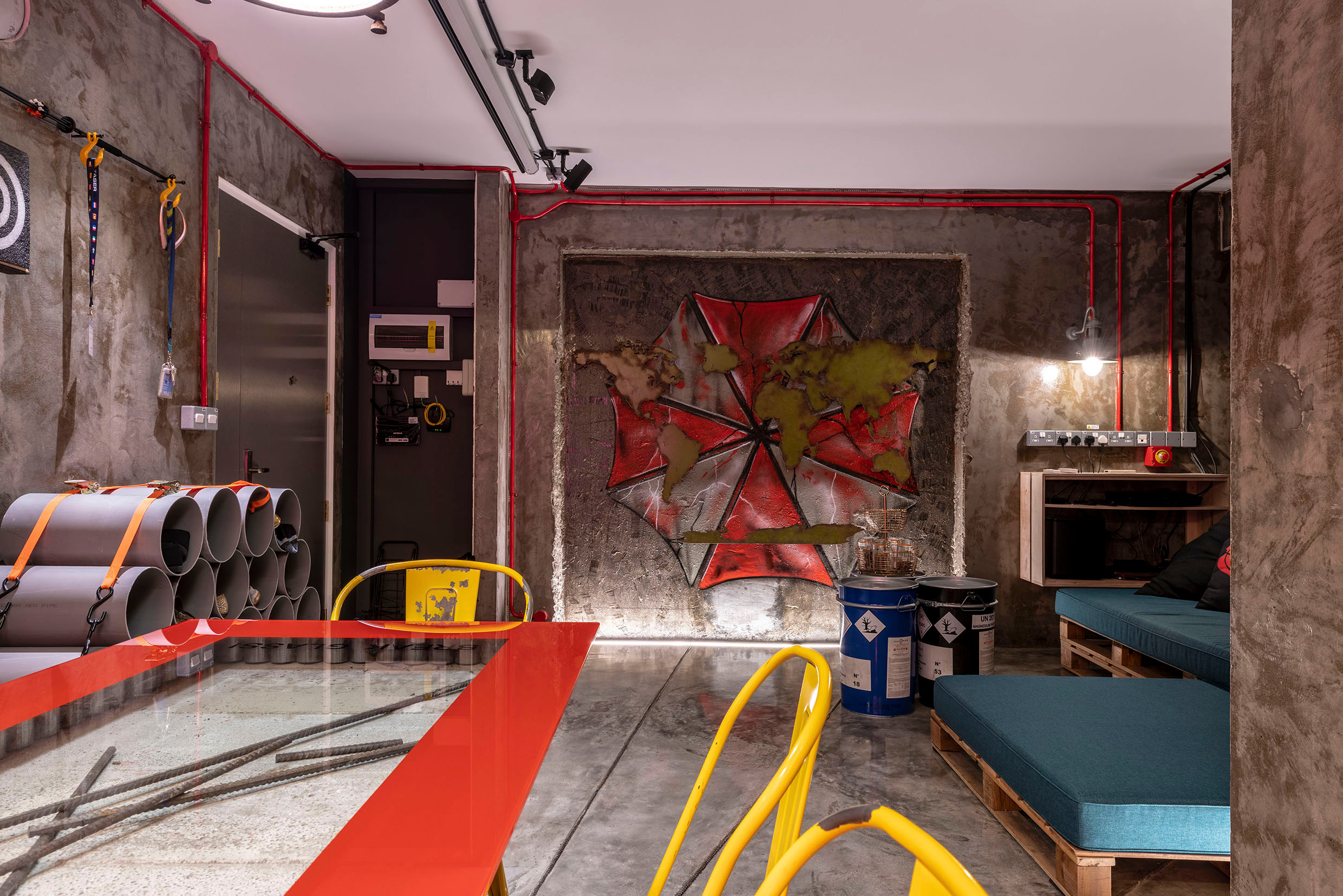 Unlike typical interiors that aim to hide structural or mechanical elements, this home showcases them as design features. The stainless-steel-clad front door, grey concrete walls and floors, and cinderblock accents immediately set a utilitarian, bunker-like tone. Exposed pipes, air-conditioning ducts, and oversized industrial switches further reinforce the post-apocalyptic narrative, giving the home a distinctive, grunge-inspired personality that is both edgy and immersive.