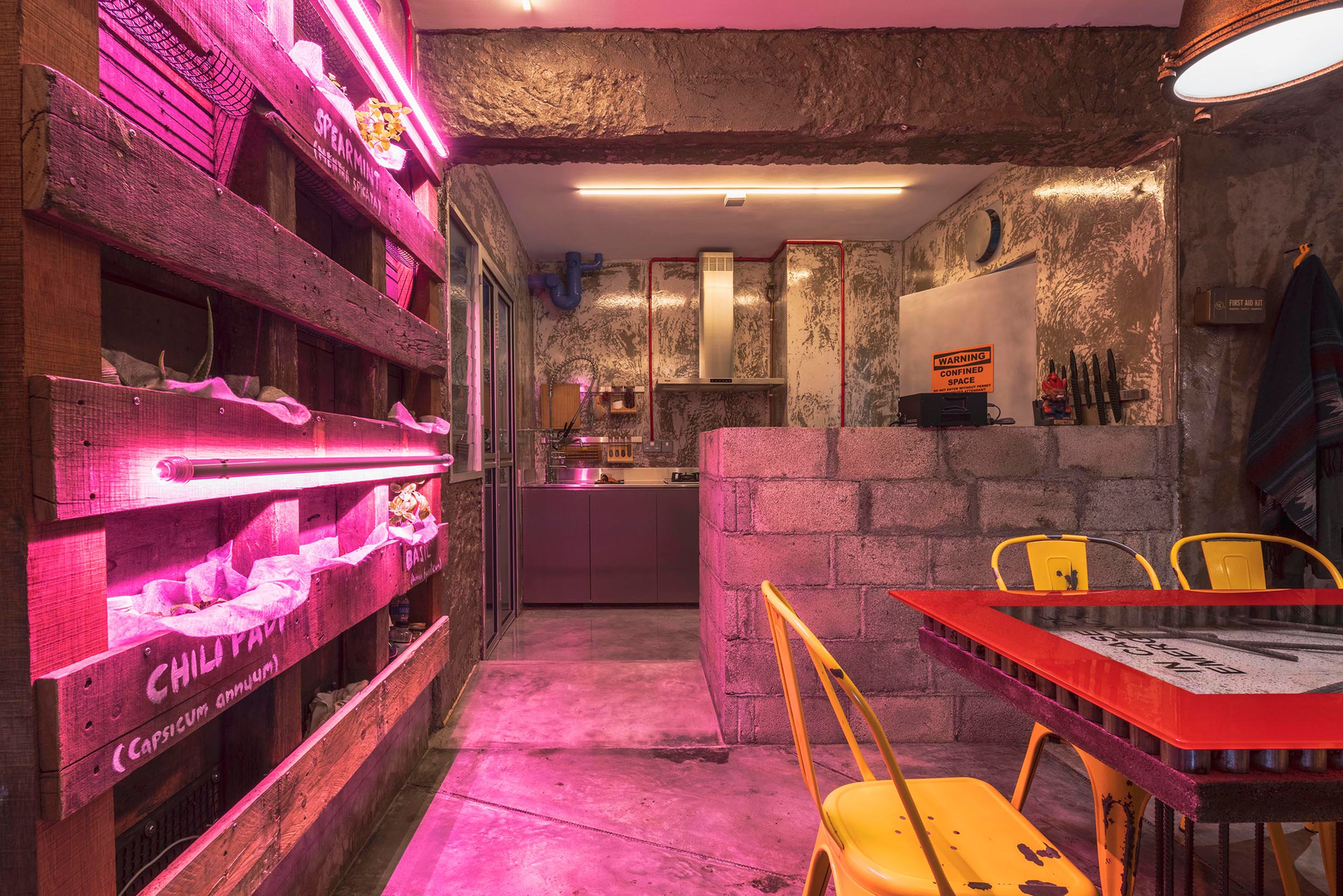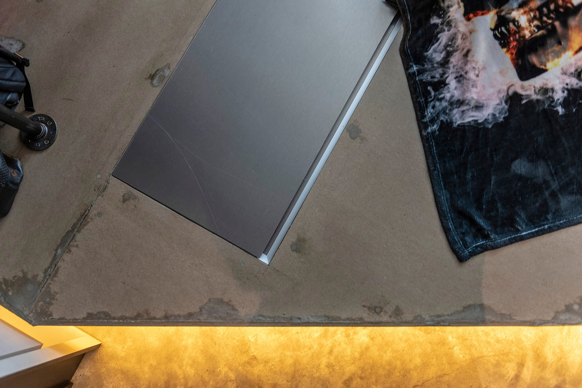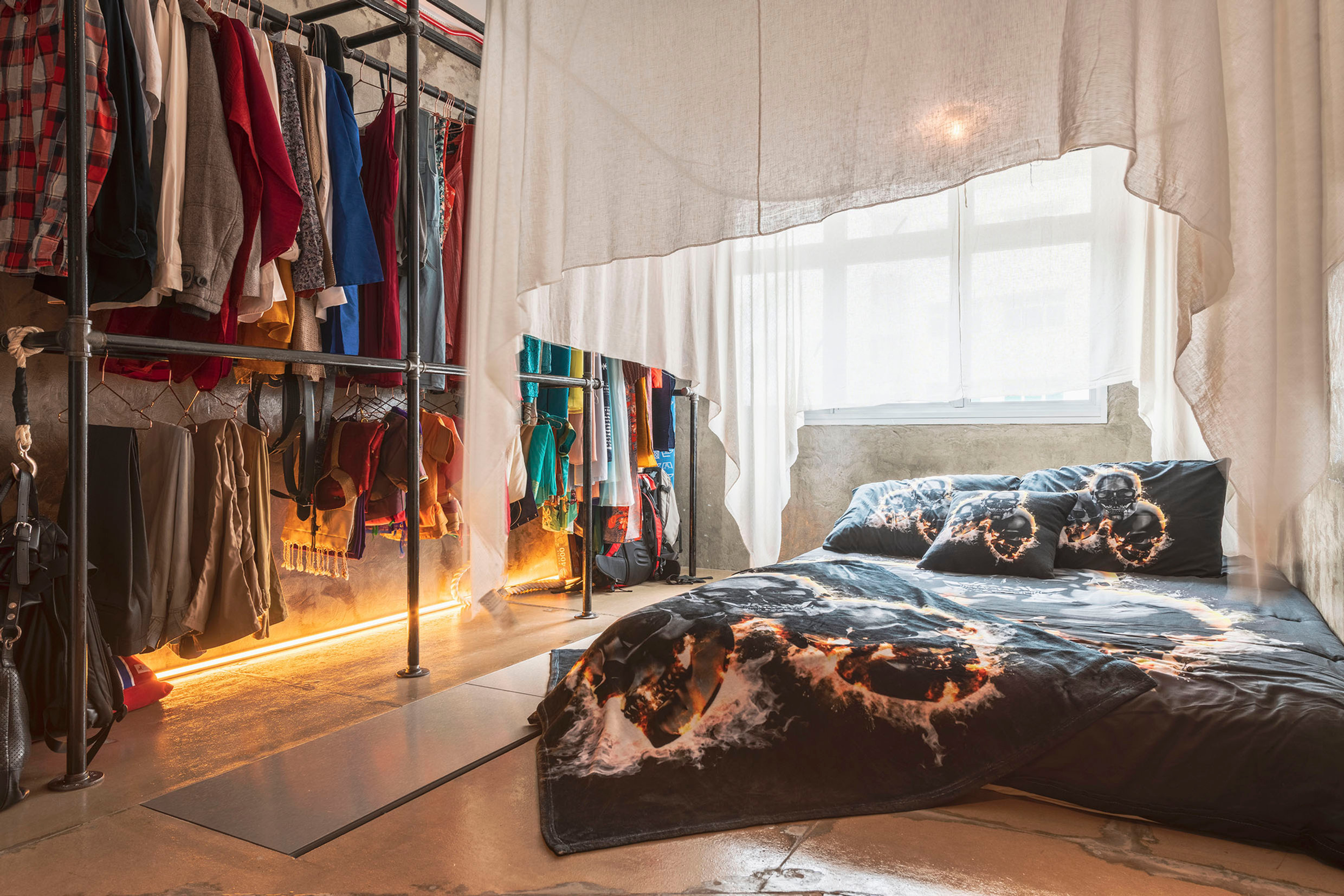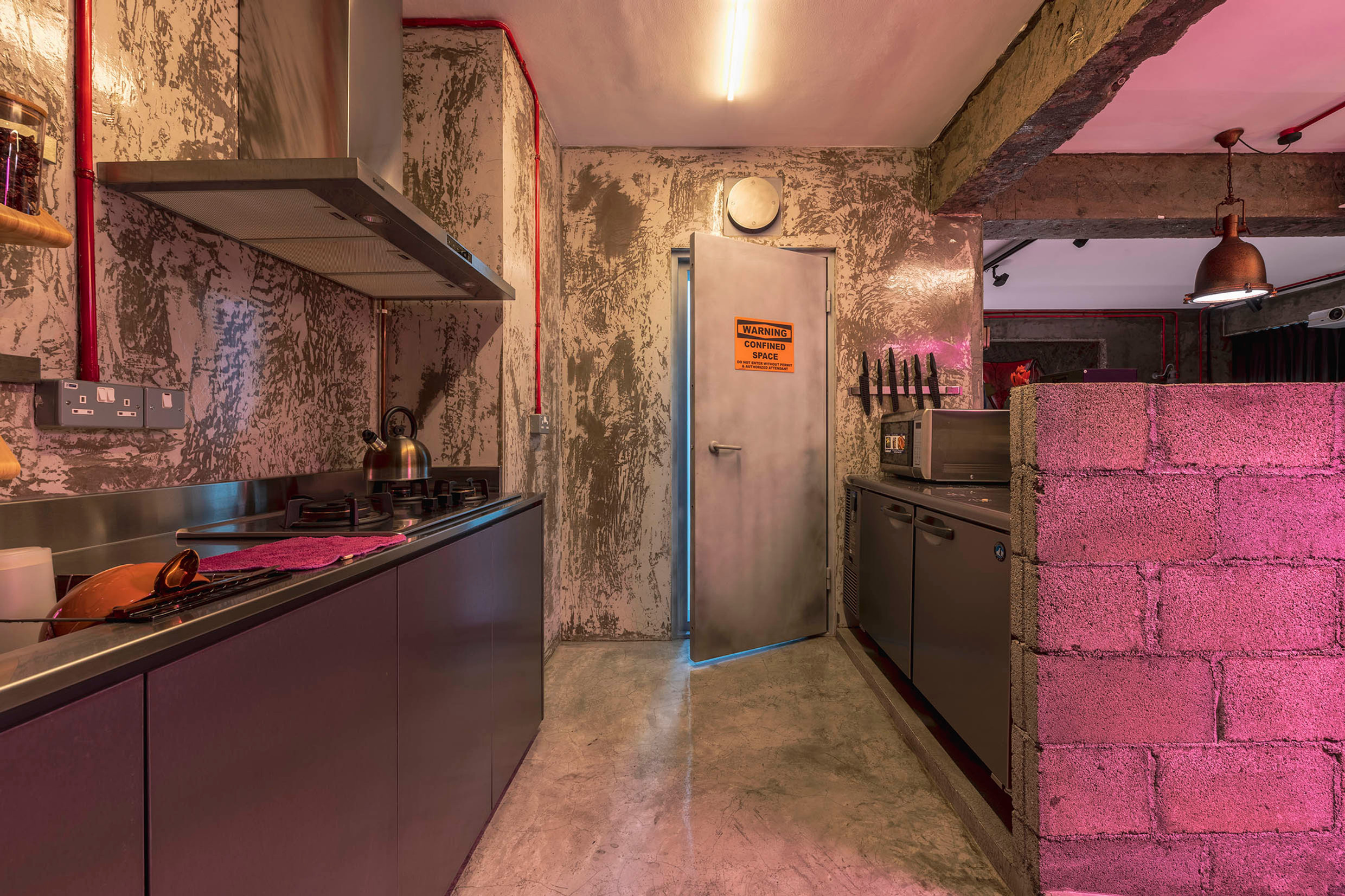 Unlike typical interiors that aim to hide structural or mechanical elements, this home showcases them as design features. The stainless-steel-clad front door, grey concrete walls and floors, and cinderblock accents immediately set a utilitarian, bunker-like tone. Exposed pipes, air-conditioning ducts, and oversized industrial switches further reinforce the post-apocalyptic narrative, giving the home a distinctive, grunge-inspired personality that is both edgy and immersive.