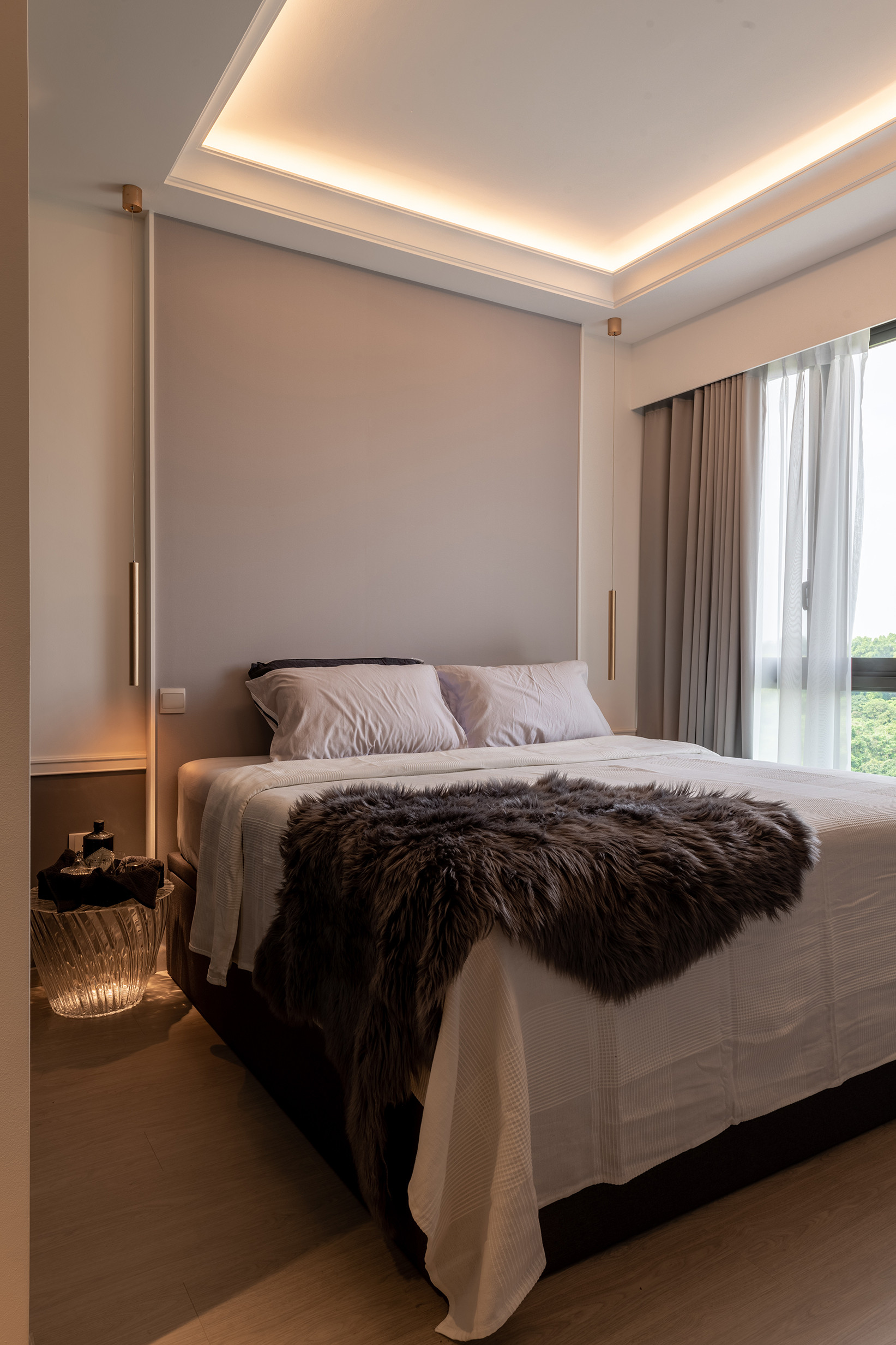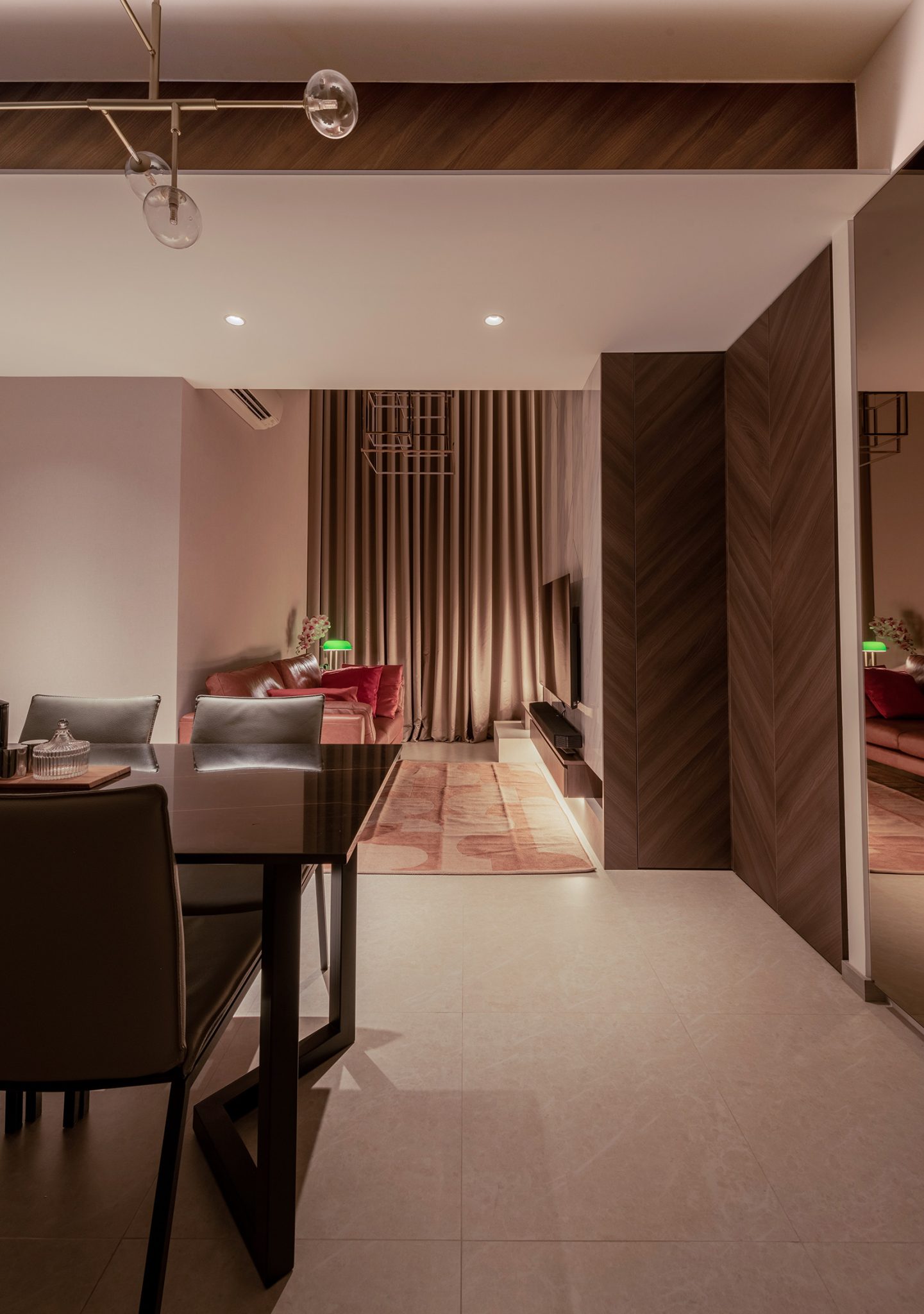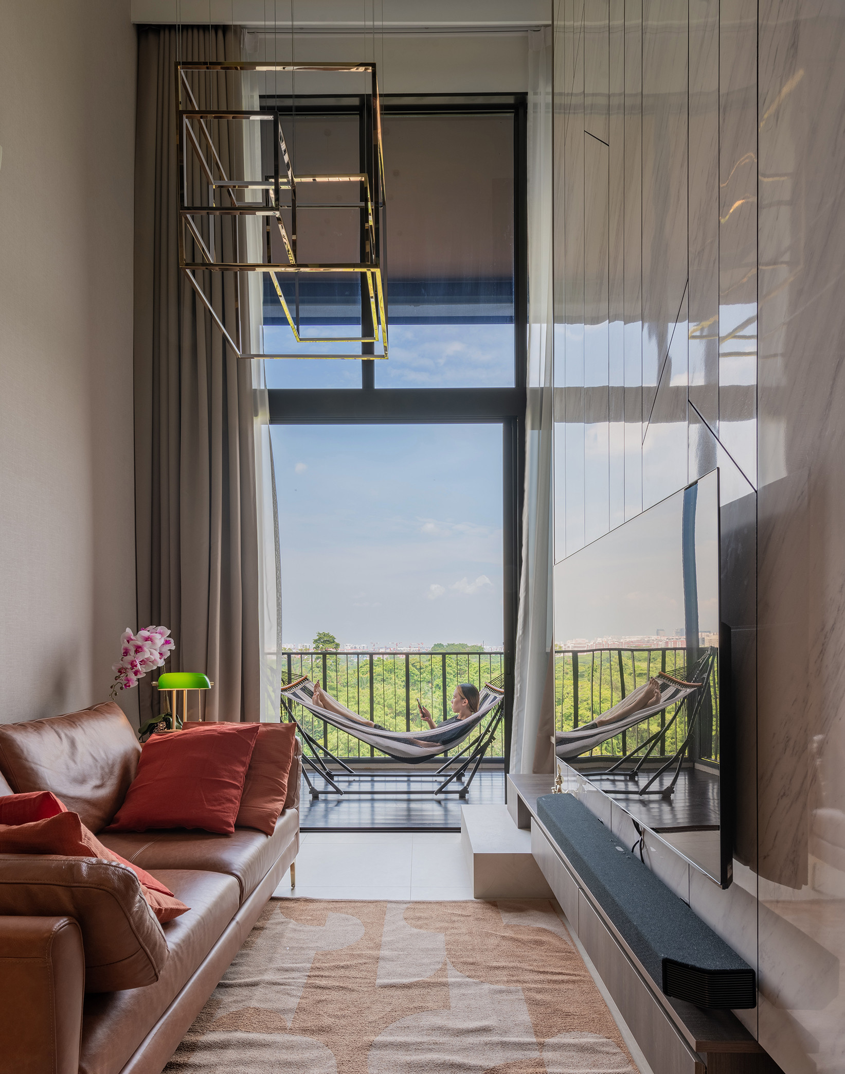 The living room of this unit boasts a 4.5m ceiling height and we installed a floor to ceiling curtain to visually enhance this impressive vertical space while it also serves as a divider for the living and balcony area. A conversational piece of artsy geometric pendent light hangs above and its proportion is carried off perfectly due to the high ceilings.