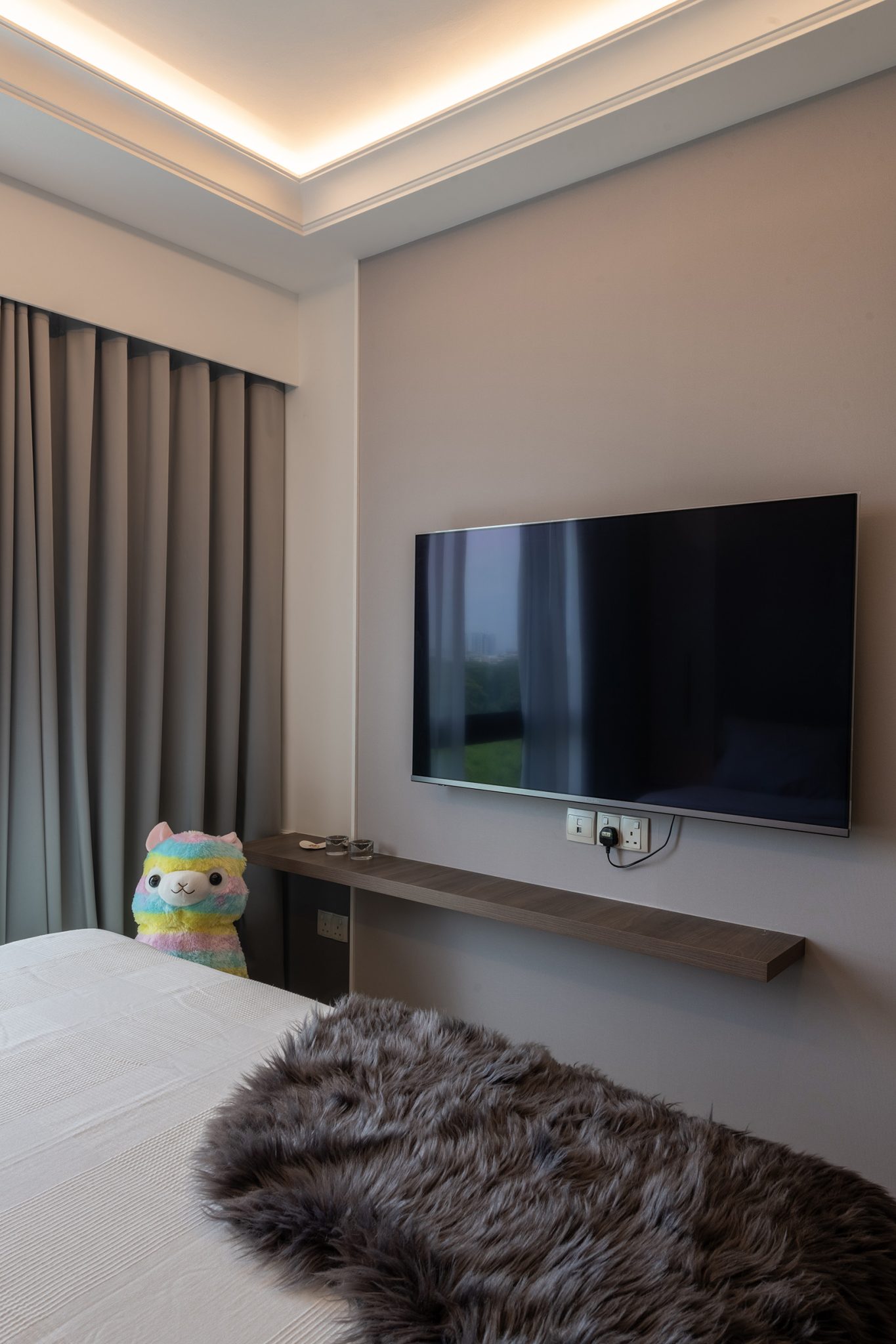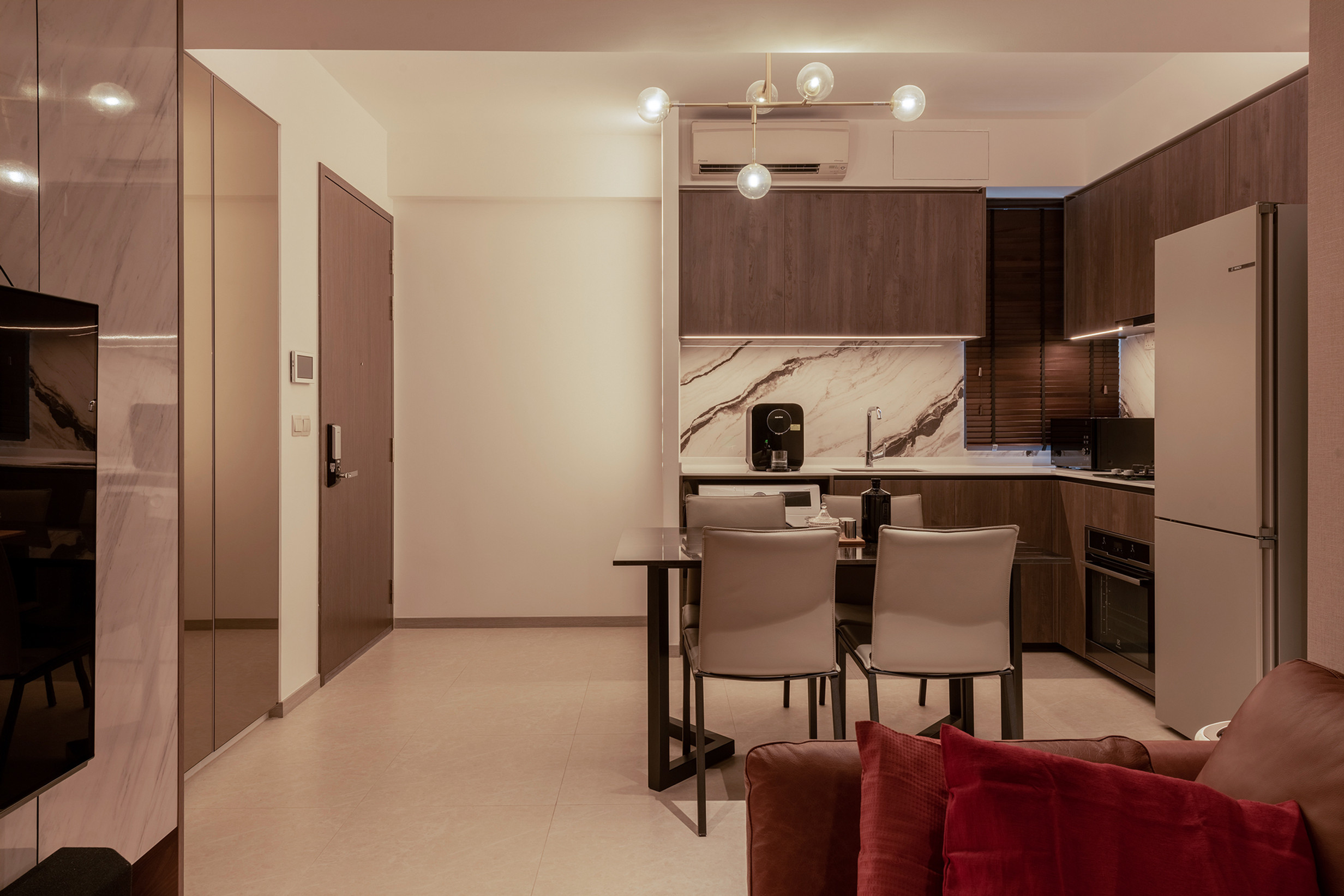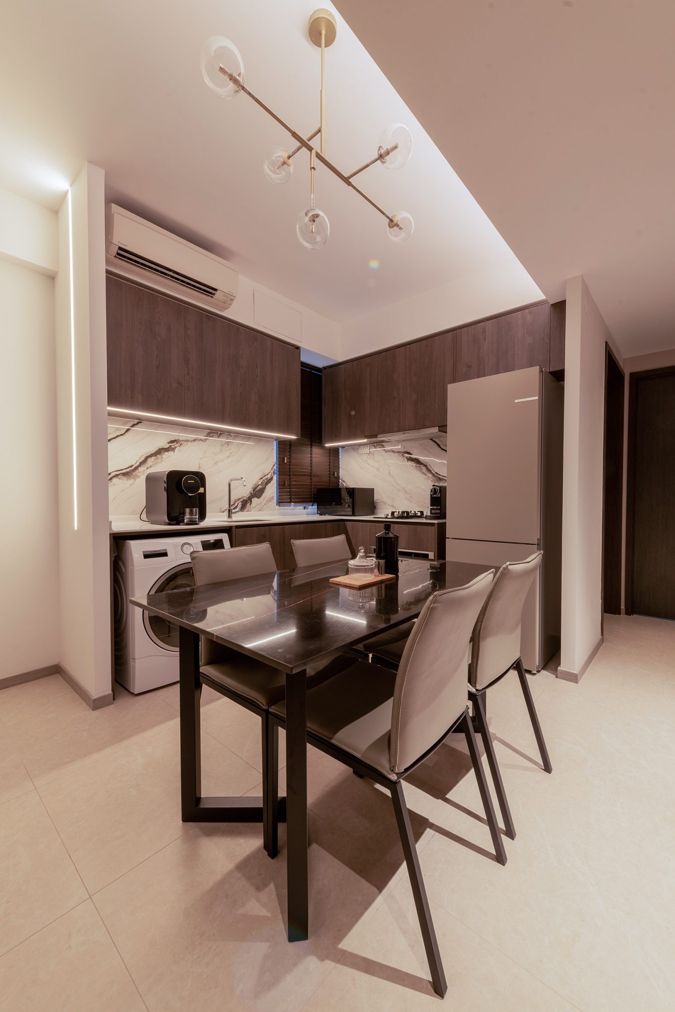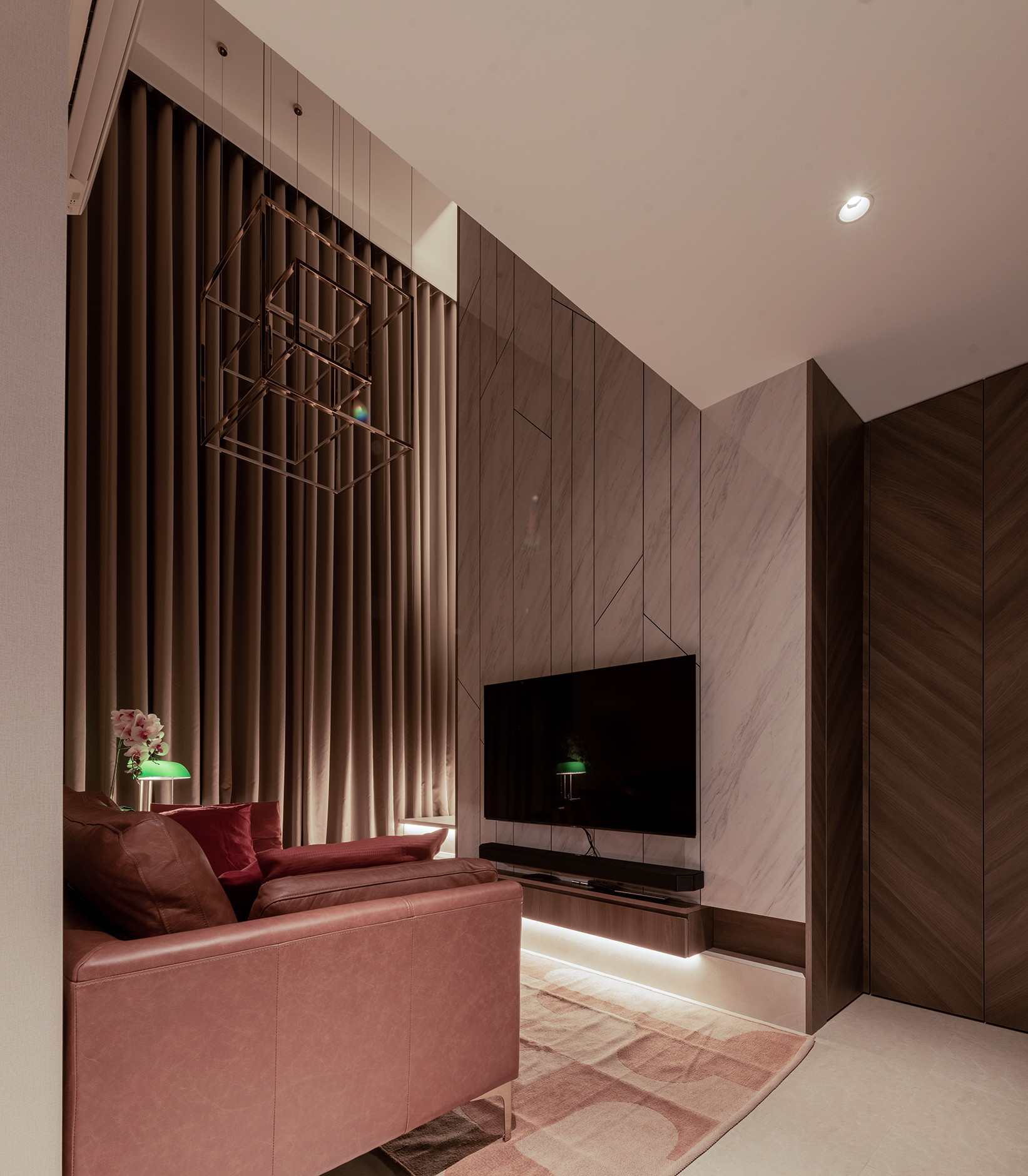The living room of this unit boasts a 4.5m ceiling height and we installed a floor to ceiling curtain to visually enhance this impressive vertical space while it also serves as a divider for the living and balcony area. A conversational piece of artsy geometric pendent light hangs above and its proportion is carried off perfectly due to the high ceilings.
