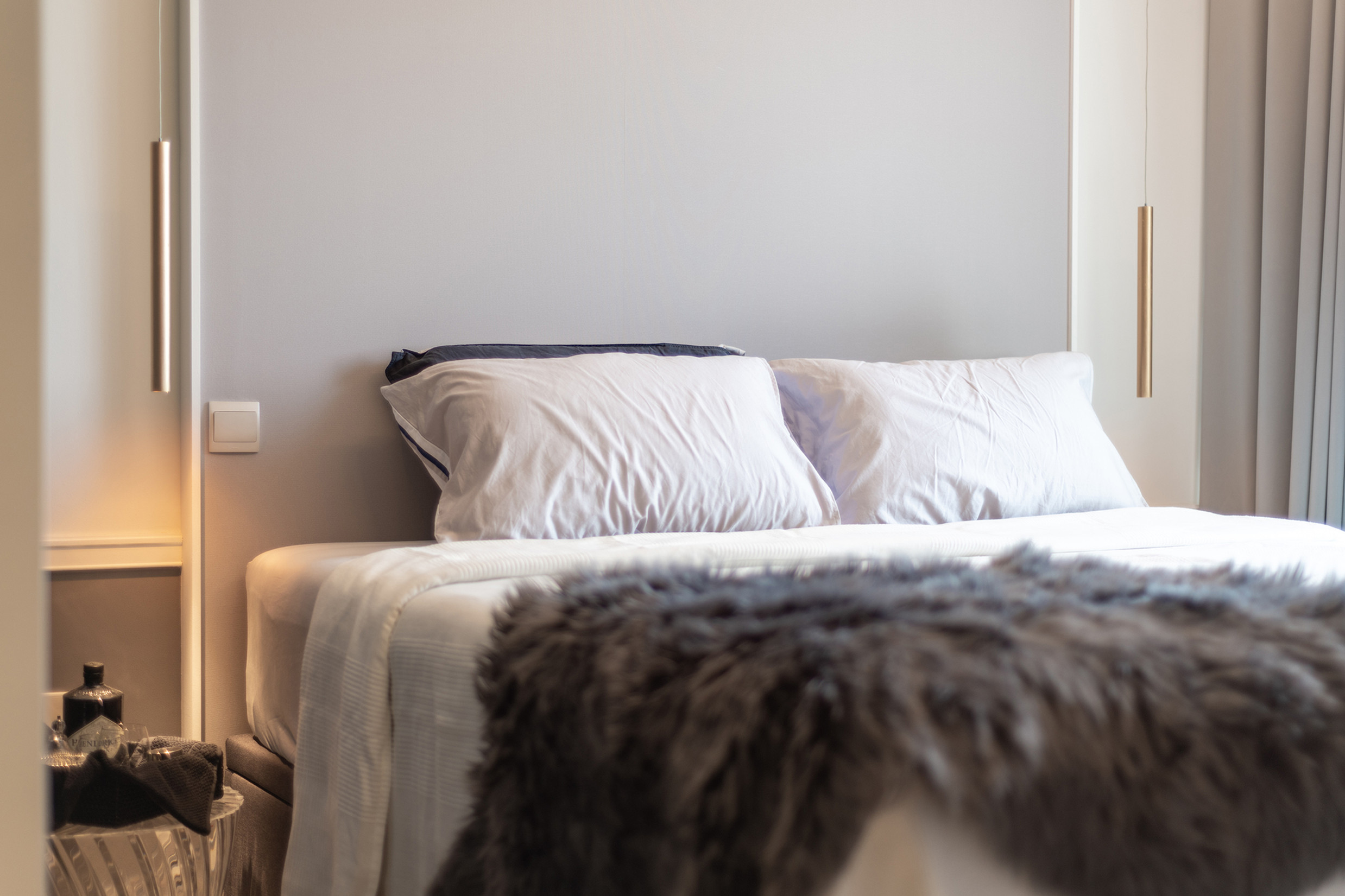 In the bedroom a mixture of dark and light colours are carefully chosen to match the existing carpentry of this new condo and to accompany these contrasting colours, a cement colour was added to blend them together.
