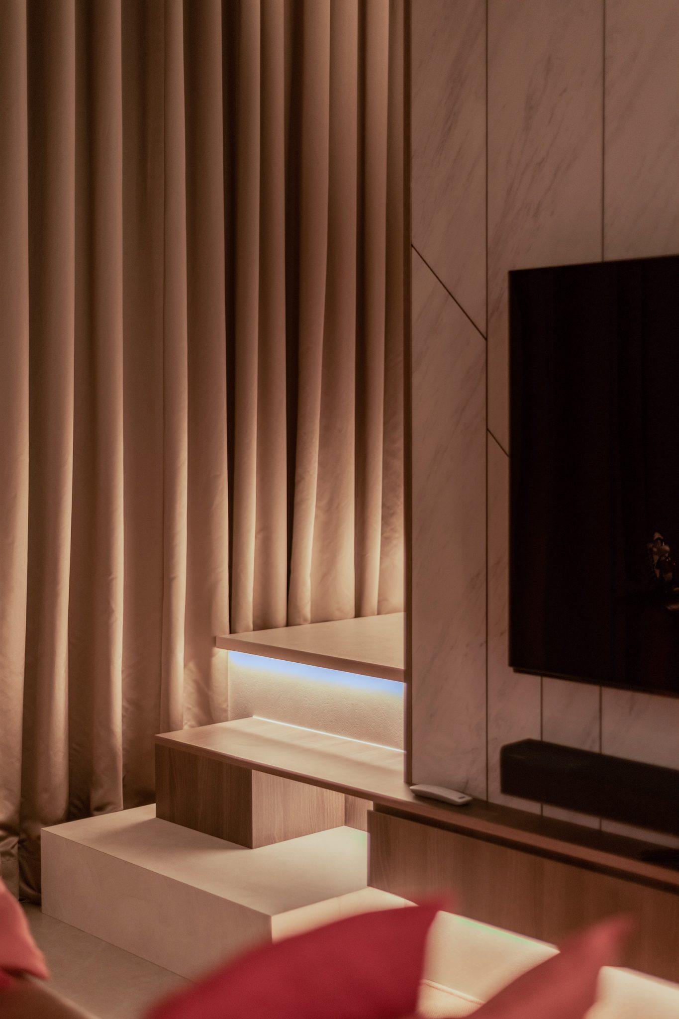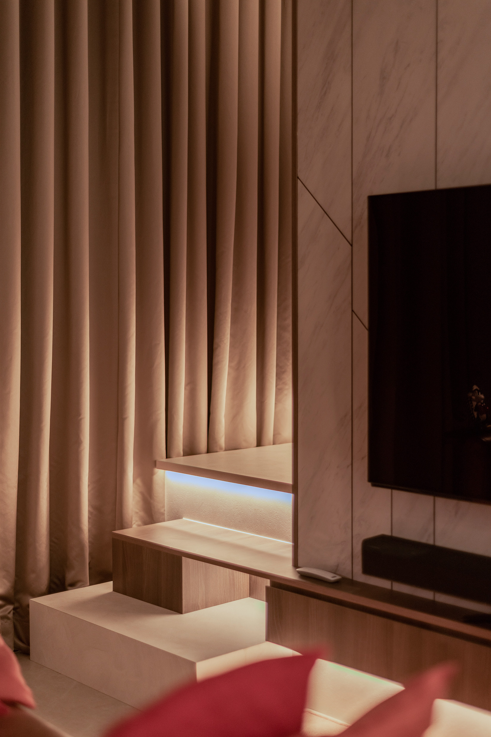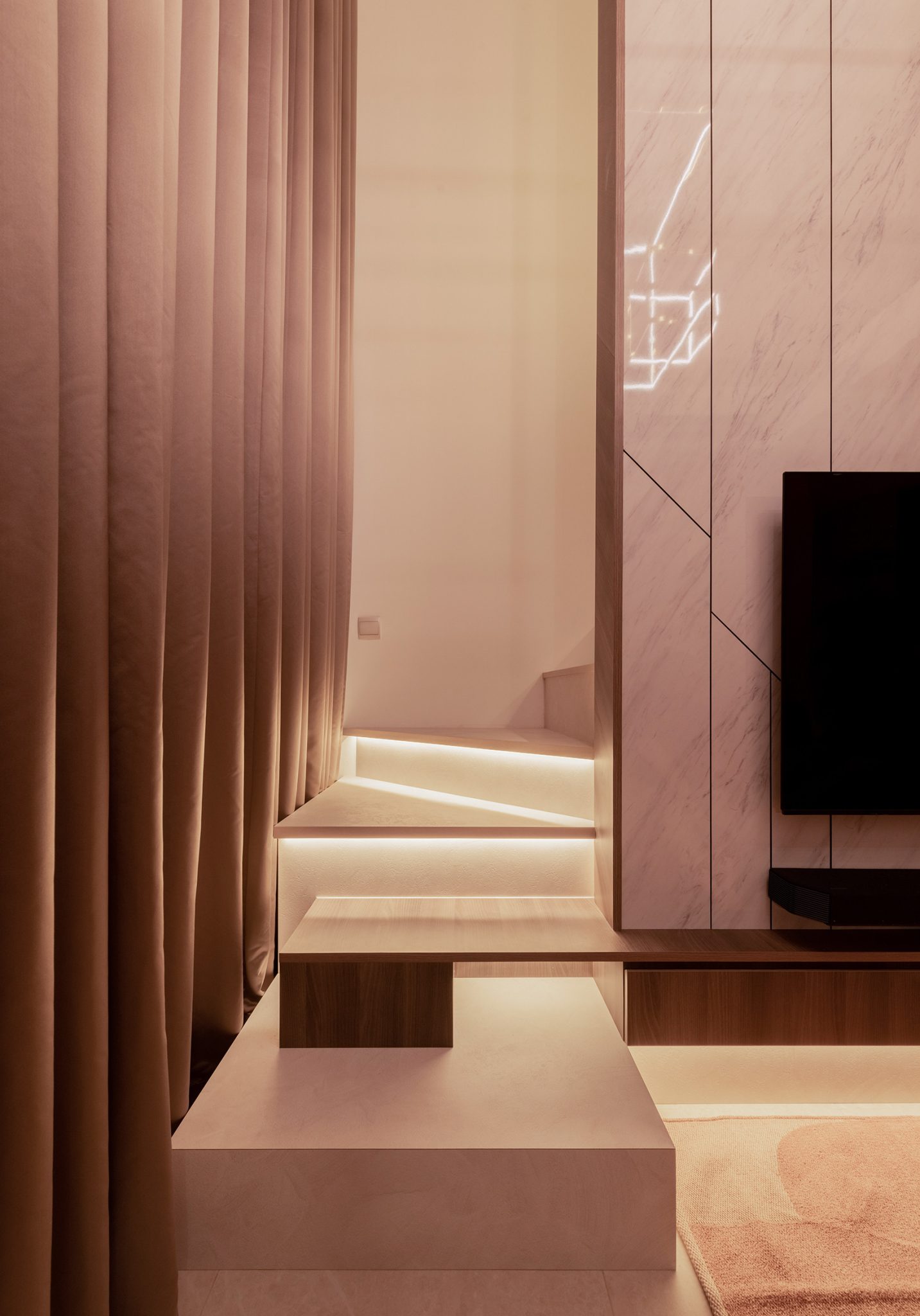 Opposite the sofa, there is a white marble laminate feature wall that extends all the way up to the ceiling and we built a staircase which consists of rectangular and triangle shapes going up the side of this wall to the mezzanine and extended the TV console as one of the steps to make this feature artistically asymmetric.