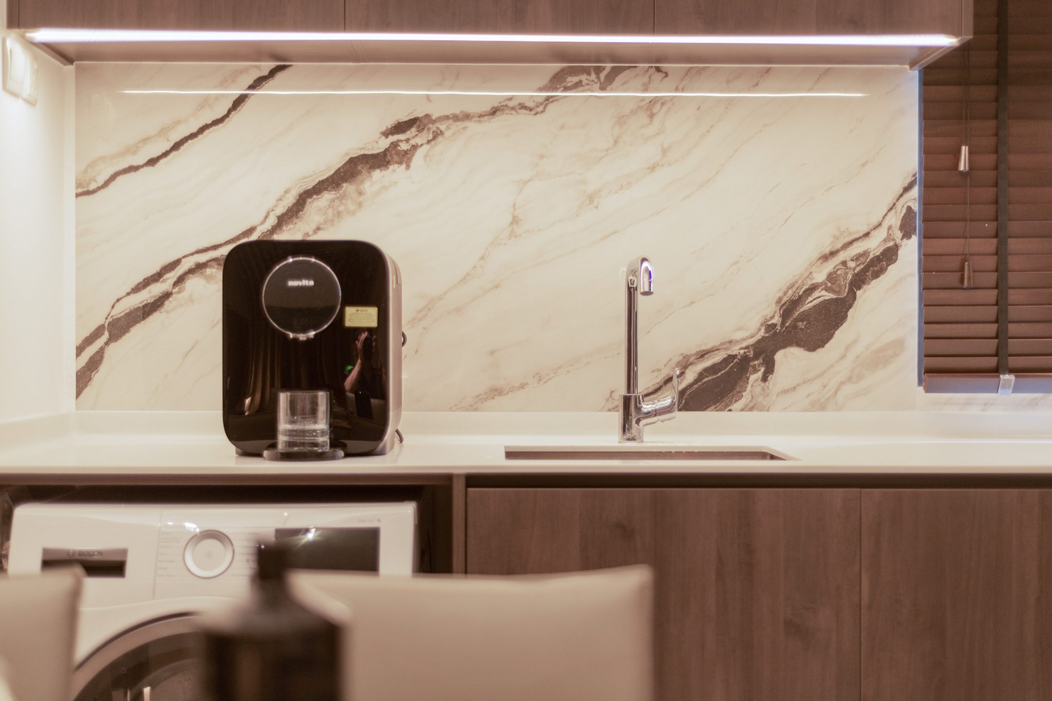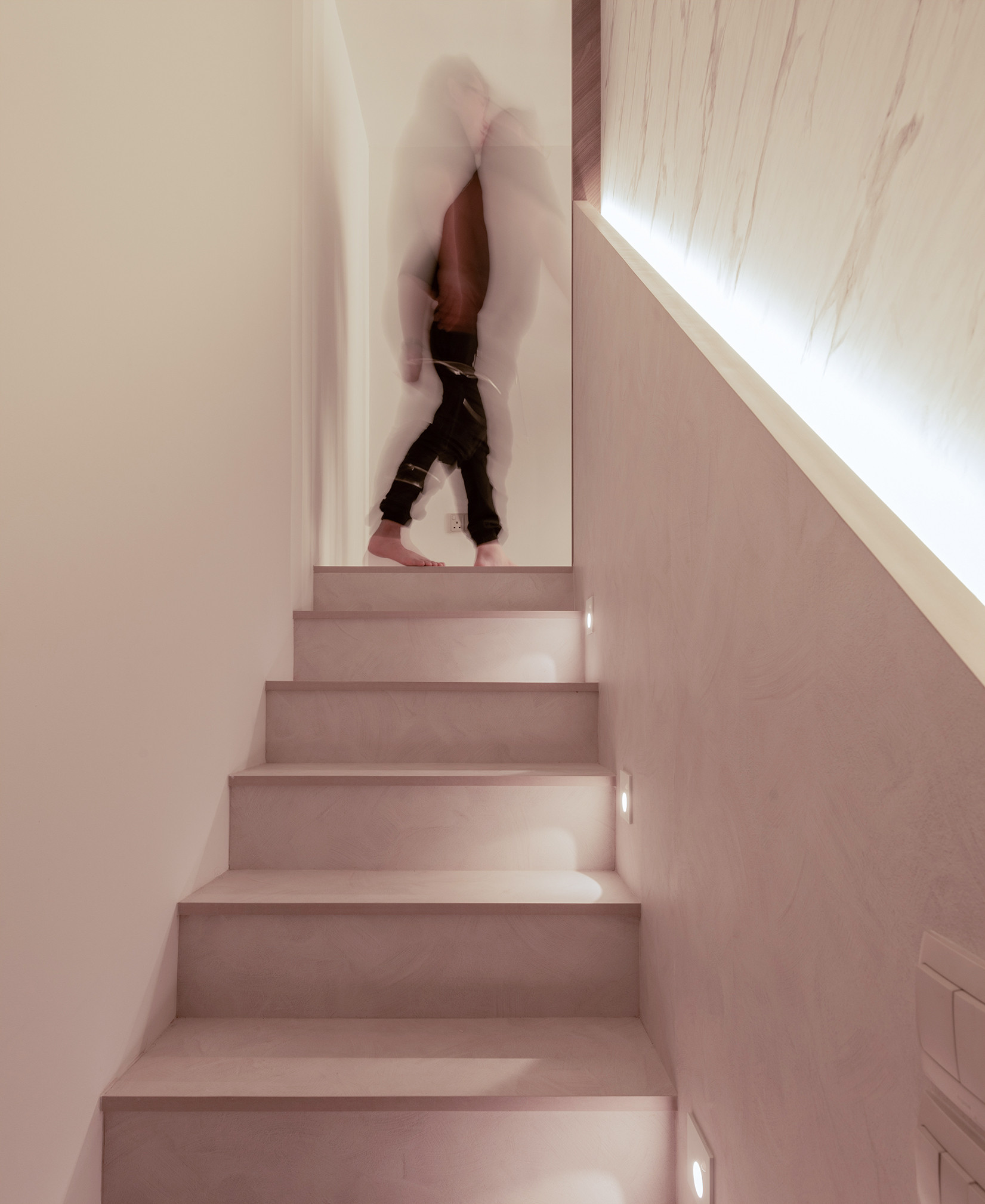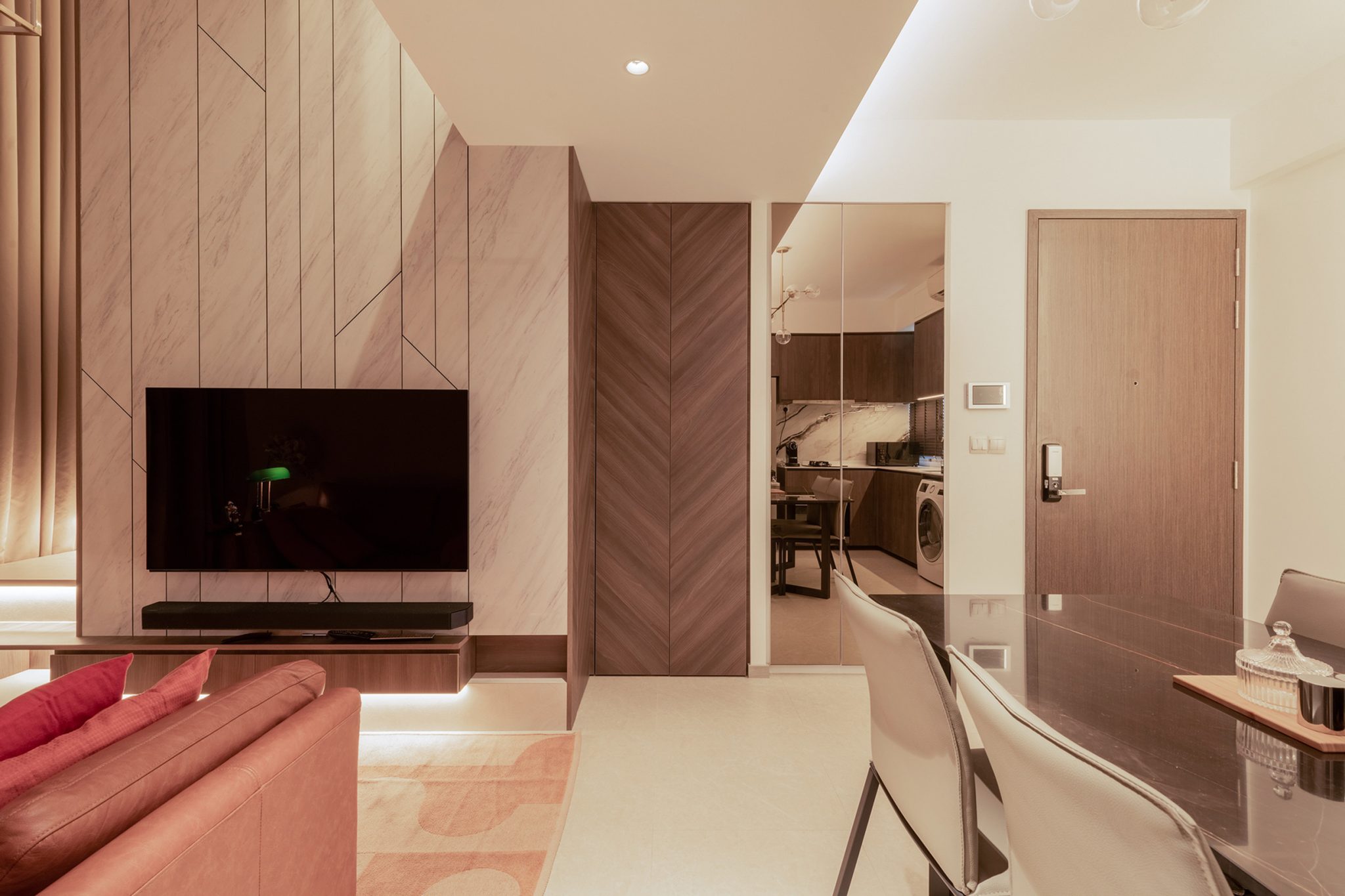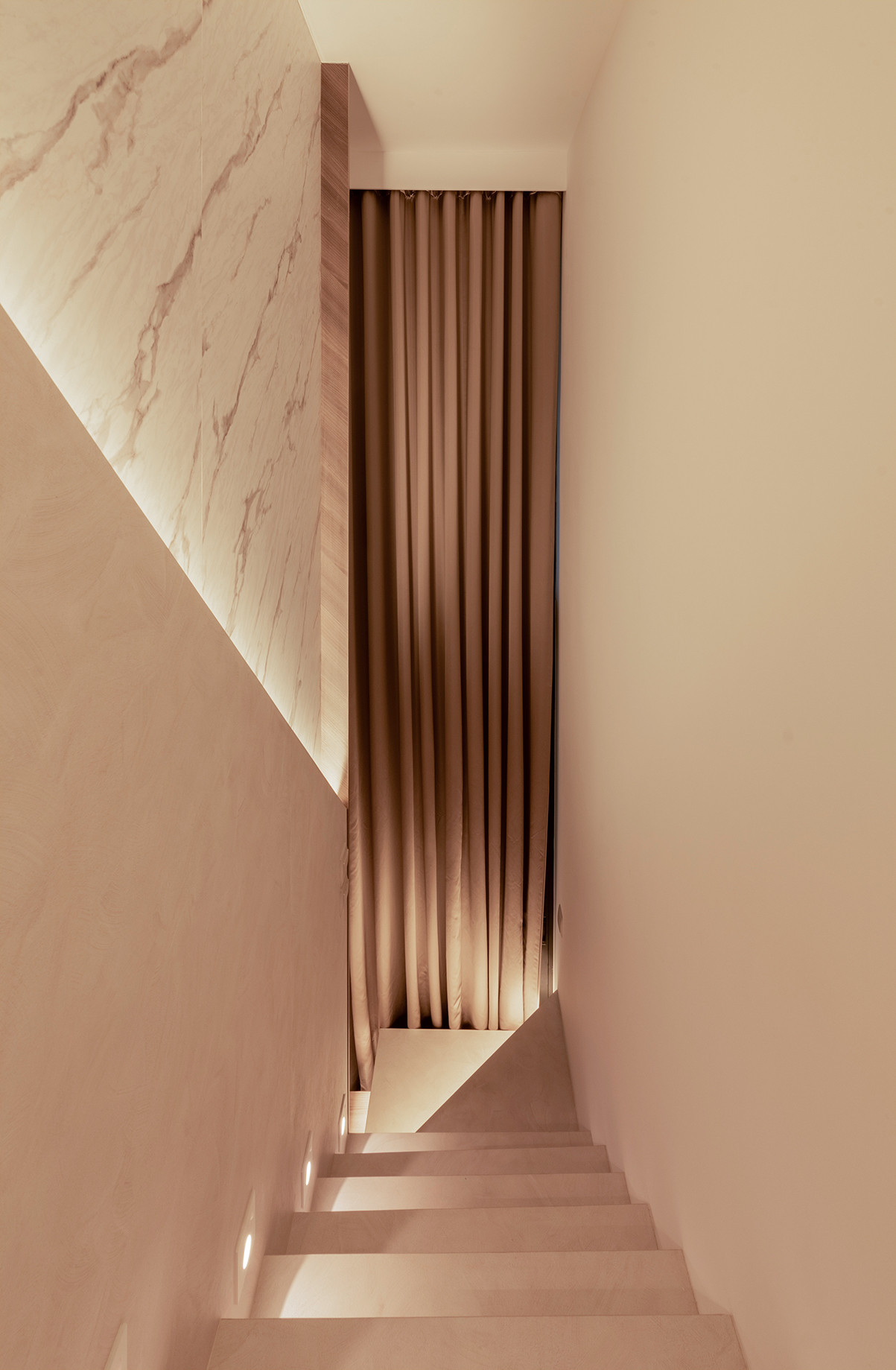 Opposite the sofa, there is a white marble laminate feature wall that extends all the way up to the ceiling and we built a staircase which consists of rectangular and triangle shapes going up the side of this wall to the mezzanine and extended the TV console as one of the steps to make this feature artistically asymmetric.