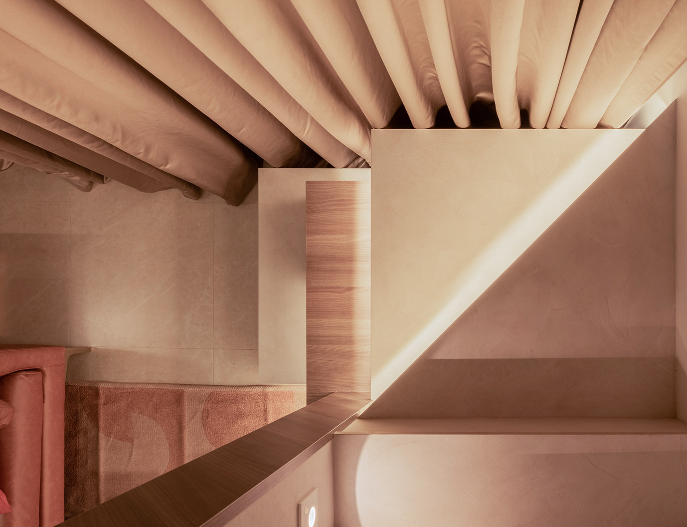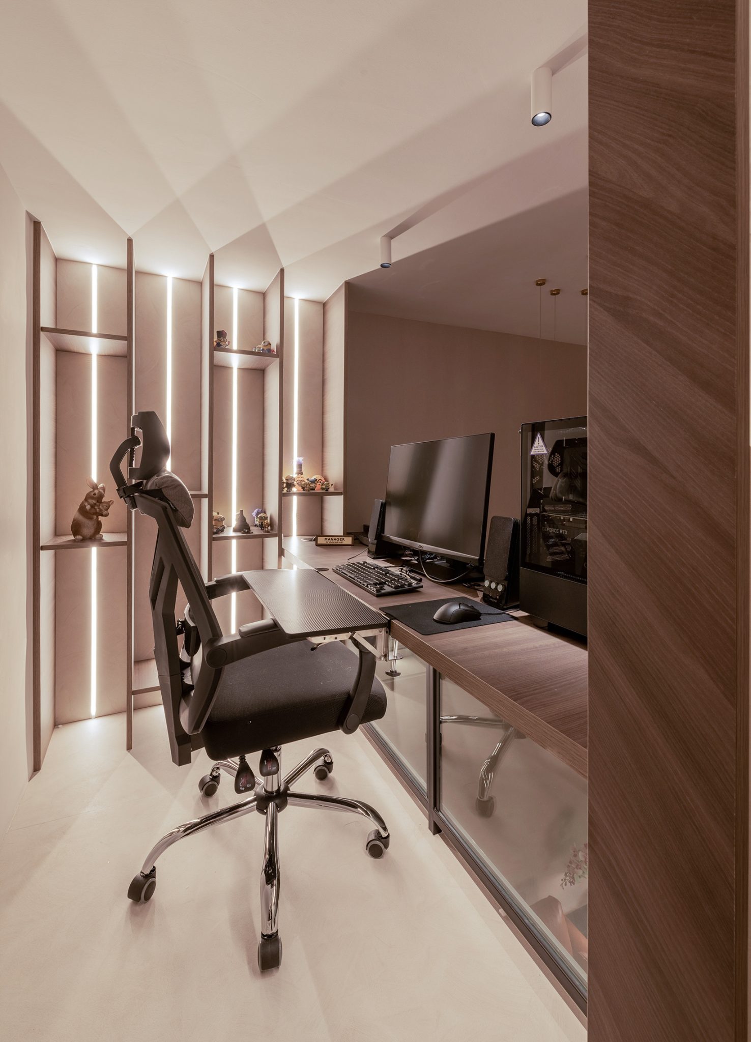 The mezzanine is the study/gaming room and its tabletop is overhanging to increase the space of the mezzanine as well as to give a good clean view to anyone looking upon the living area.