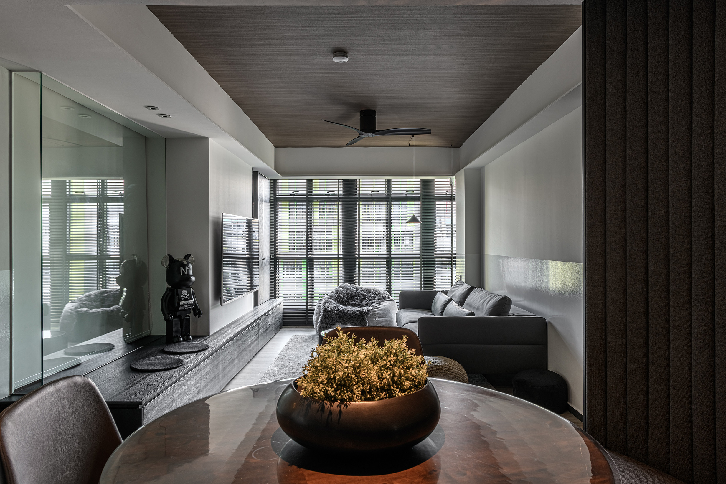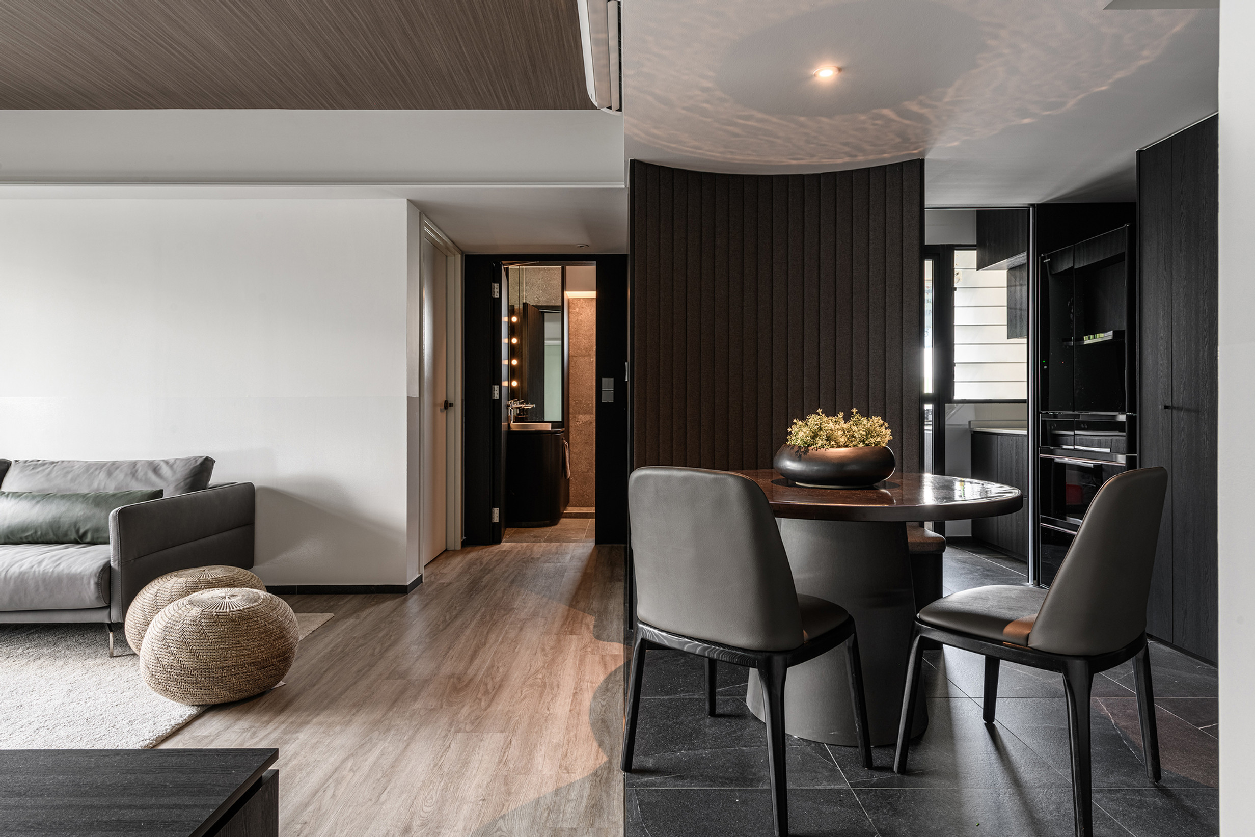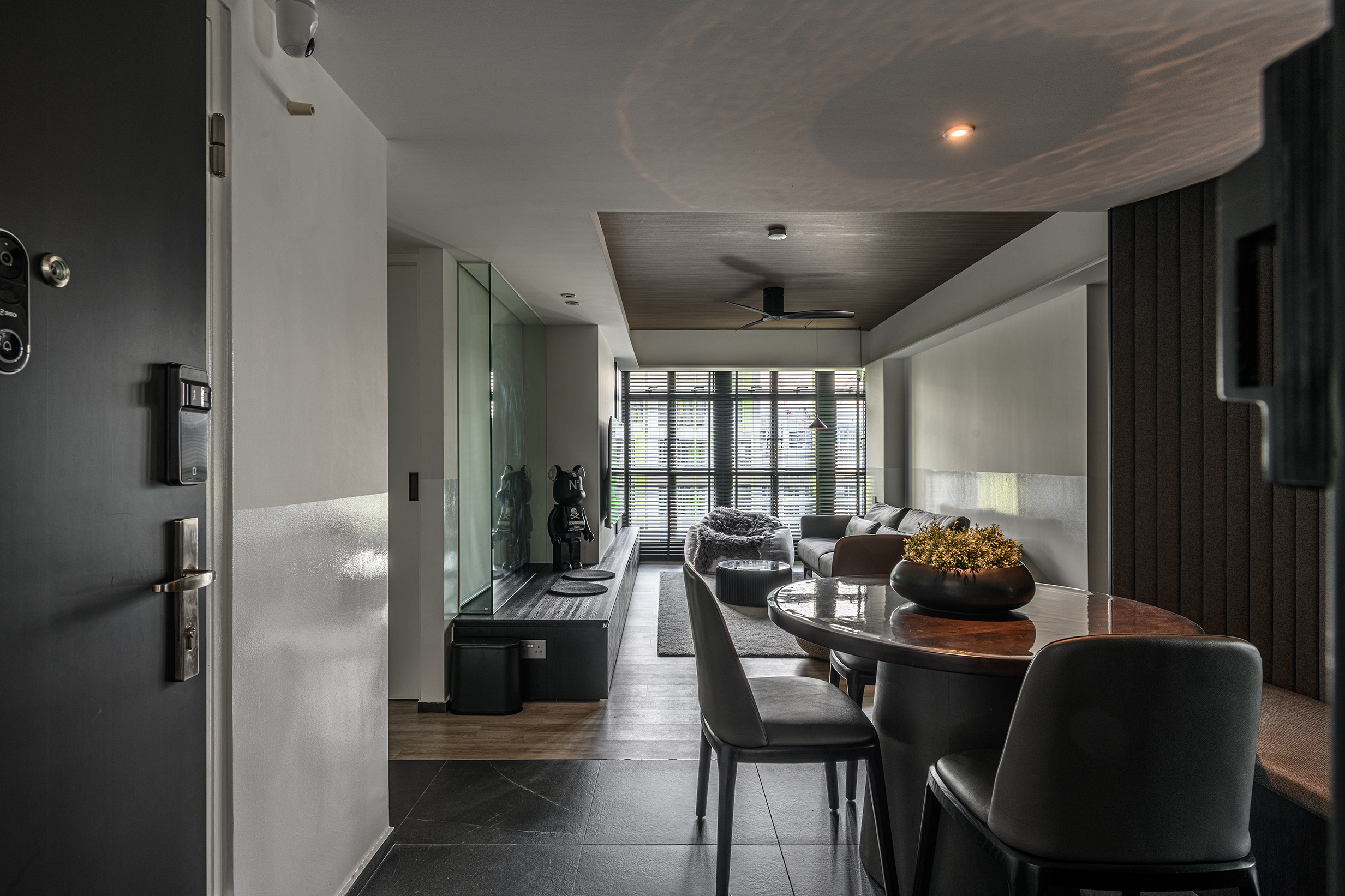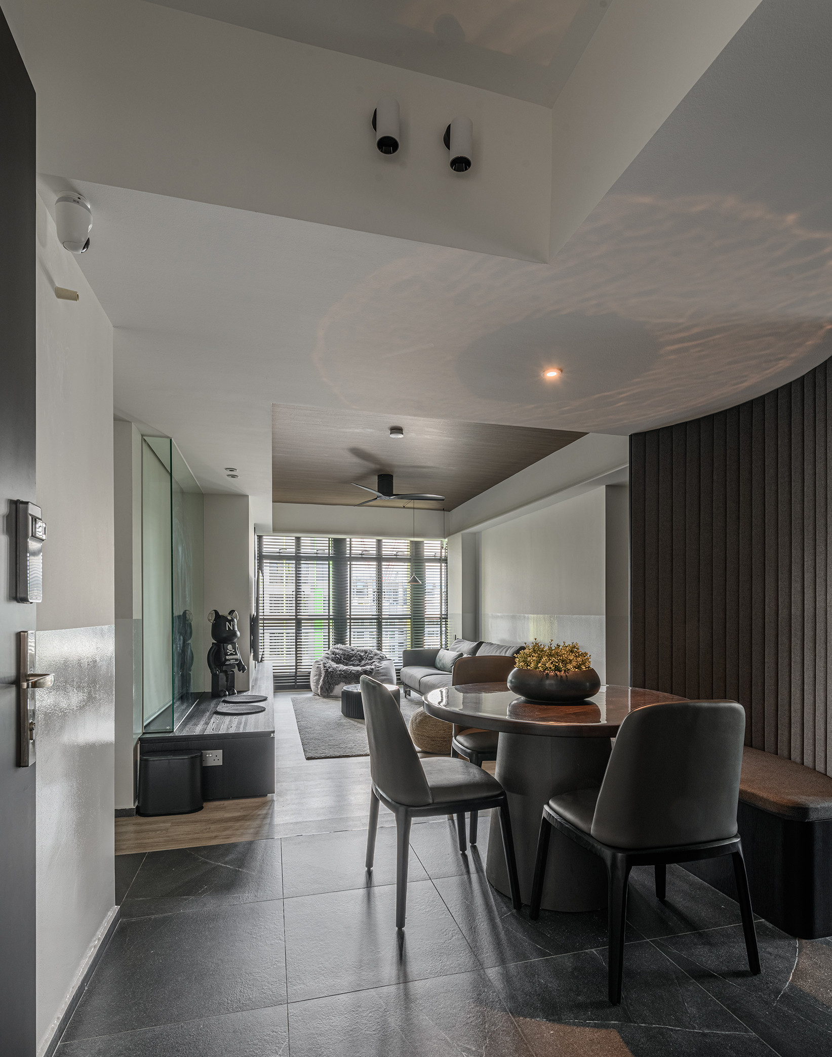 To fully open up the apartment, we installed full length blinds which instantly elongates the space and is one of the first things you notice about the proportion of the space once you enter. A carefully crafted ceiling with precise cuts and lines maps out the living spaces with the highlight being a curved portion which becomes the dining area.