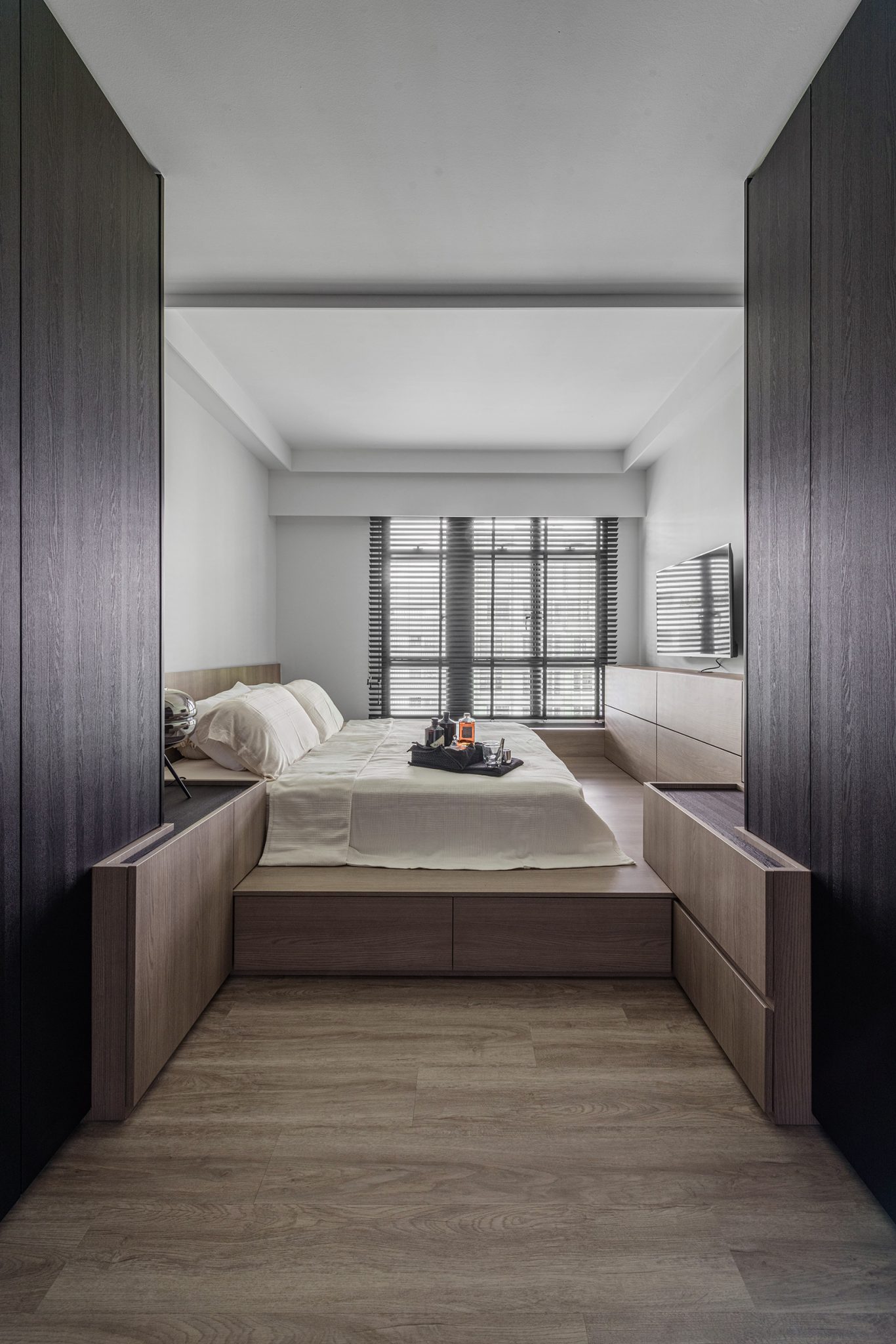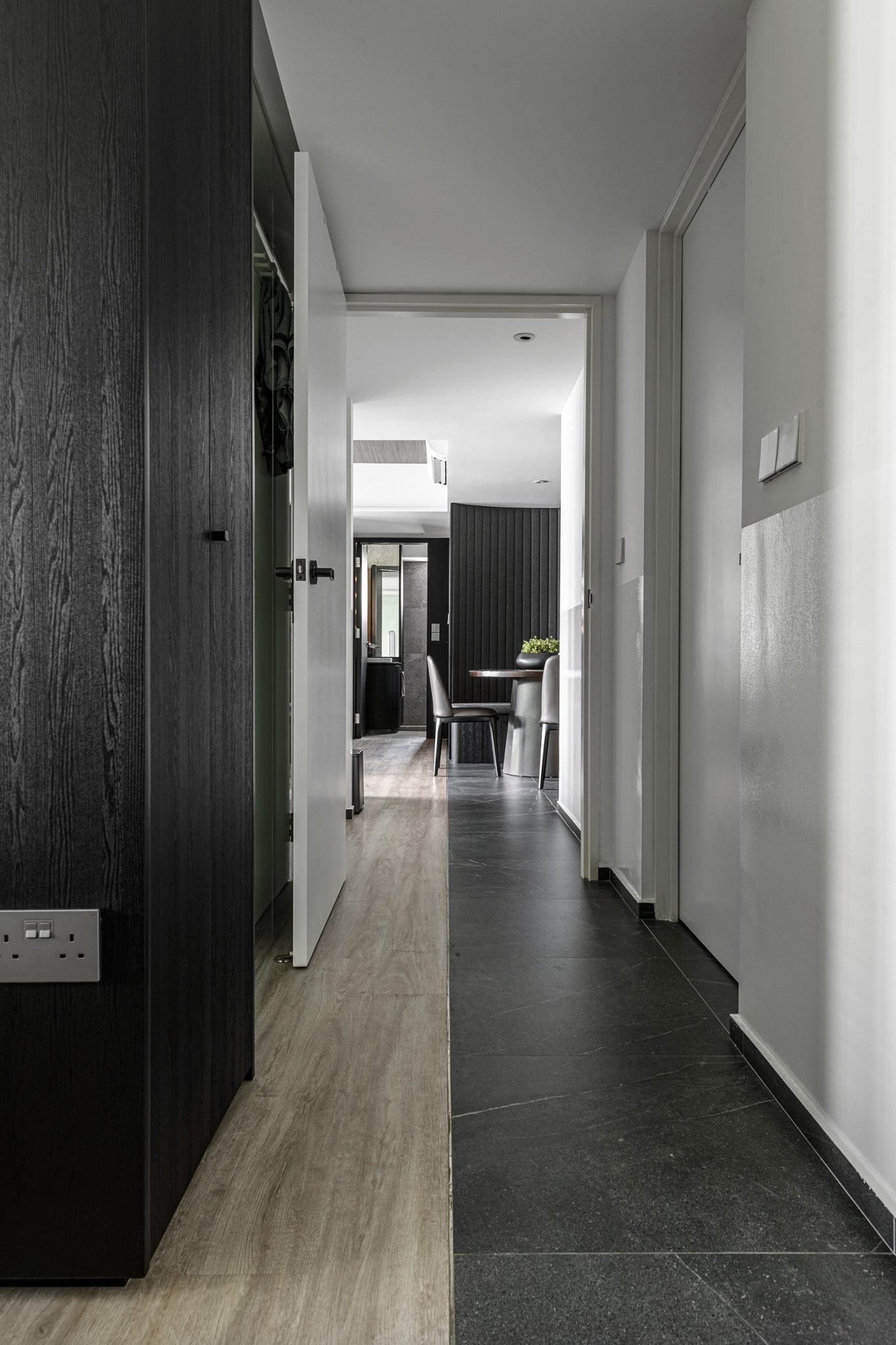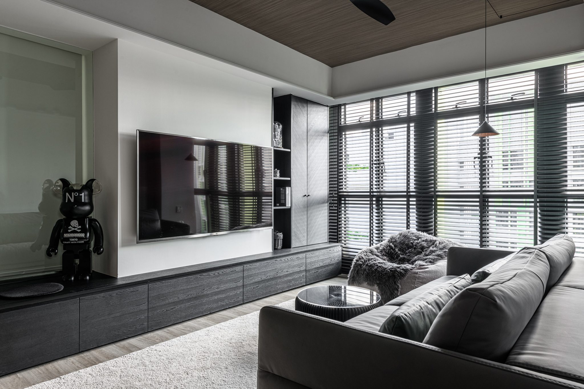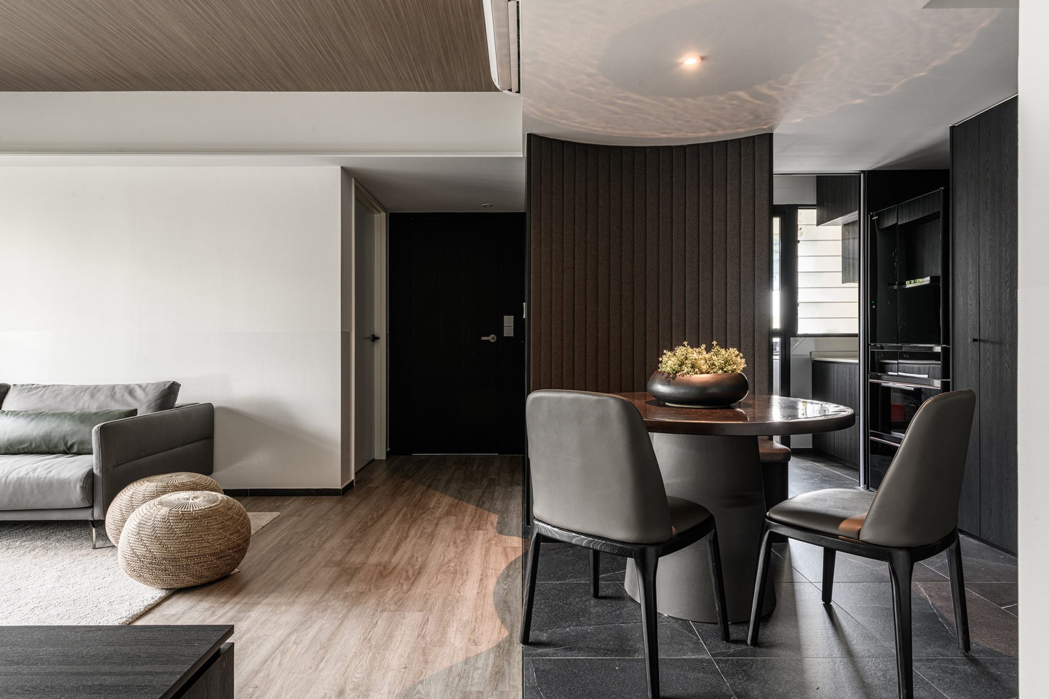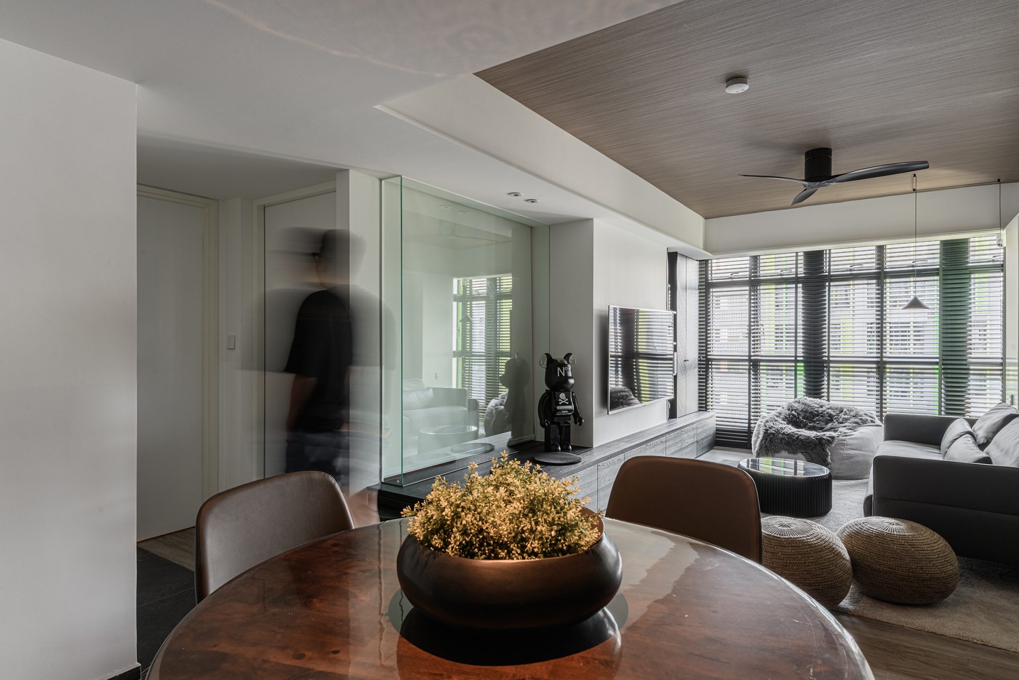 To fully open up the apartment, we installed full length blinds which instantly elongates the space and is one of the first things you notice about the proportion of the space once you enter. A carefully crafted ceiling with precise cuts and lines maps out the living spaces with the highlight being a curved portion which becomes the dining area.