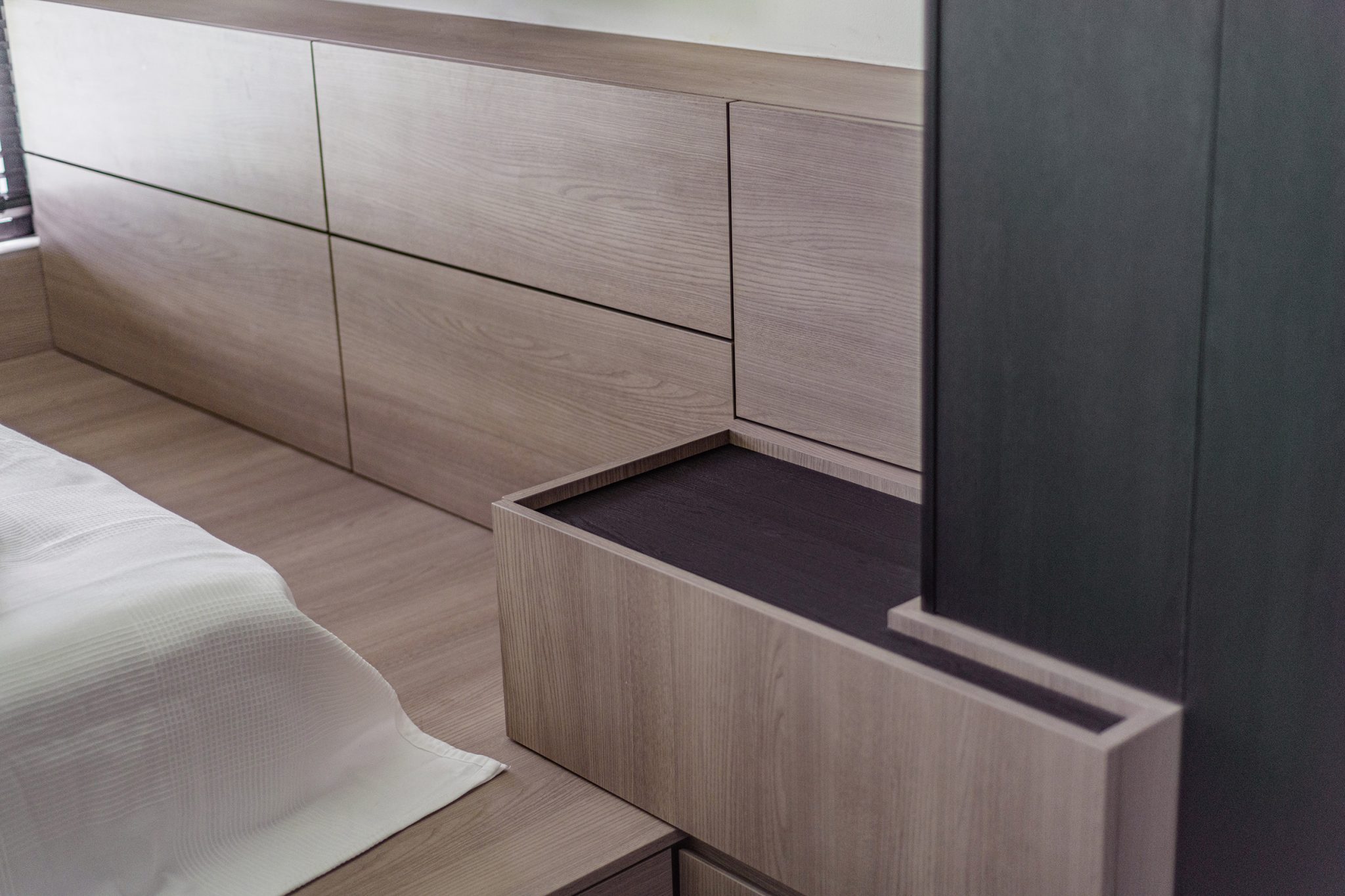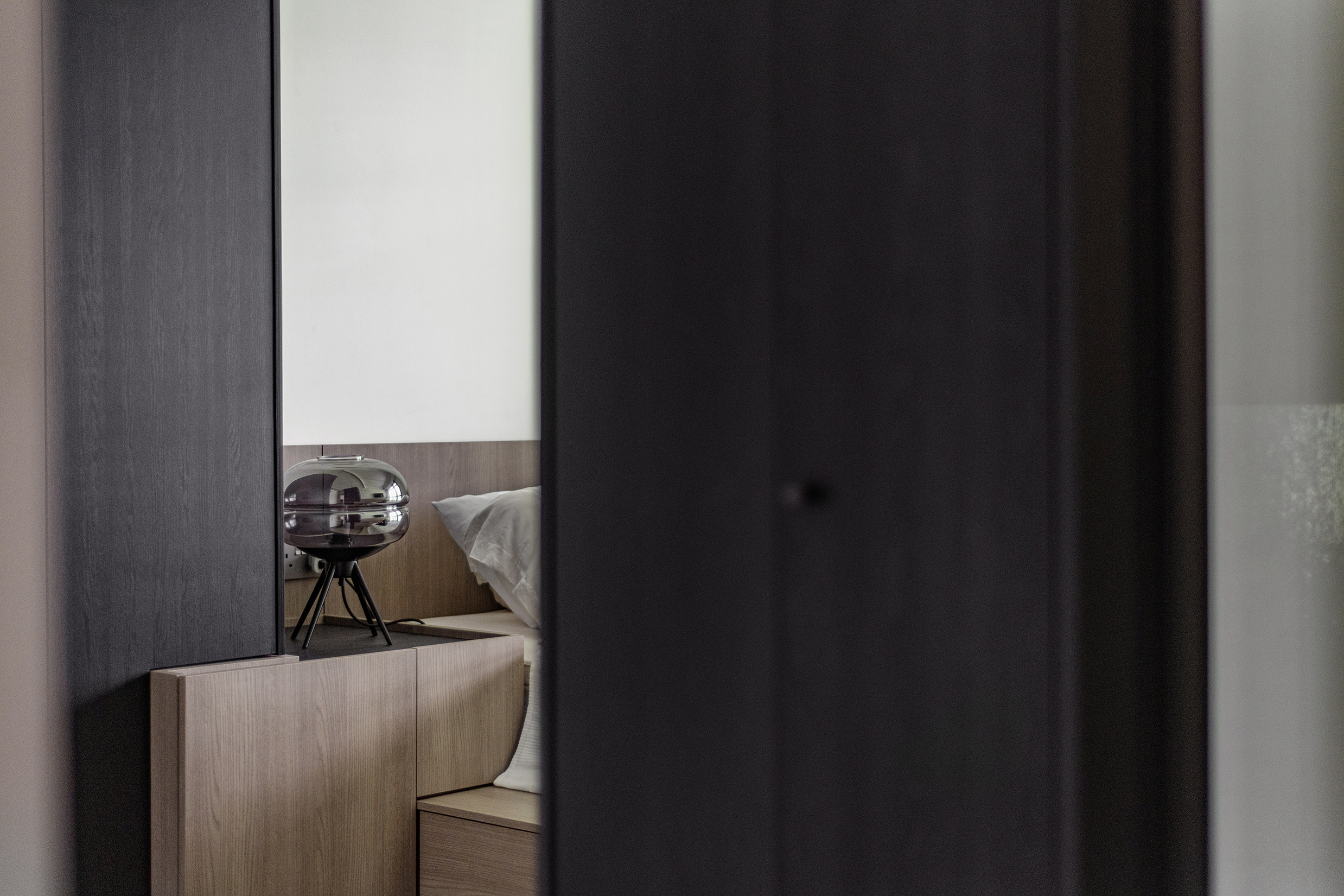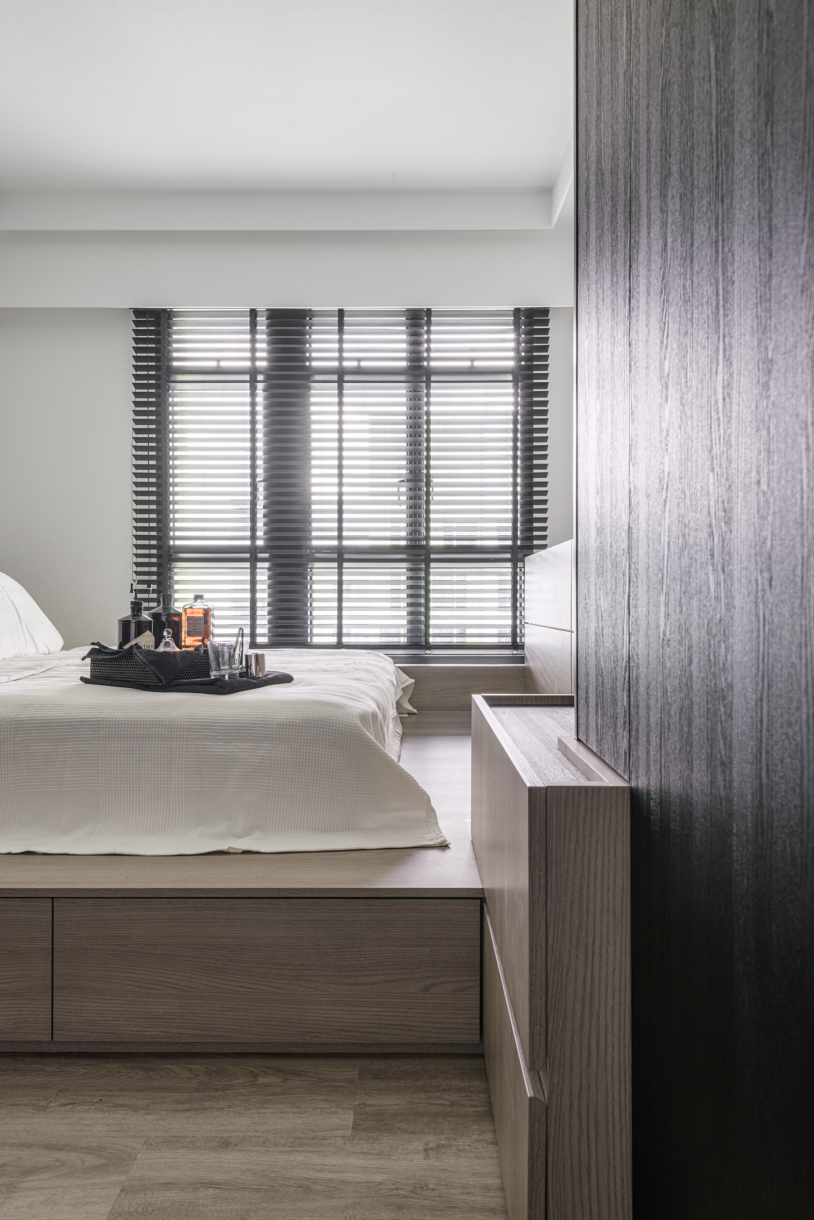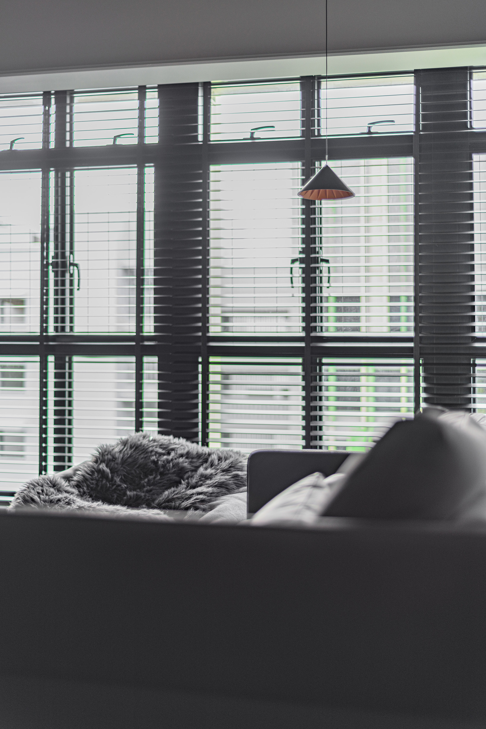 To fully open up the apartment, we installed full length blinds which instantly elongates the space and is one of the first things you notice about the proportion of the space once you enter. A carefully crafted ceiling with precise cuts and lines maps out the living spaces with the highlight being a curved portion which becomes the dining area.