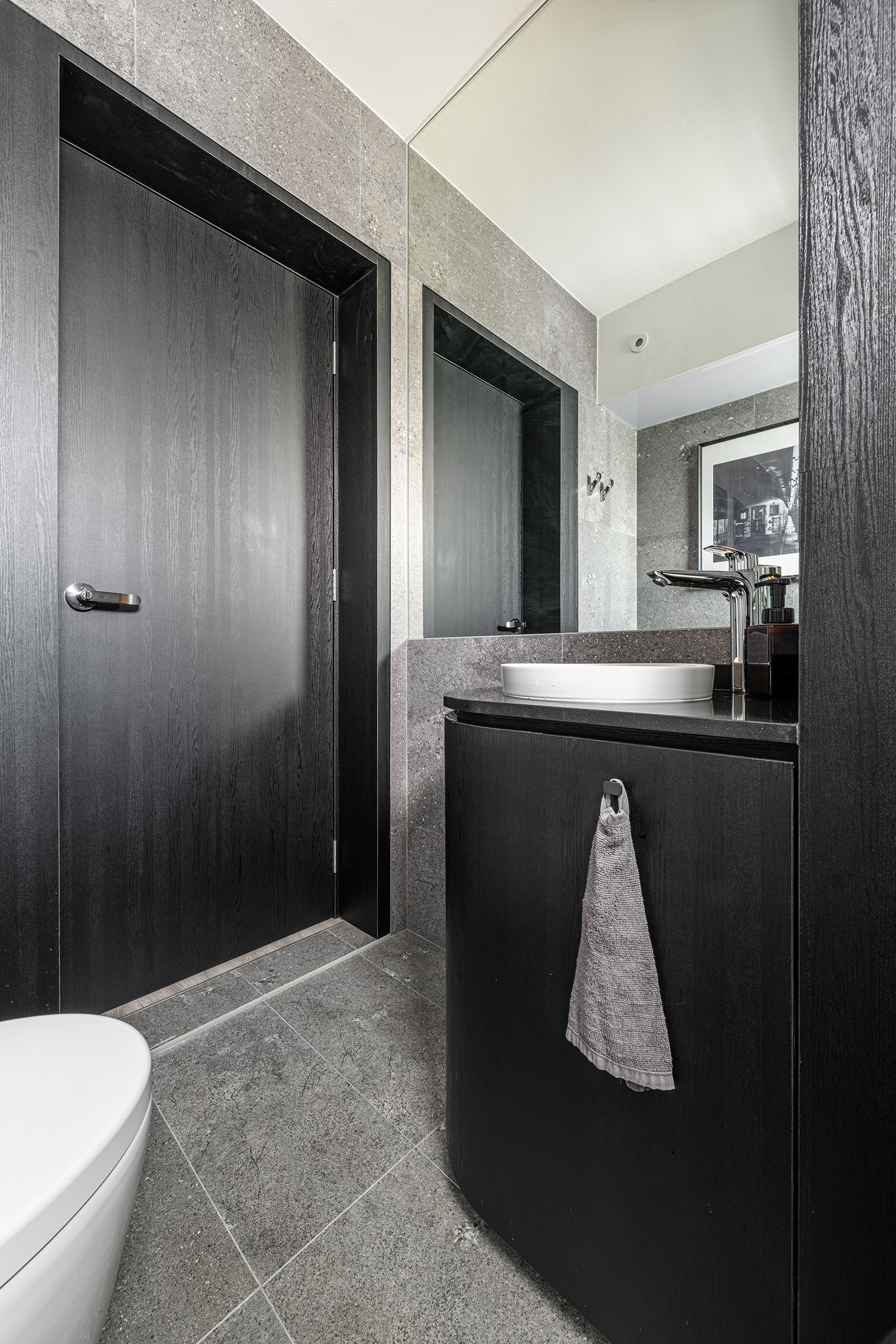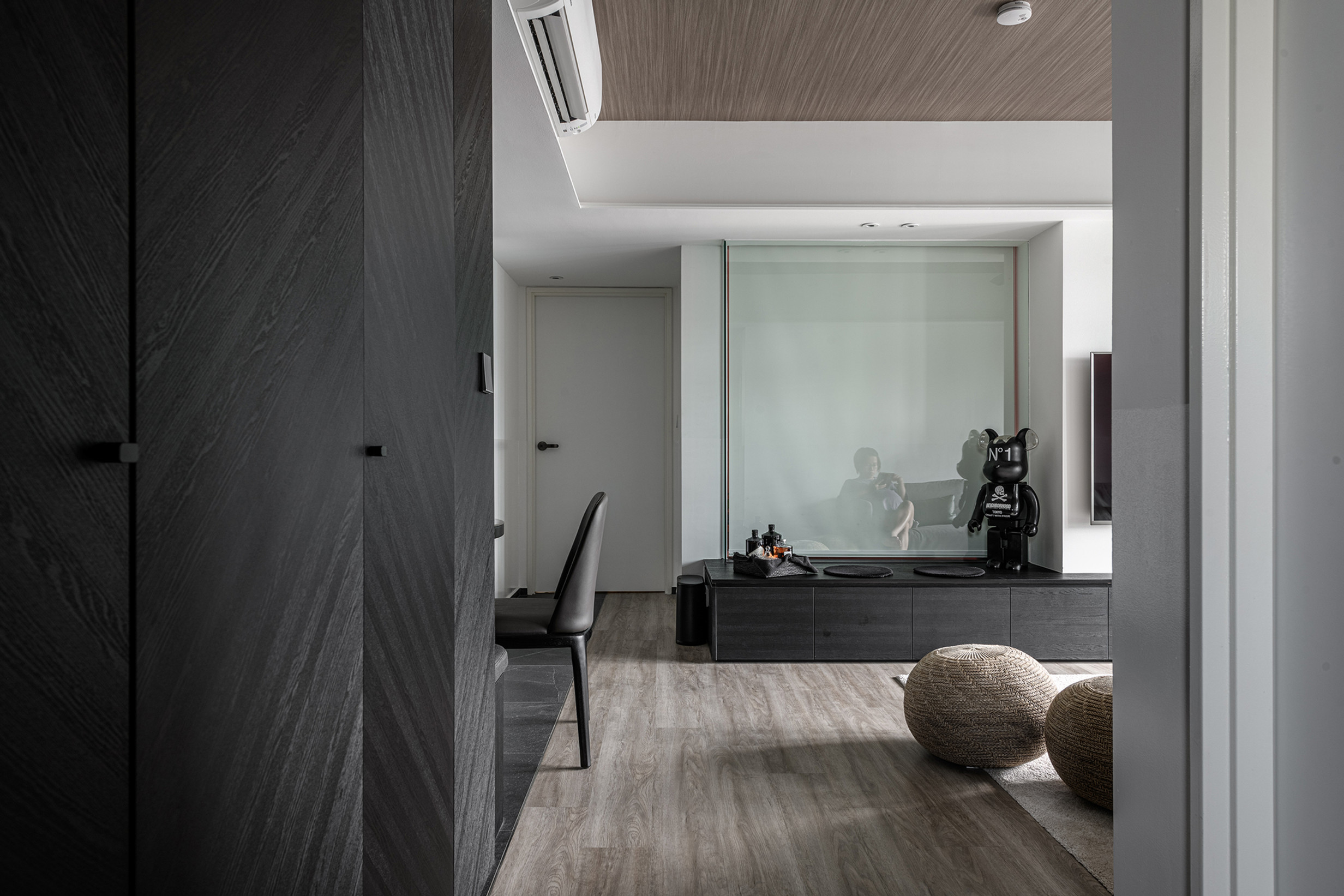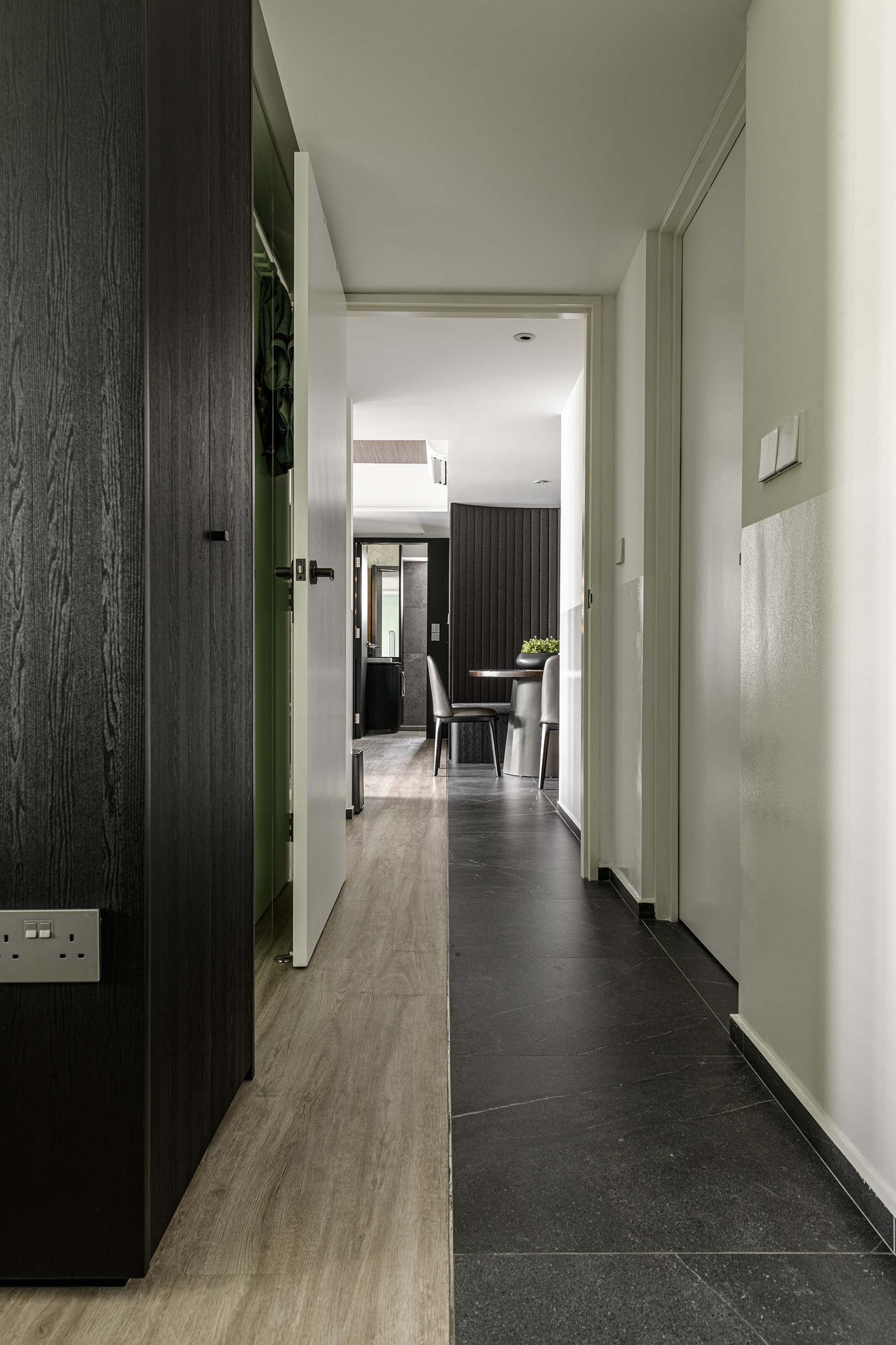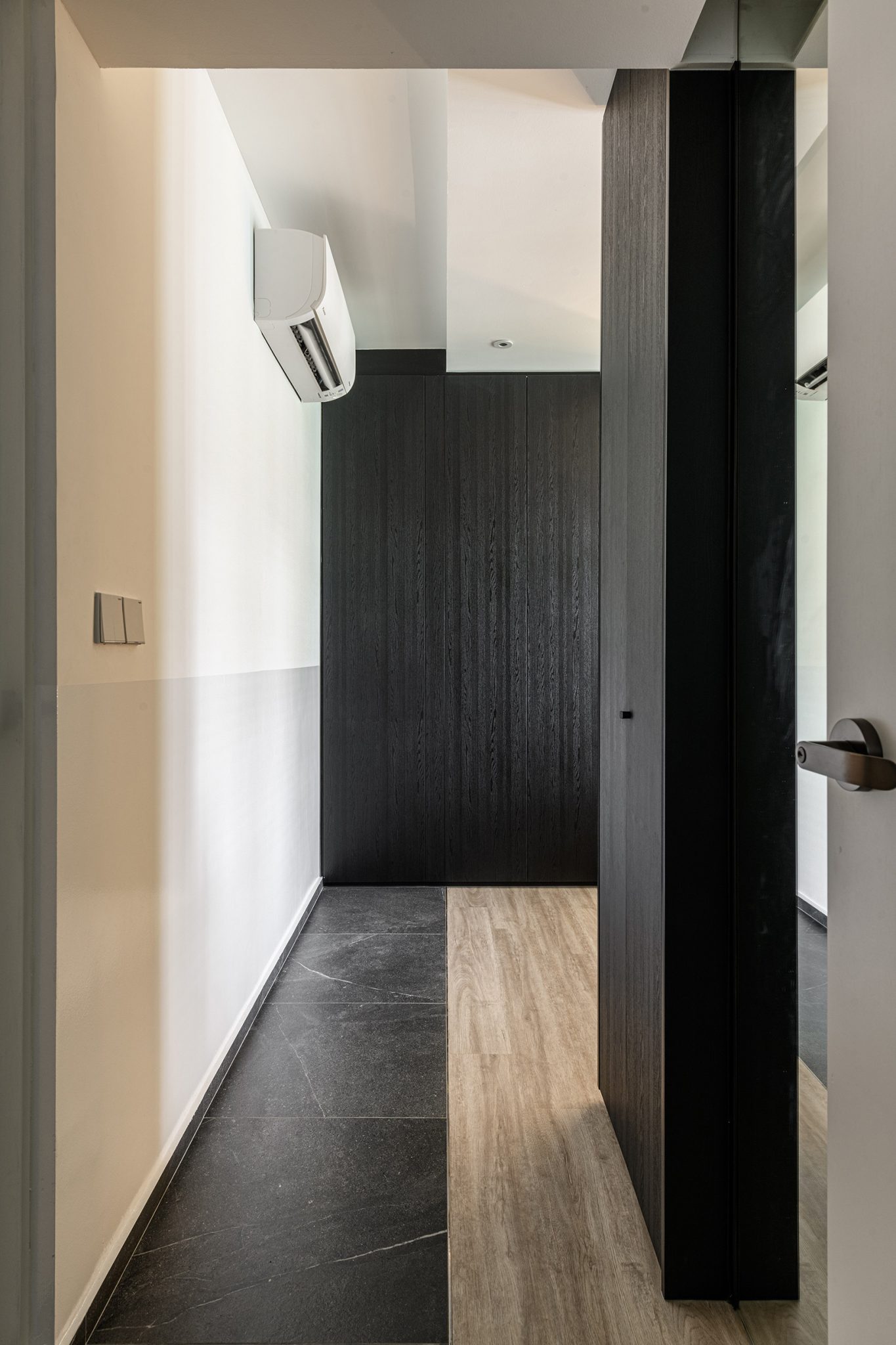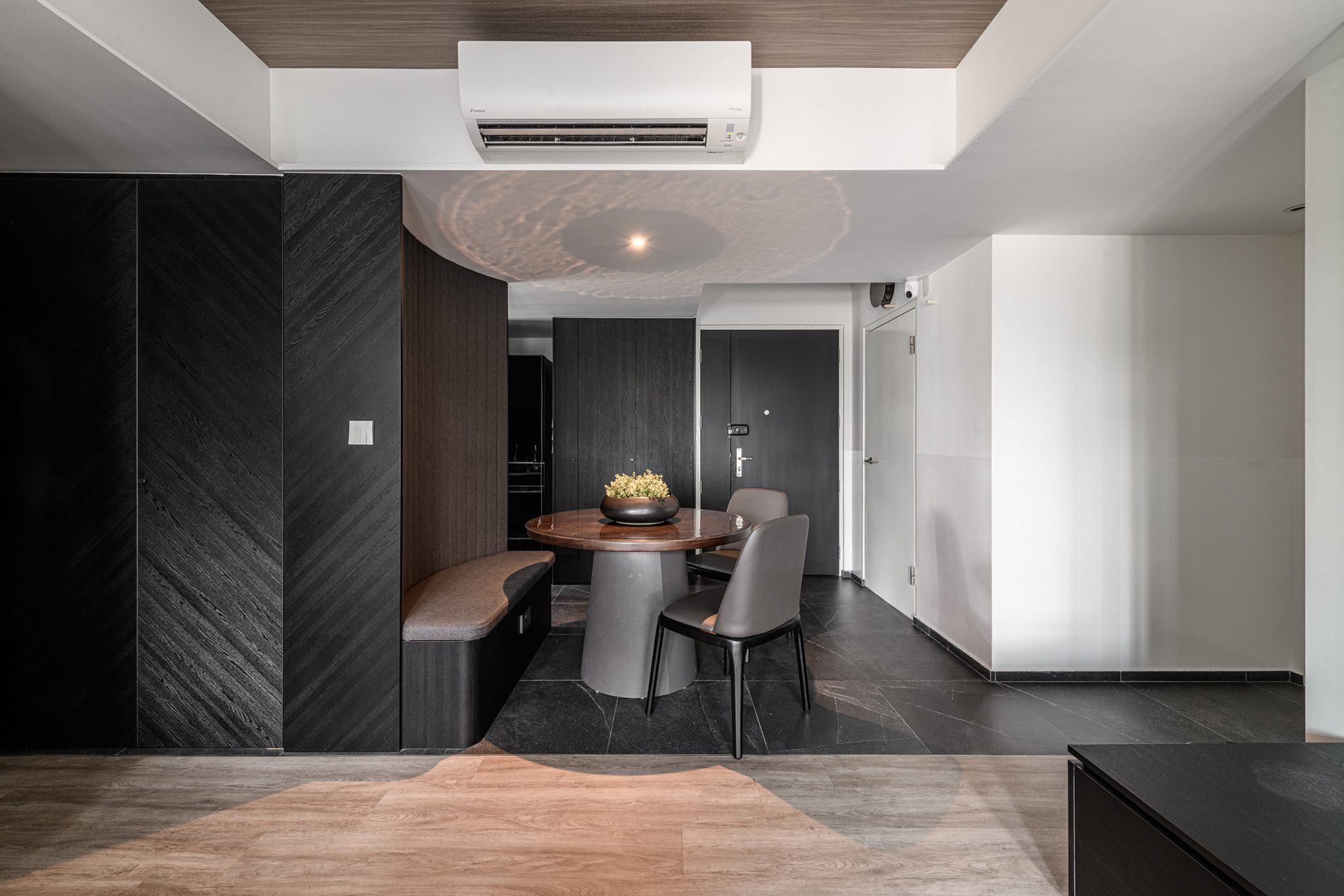 A bold playful take on the floor tiles was done with 2 contrasting types of floor finishes and the long horizontal lines it achieved adds depth and illusion of space.