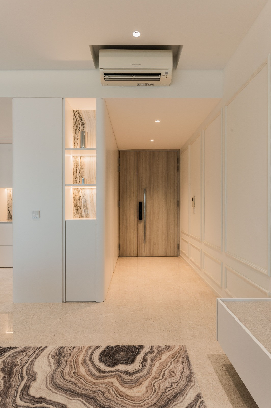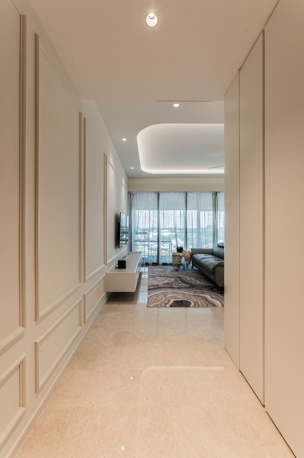 Classic beading on selected wall surfaces introduces a timeless detail, providing depth and texture against the neutral palette. This understated feature bridges tradition with modernity, enriching the interiors with character and refinement. The carefully curated finishes and materials, from soft neutral tones to delicate metallic touches, enhance the sense of spaciousness and sophistication throughout the home.