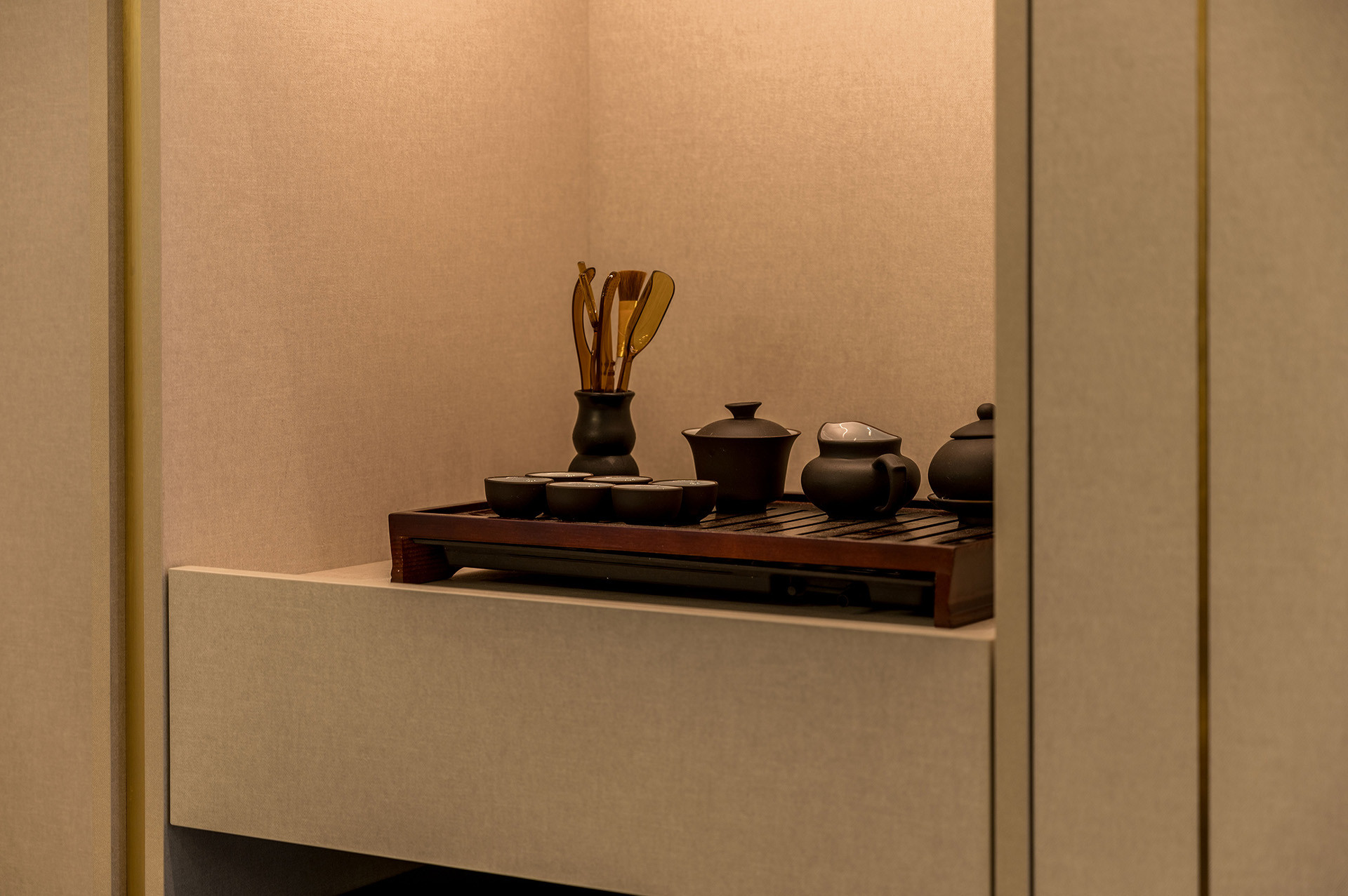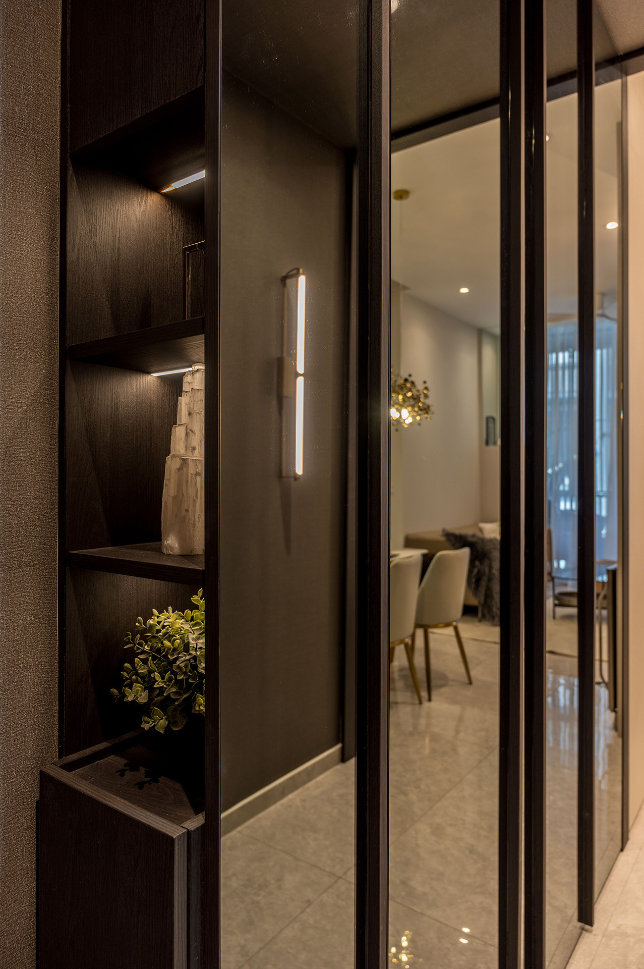 One of the most striking features of the home is the use of green jade tiles as a feature wall. Positioned thoughtfully in the living or dining area, the jade tiles bring a sense of depth, texture, and richness, serving as both a visual anchor and a conversation starter. The cool green tones balance the warm creams and golds, introducing a natural, almost jewel-like quality that reinforces the luxurious yet modern character of the residence. This feature wall embodies Erstudio’s philosophy of combining subtle drama with functional design, giving personality to the space without compromising flow or scale.