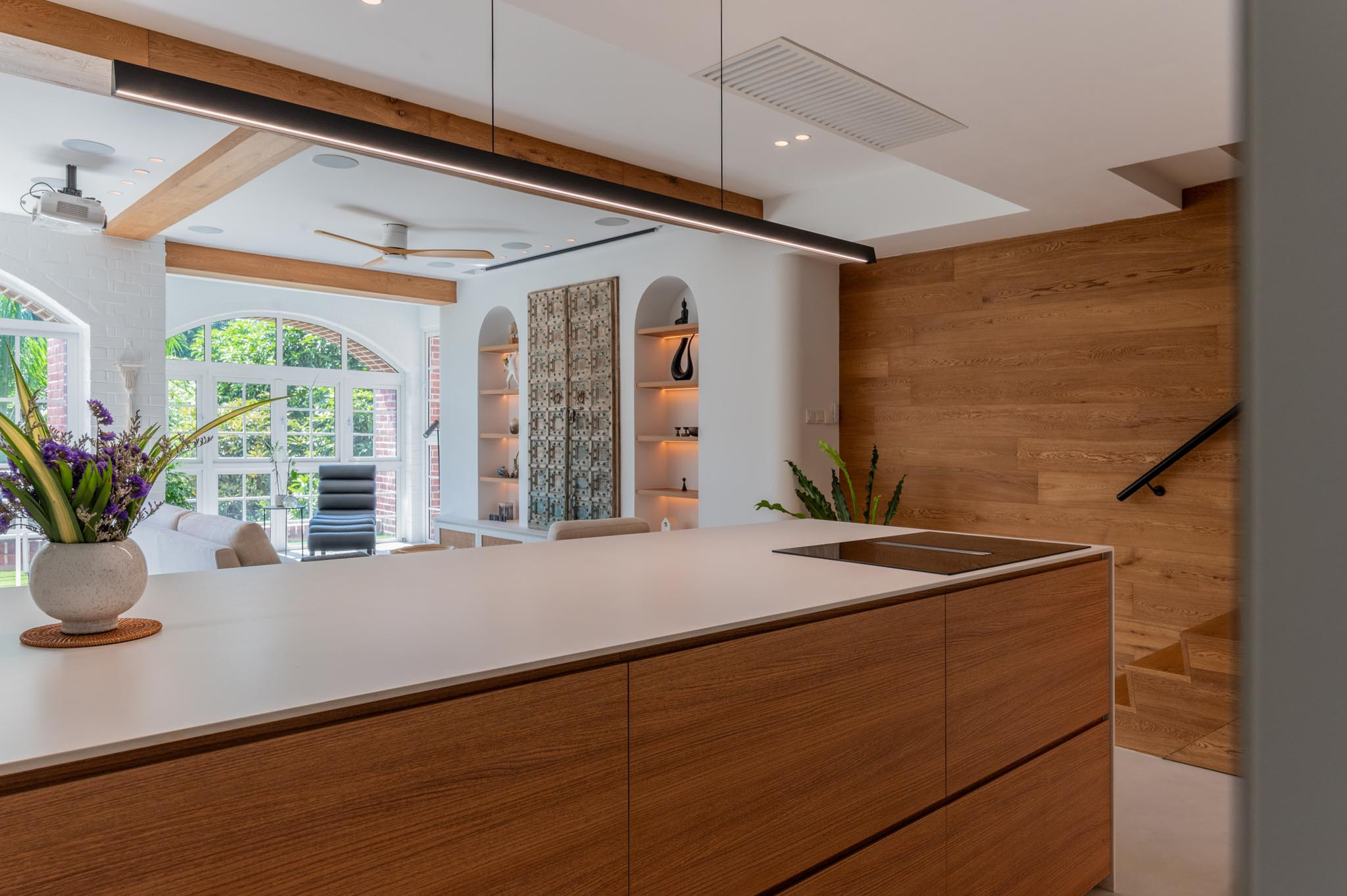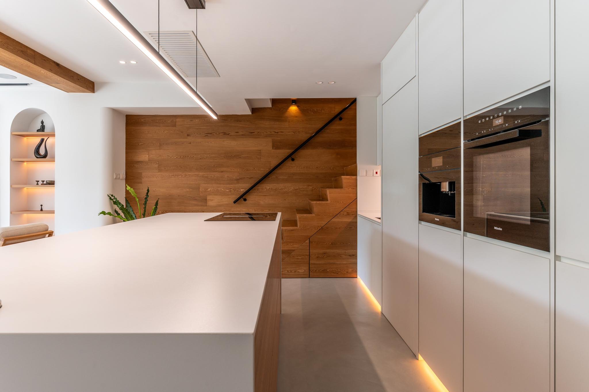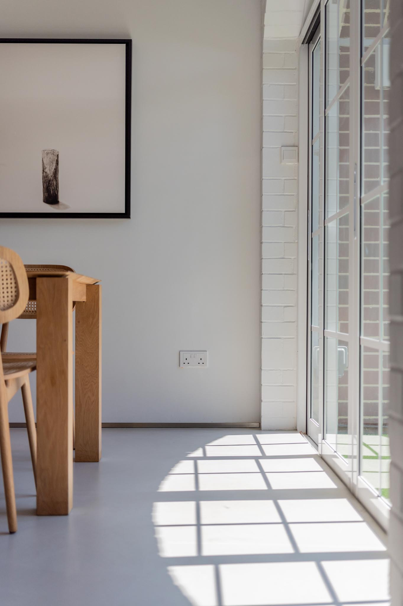Complementing the vintage door is the micro-cement flooring, which stretches across the living area, providing a seamless, contemporary finish. Micro-cement is chosen for its durability, ease of maintenance, and the subtle texture it brings to the space. It offers a cool, industrial feel that contrasts beautifully with the warm, natural tones of the vintage door and other wooden elements. This choice of flooring ensures the space remains open and inviting, a perfect canvas for the family’s daily life.