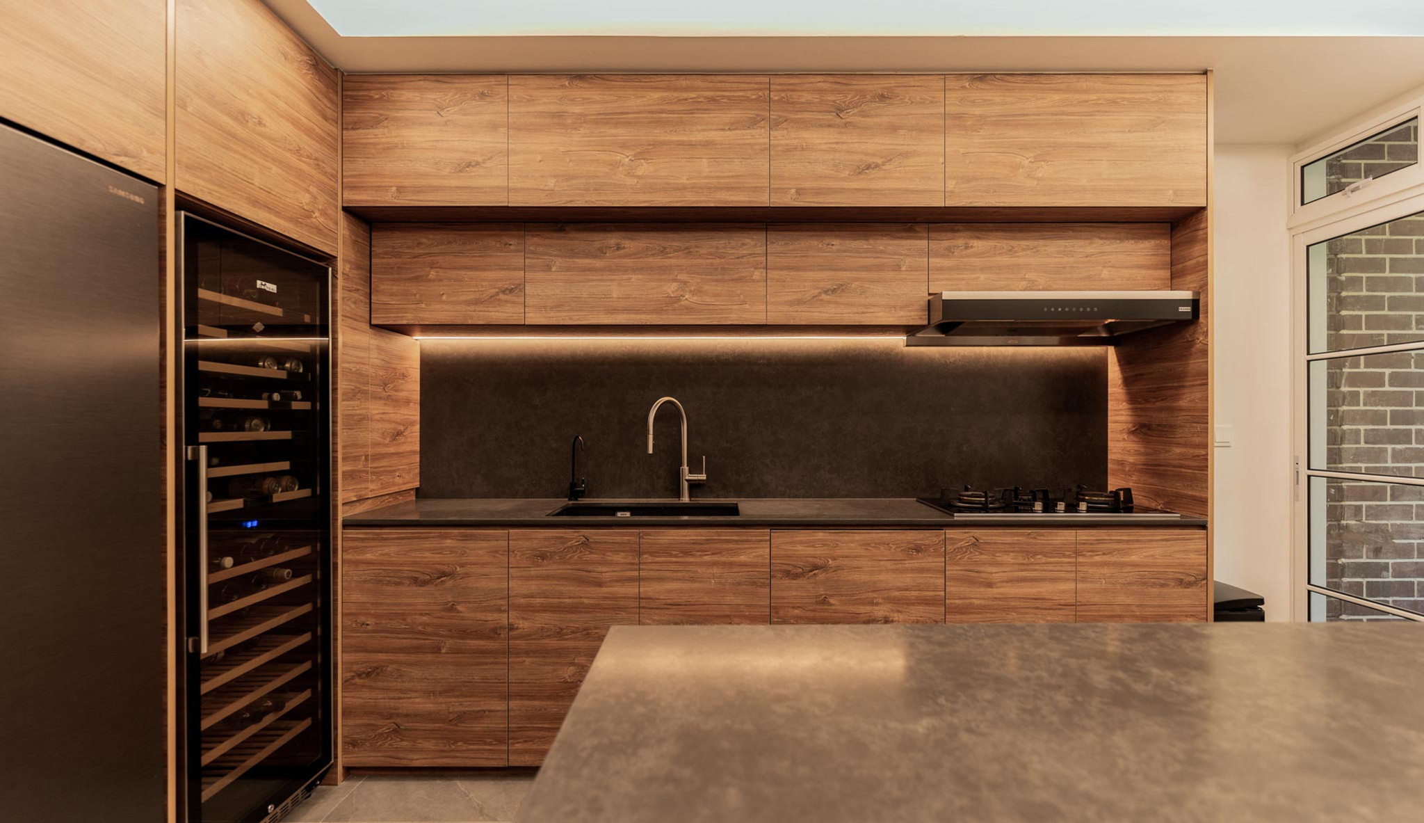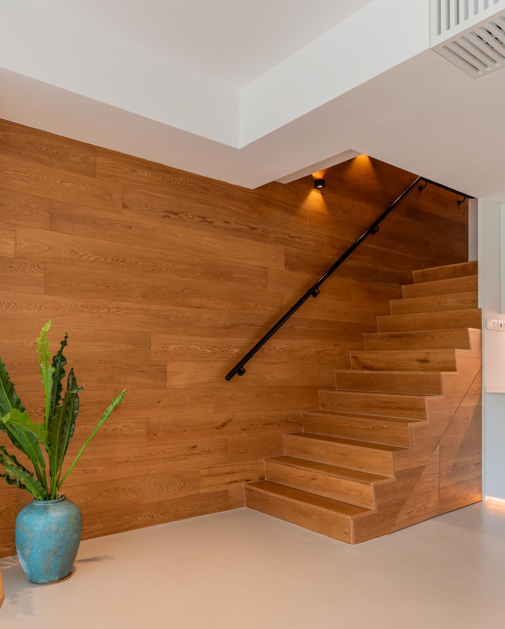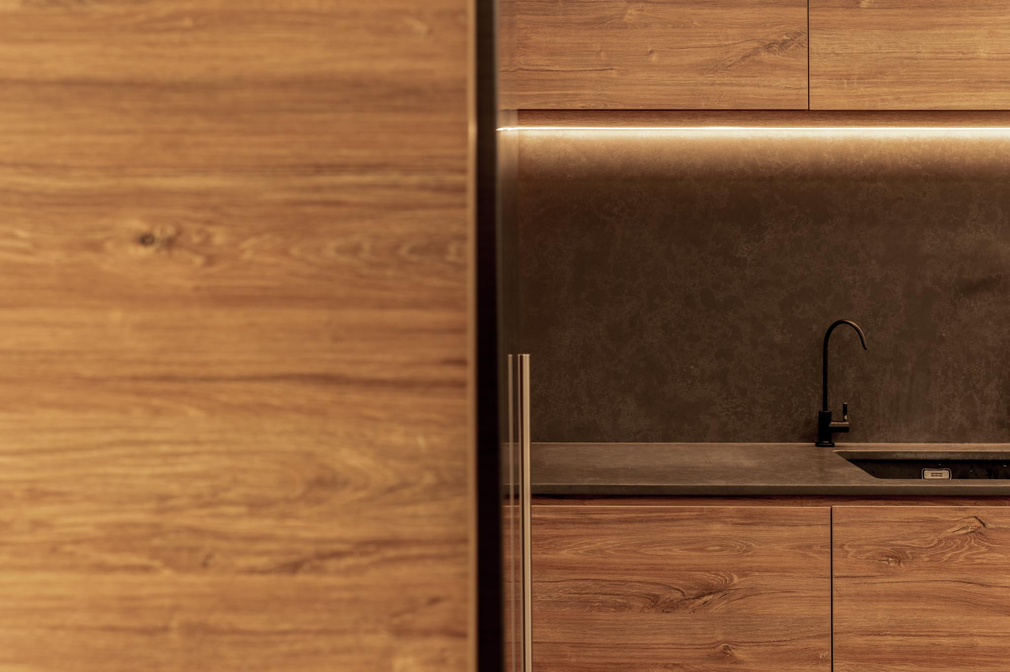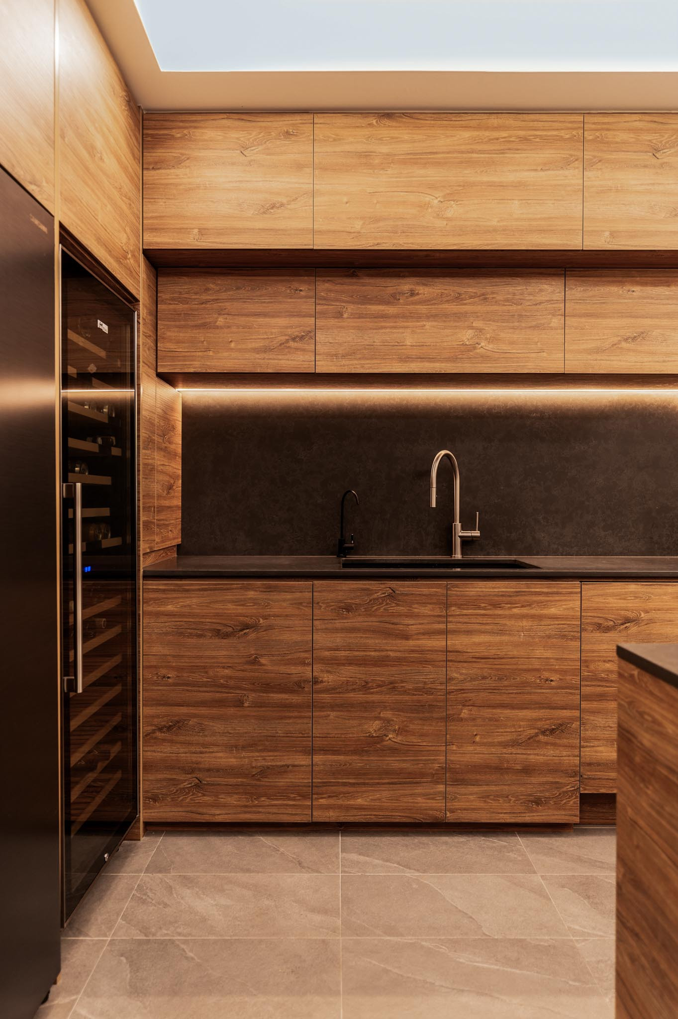 Complementing the vintage door is the micro-cement flooring, which stretches across the living area, providing a seamless, contemporary finish. Micro-cement is chosen for its durability, ease of maintenance, and the subtle texture it brings to the space. It offers a cool, industrial feel that contrasts beautifully with the warm, natural tones of the vintage door and other wooden elements. This choice of flooring ensures the space remains open and inviting, a perfect canvas for the family’s daily life.