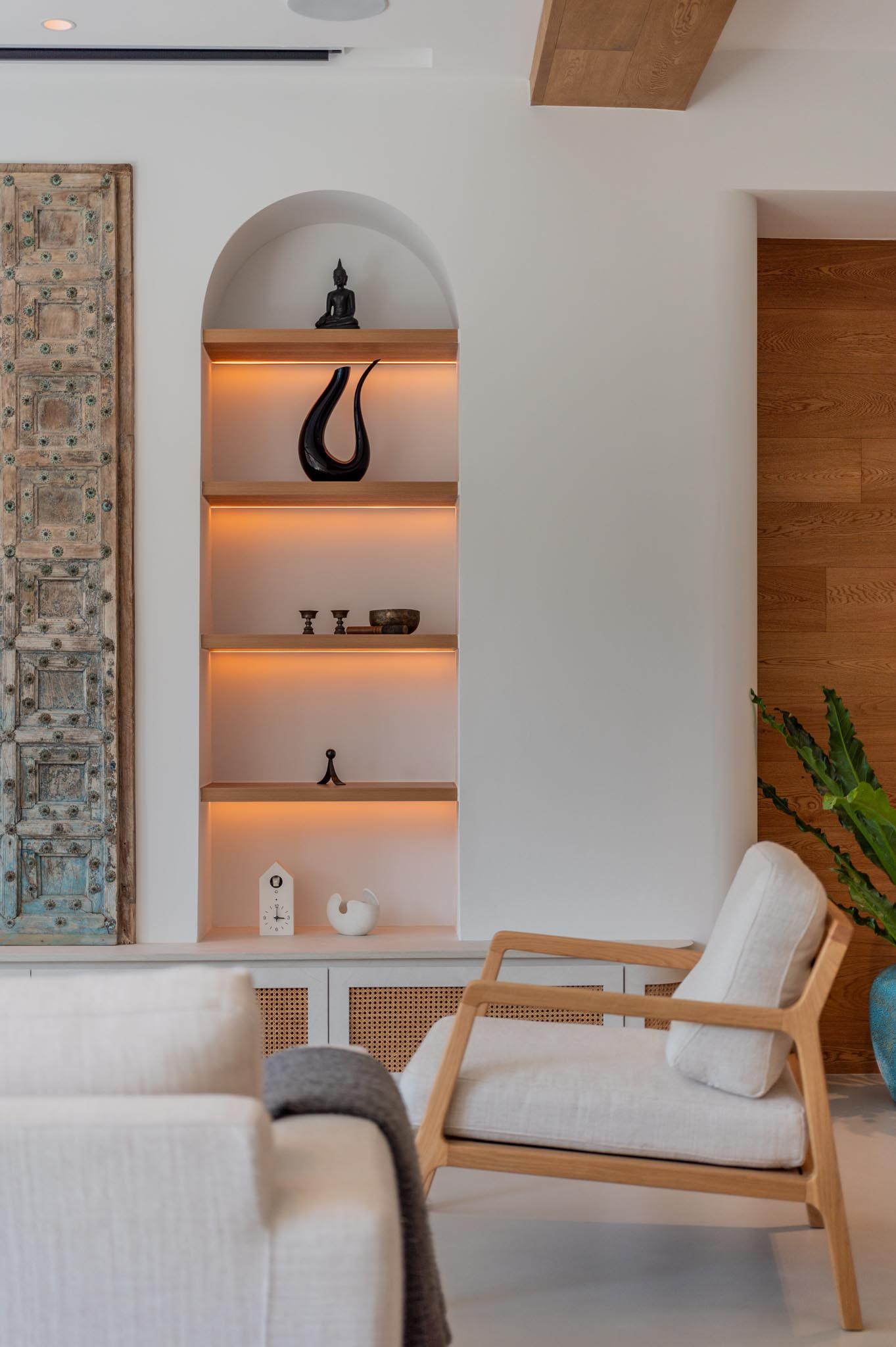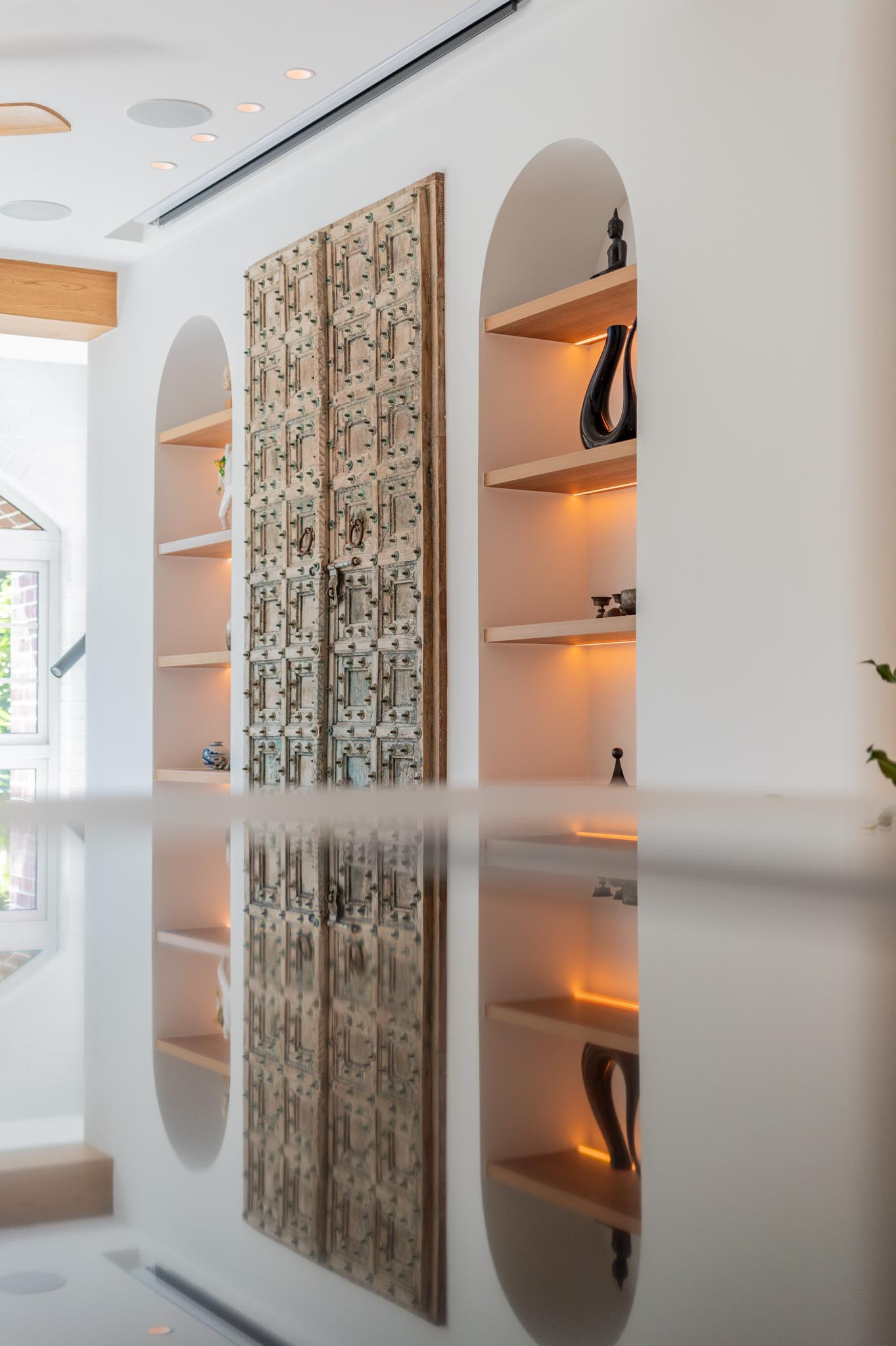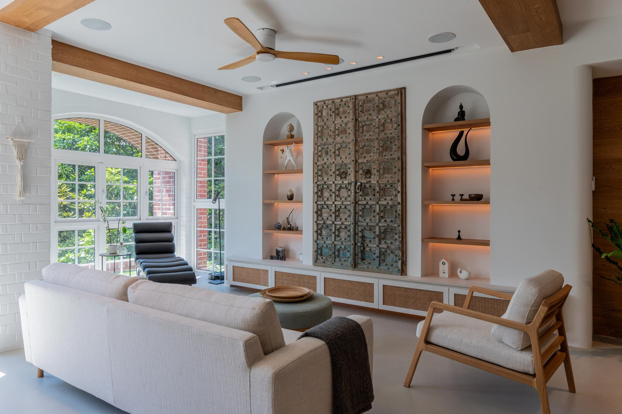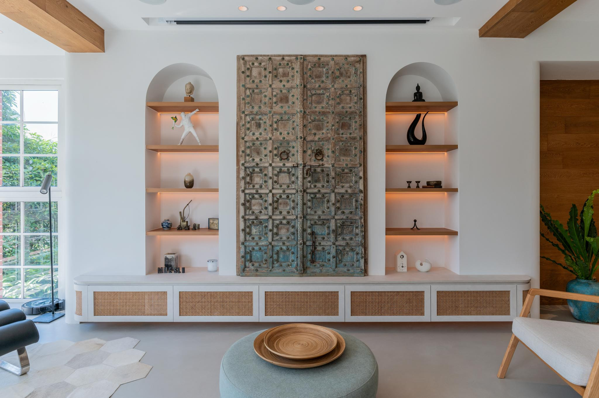 The living space in this condo is a testament to the beauty of repurposing and blending traditional elements with modern design. The centrepiece of this area is a stunning, vintage door, reimagined and reused as a focal point. This door not only adds character but also tells a story, reflecting the family’s appreciation for heritage and timeless beauty. The vintage piece stands as a bold statement against the clean lines and minimalist approach that defines the rest of the space.