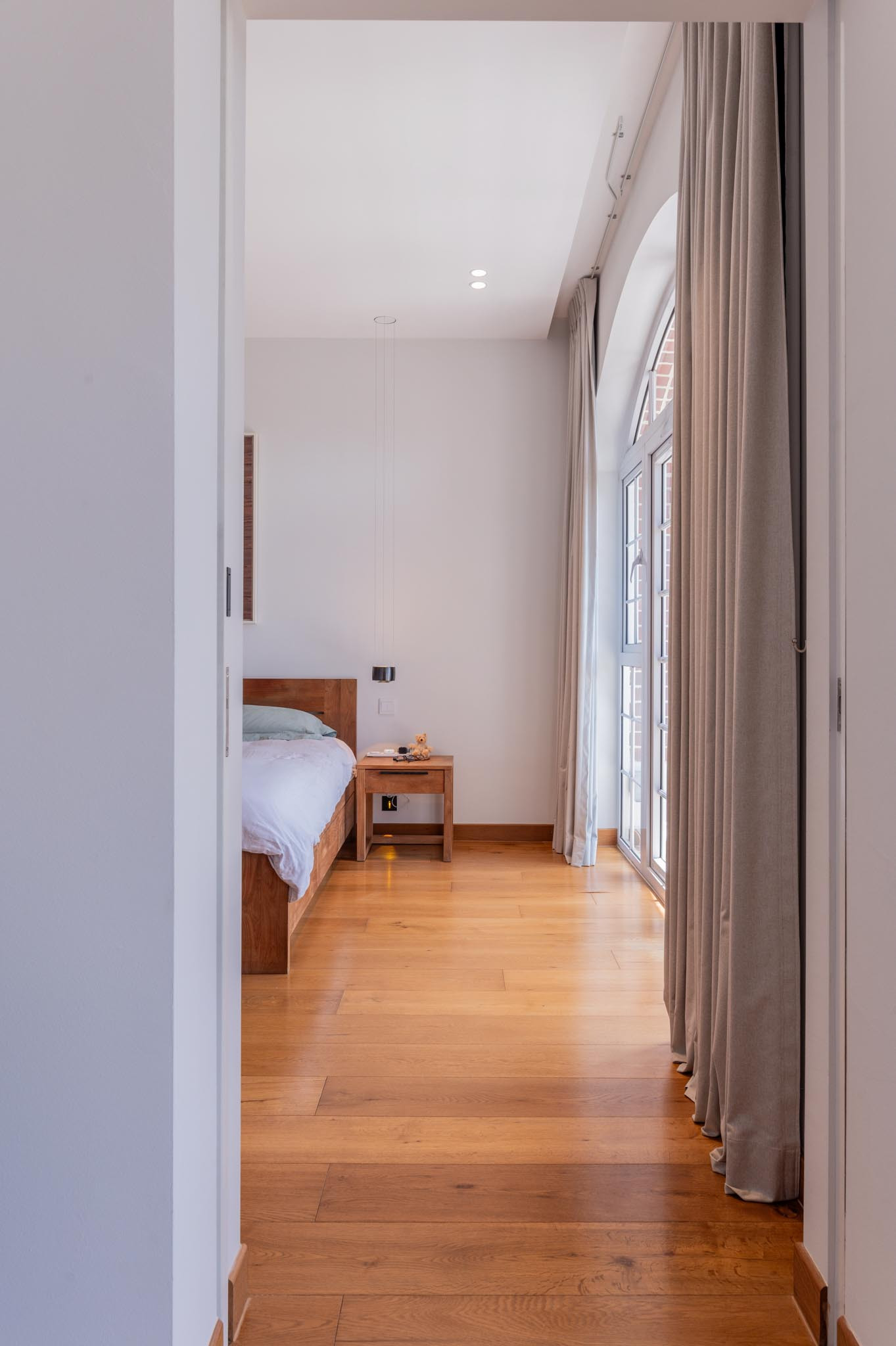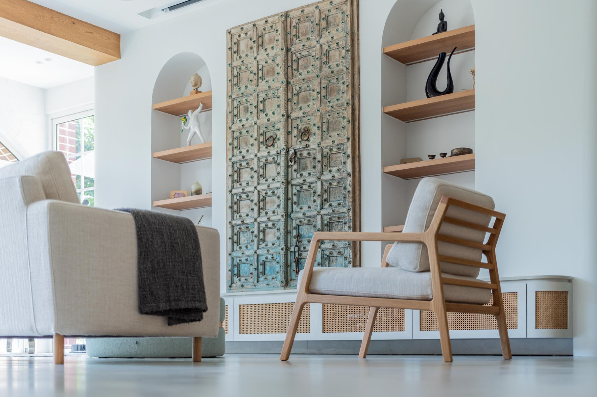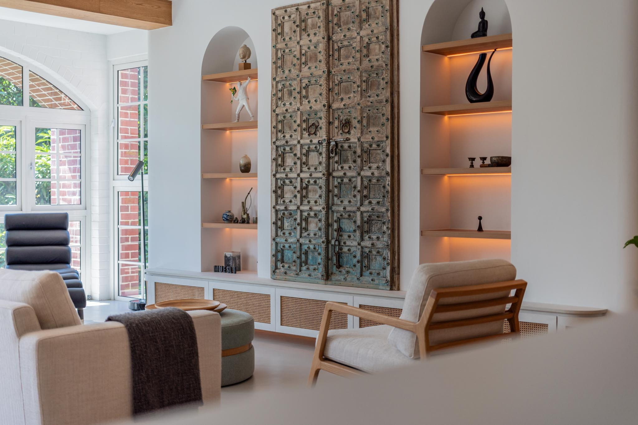 The living space in this condo is a testament to the beauty of repurposing and blending traditional elements with modern design. The centrepiece of this area is a stunning, vintage door, reimagined and reused as a focal point. This door not only adds character but also tells a story, reflecting the family’s appreciation for heritage and timeless beauty. The vintage piece stands as a bold statement against the clean lines and minimalist approach that defines the rest of the space.