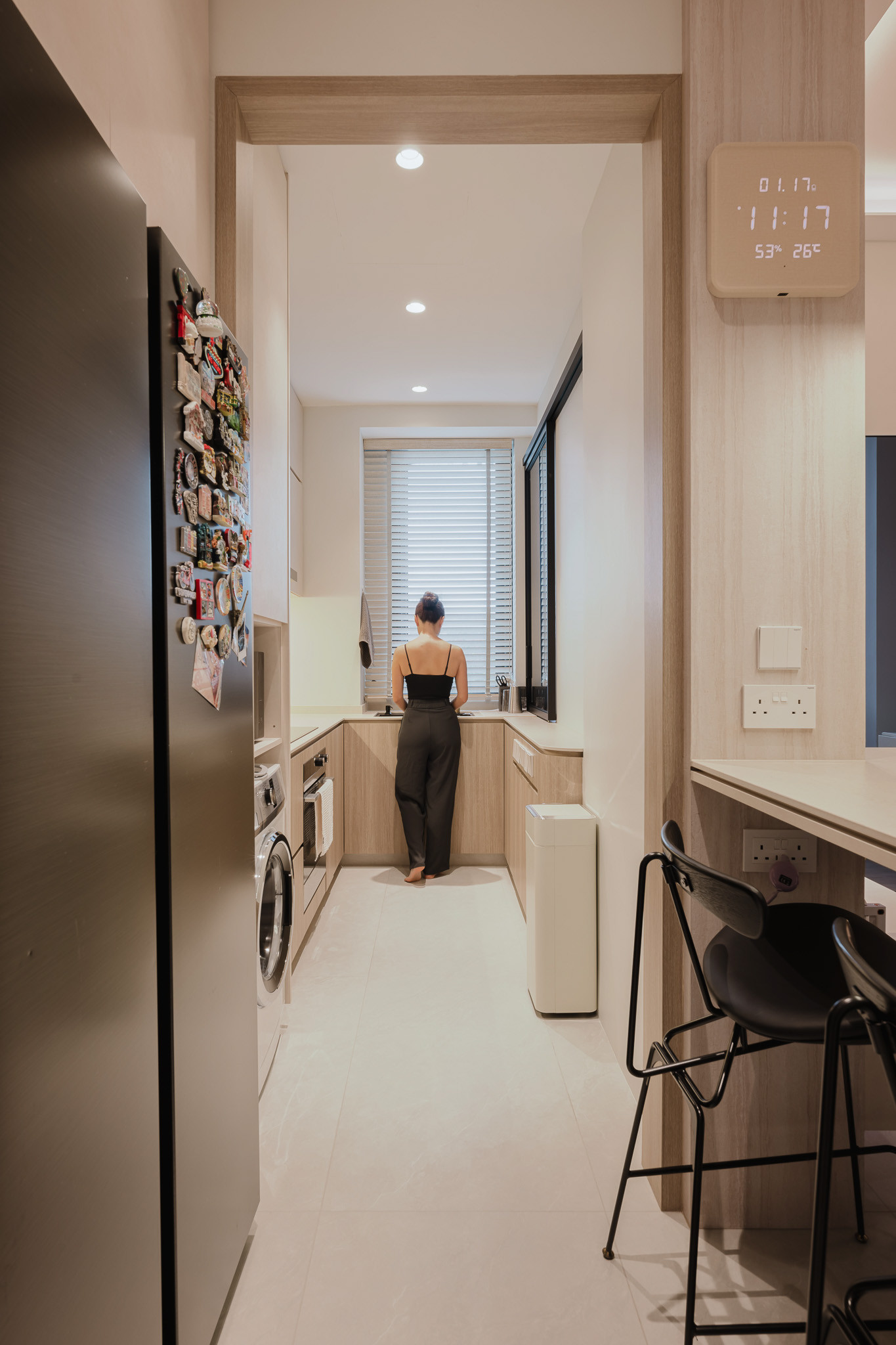 In the kitchen, functionality is paired with understated design. The cabinetry, finished in warm cream tones, conceals appliances neatly to maintain an uncluttered look. The countertop and backsplash feature soft stone-like surfaces that bring a tactile touch to the space without overwhelming it. Everything has its place — a reflection of the couple’s preference for order and simplicity.