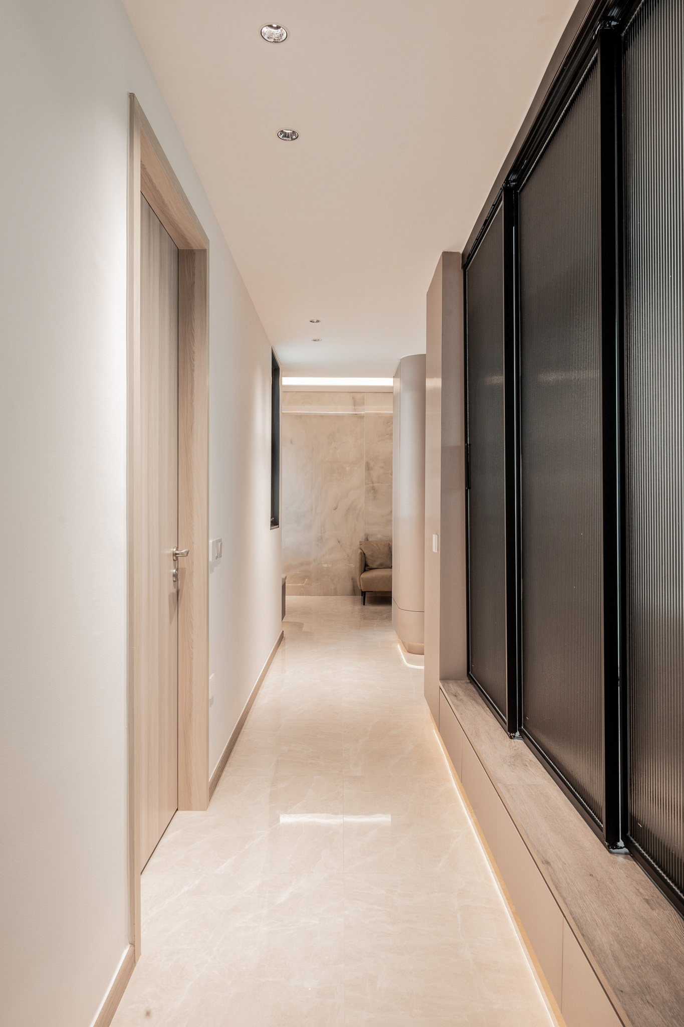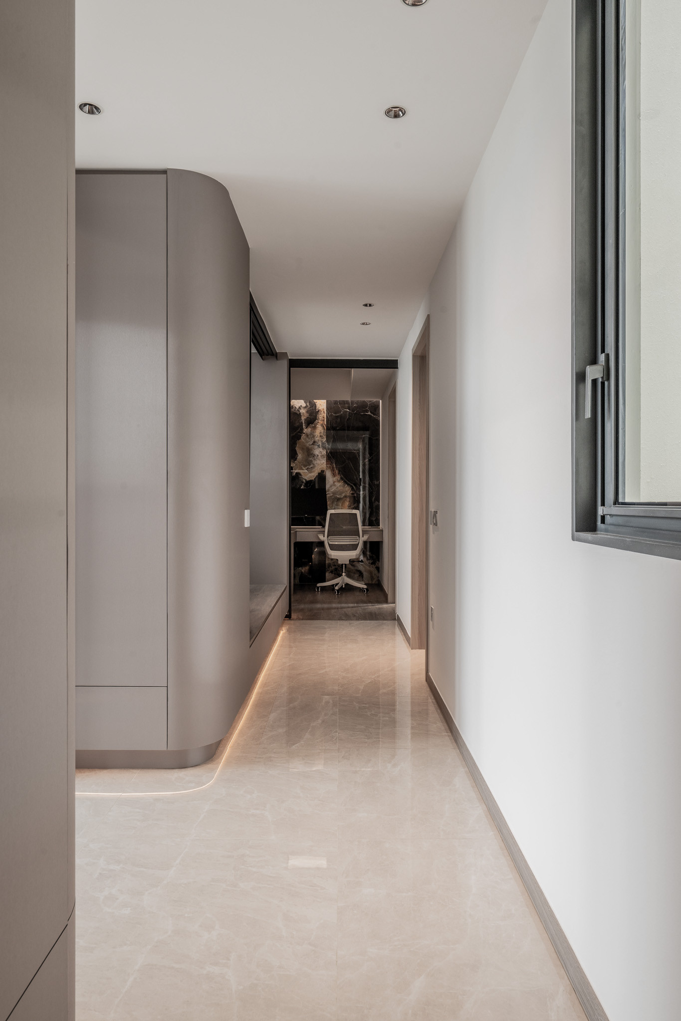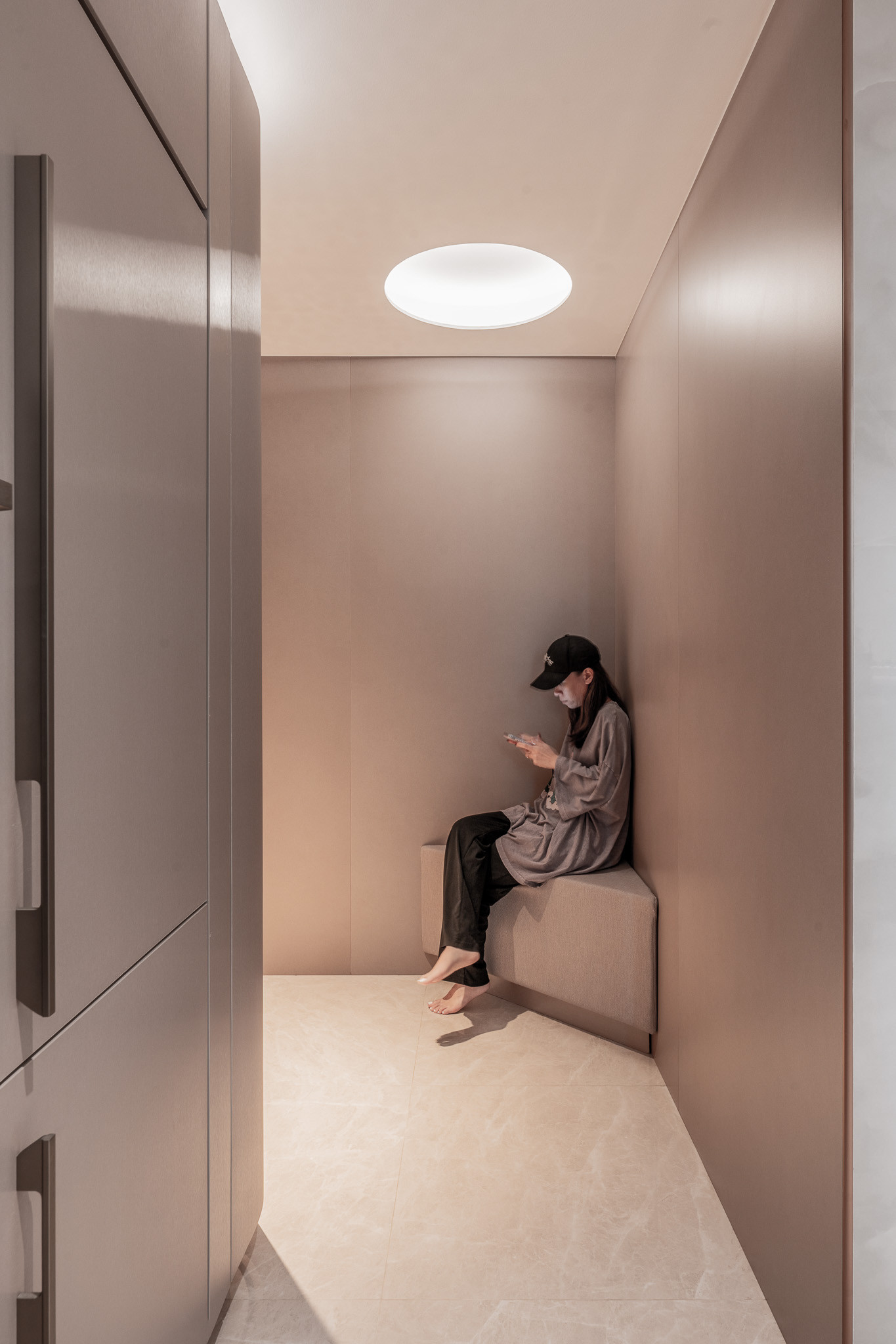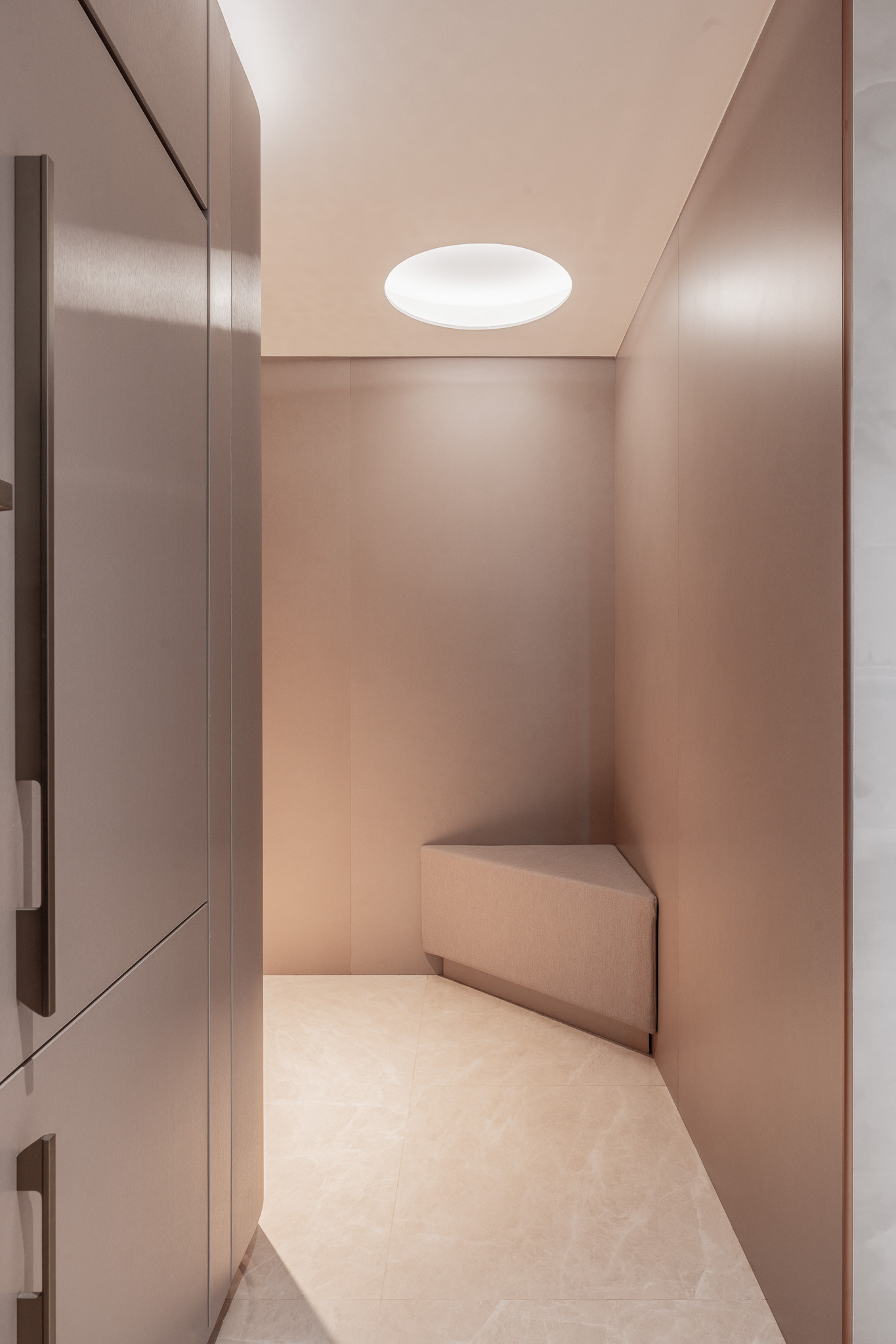 Upon entry, guests are greeted by a corridor that feels more like a gallery—lined with curved cabinetry and softened by indirect lighting. A custom upholstered corner bench awaits, not just as seating, but as a sculptural pause. This quiet vestibule sets the tone: here, even transitions are thoughtful.