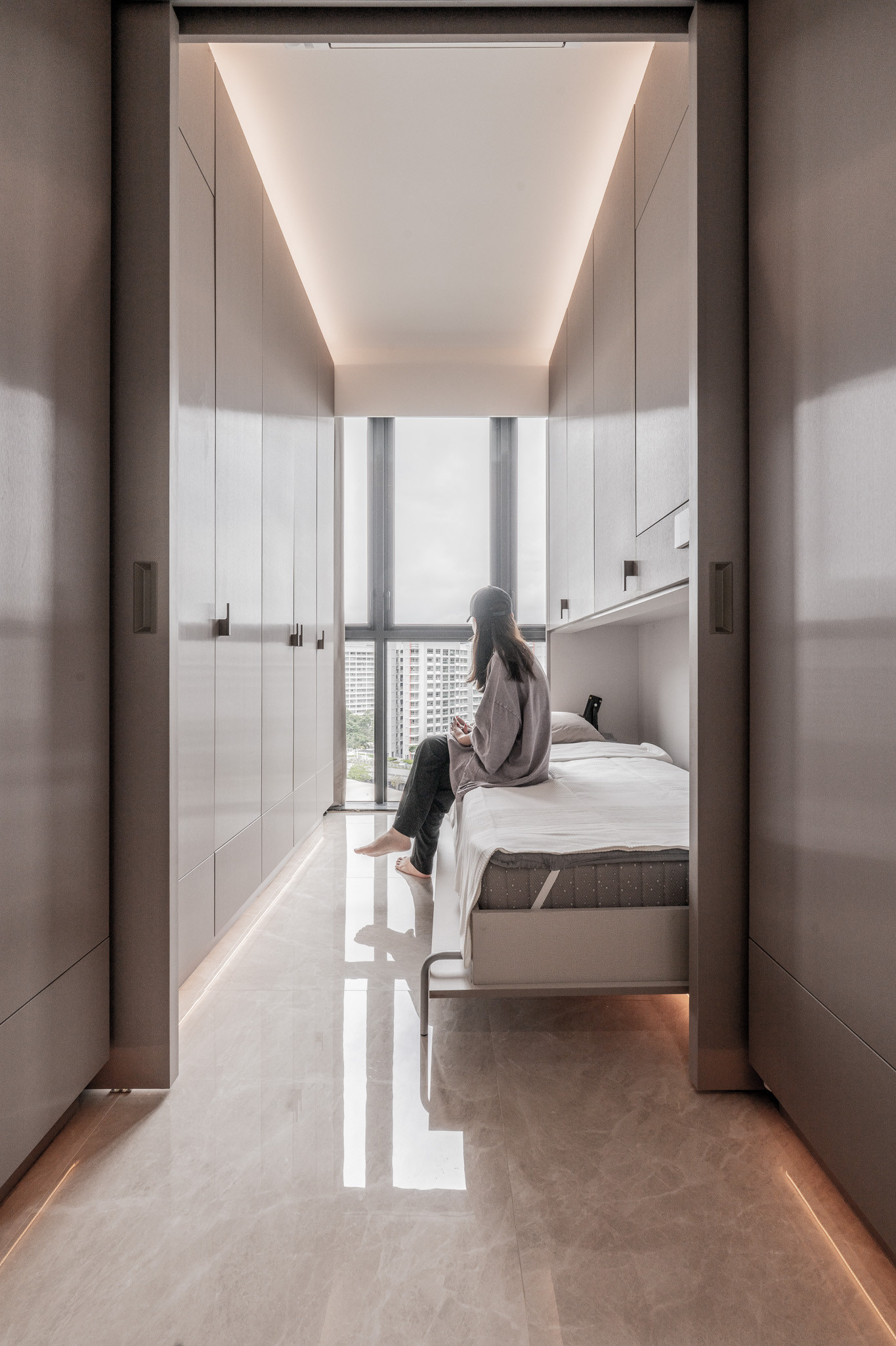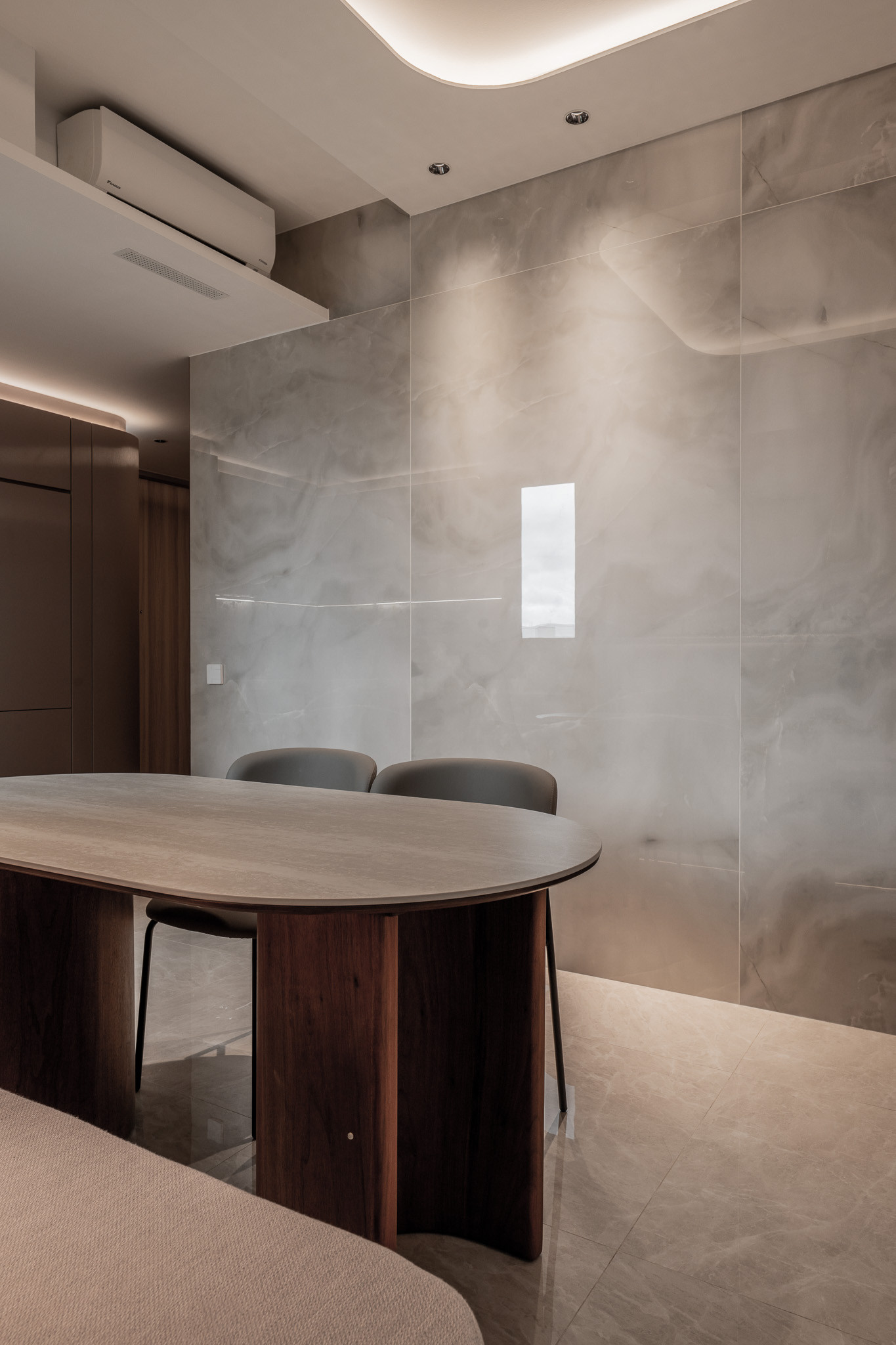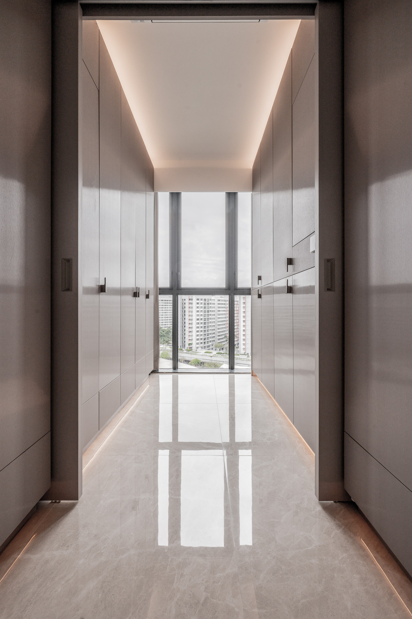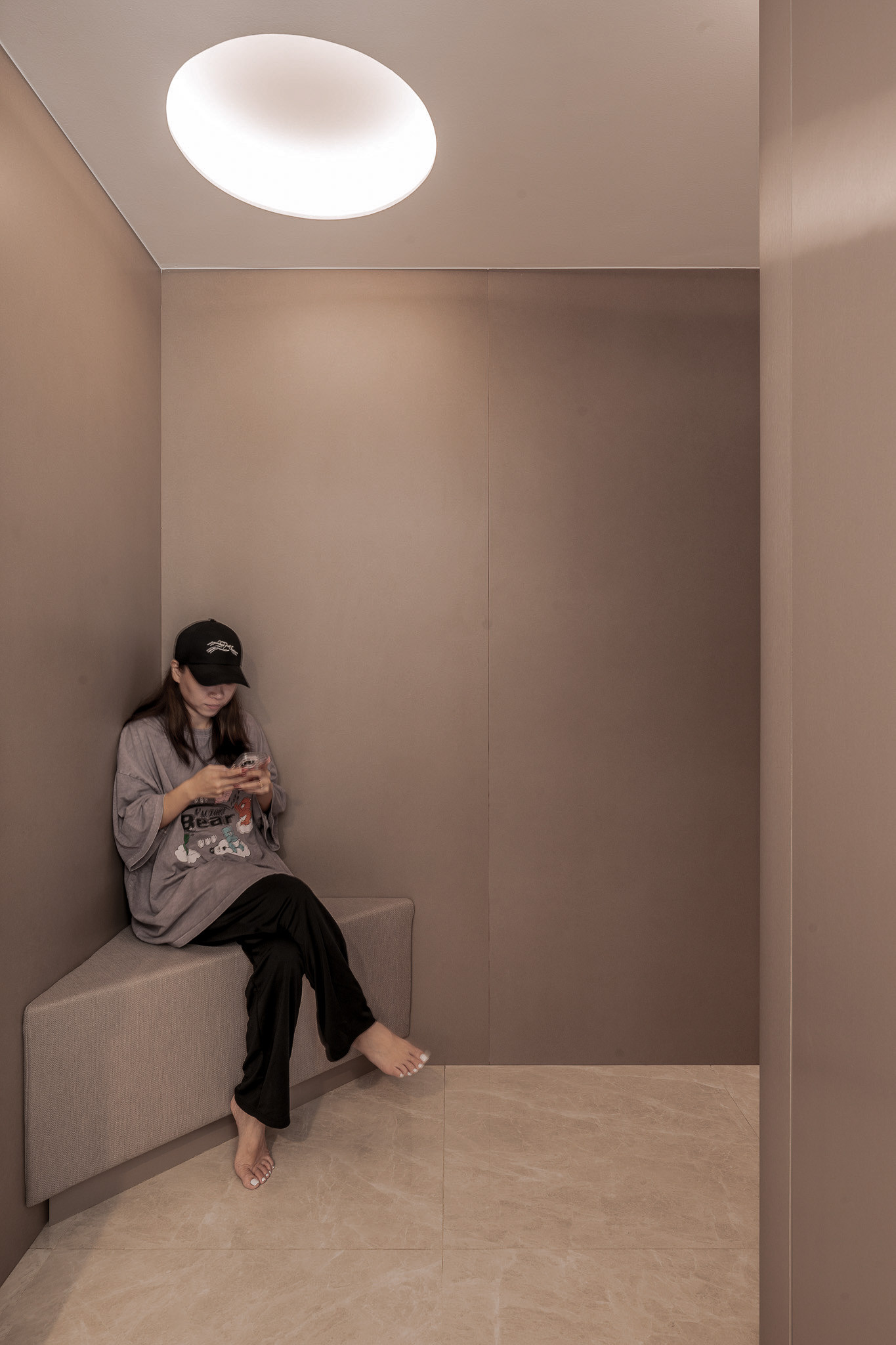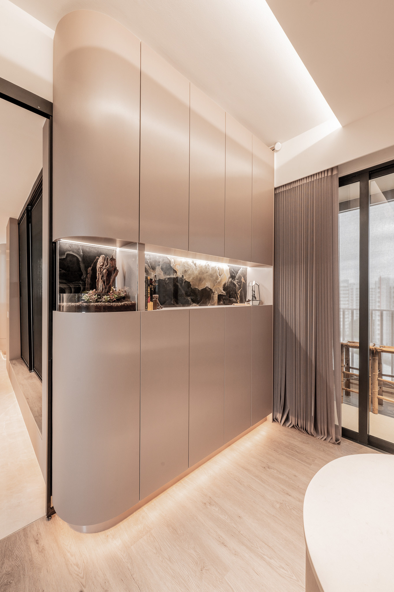 Upon entry, guests are greeted by a corridor that feels more like a gallery—lined with curved cabinetry and softened by indirect lighting. A custom upholstered corner bench awaits, not just as seating, but as a sculptural pause. This quiet vestibule sets the tone: here, even transitions are thoughtful.