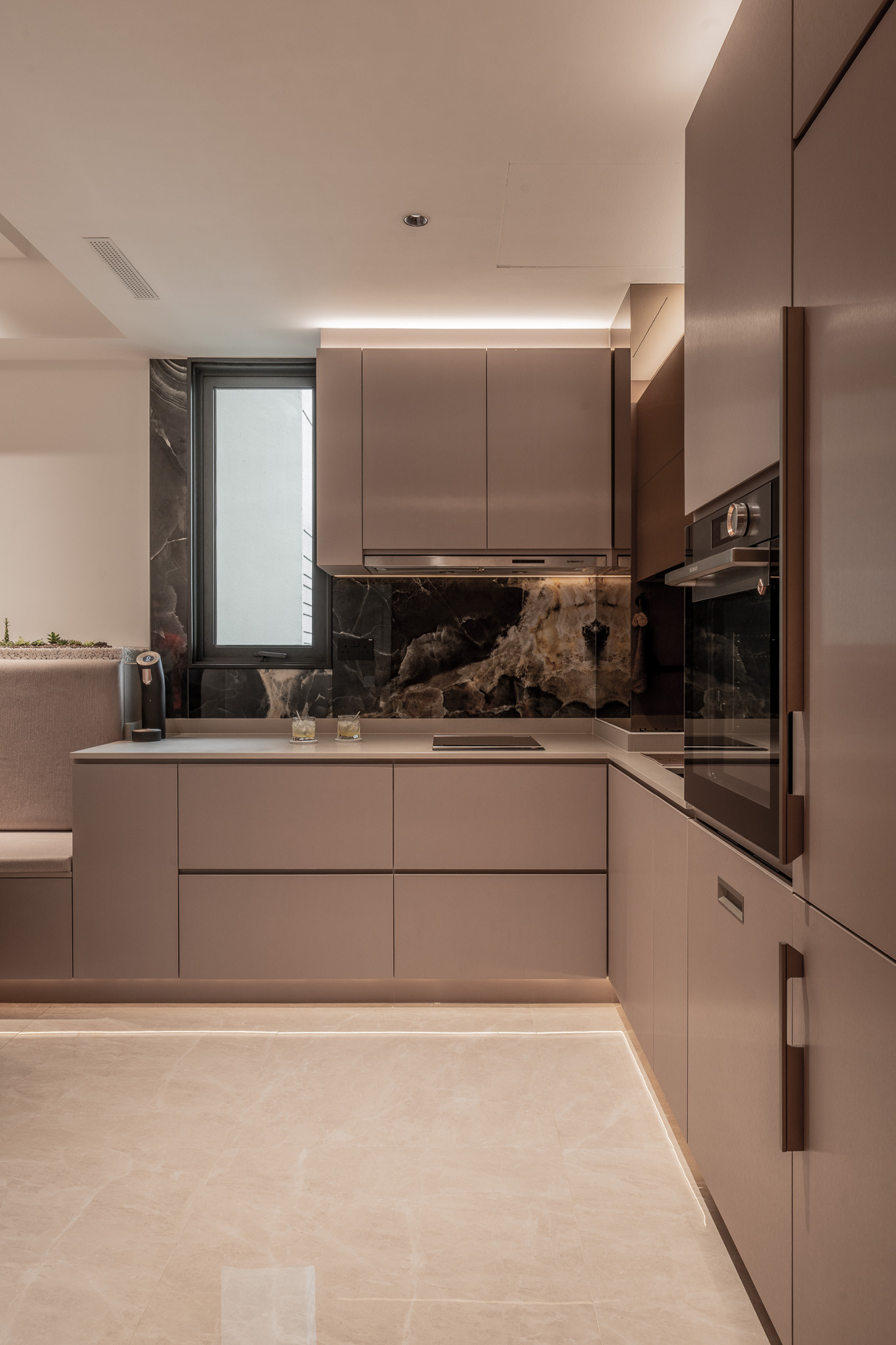 The kitchen is a masterclass in concealed intelligence. Appliances disappear into taupe cabinetry, while touchless fittings and app-connected ovens reflect a future-ready lifestyle. The rich black marble backsplash introduces a dramatic counterpoint—luxurious yet controlled.