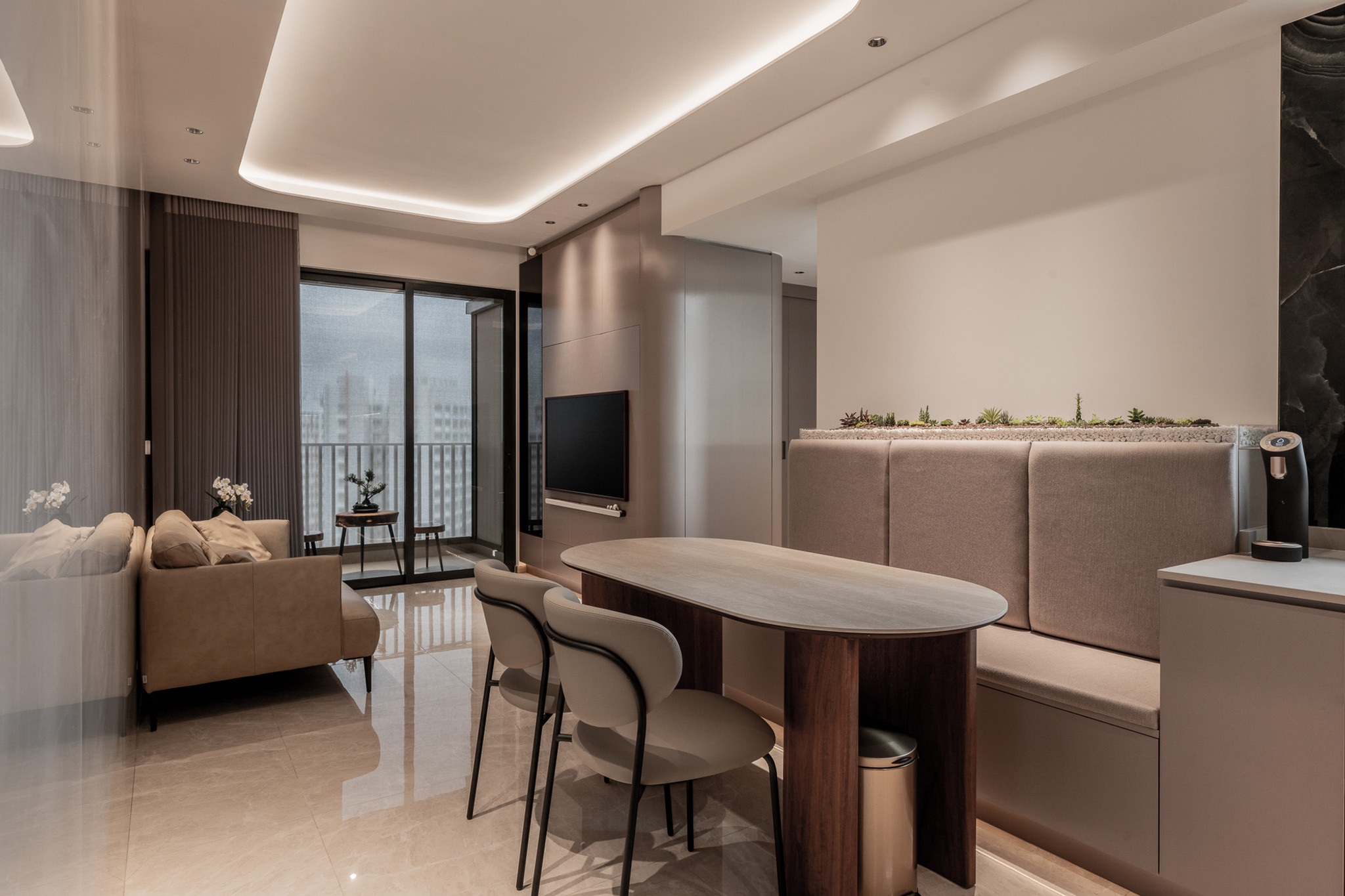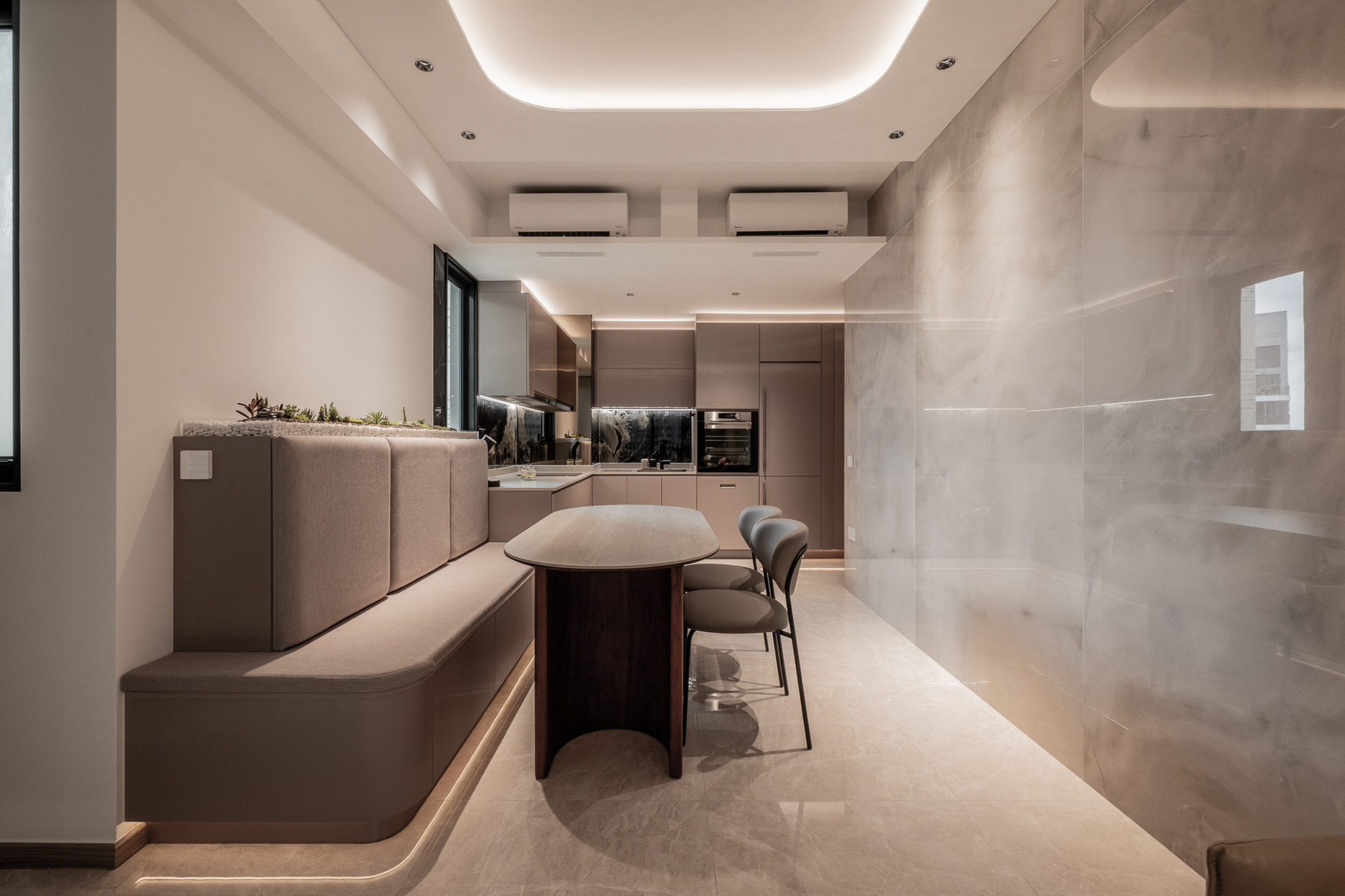 Adjacent lies the dining and kitchen area, an open-plan ensemble that balances intimacy and scale. The bespoke built-in banquette is sculpted with soft curves and wrapped in tonal fabric, offering both elegance and comfort. A minimal yet confident dining table, paired with designer chairs, completes the hosting space. Floating above, recessed lighting casts a celestial glow, while vertical greenery softens the palette, reflecting the couple’s love for living miniature gardens.