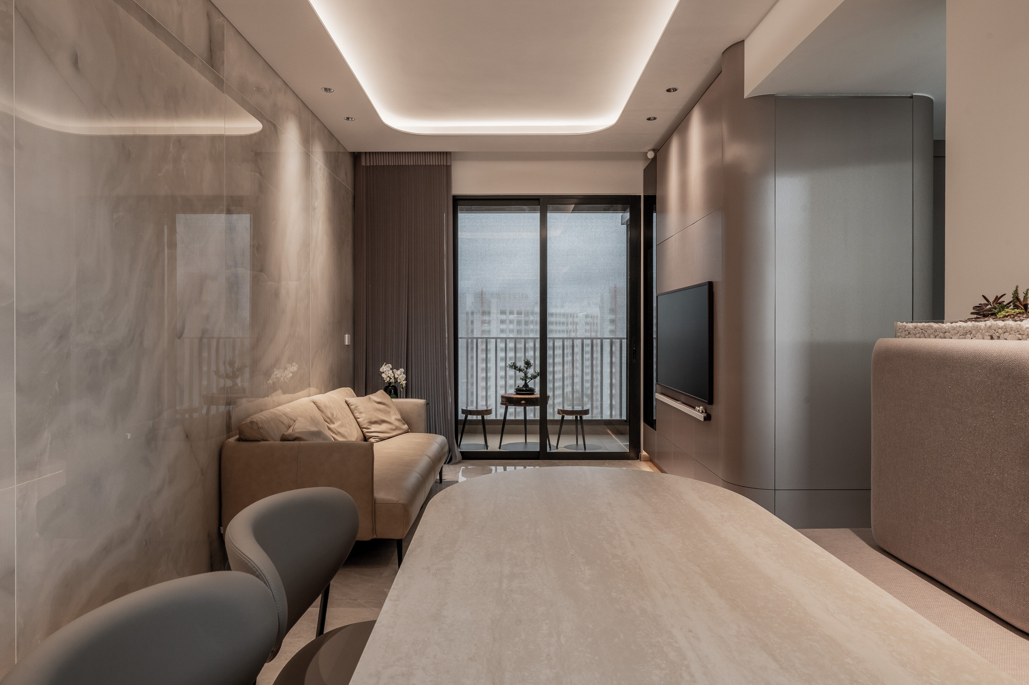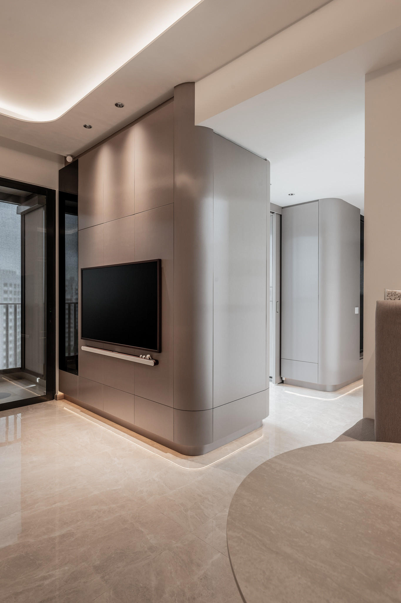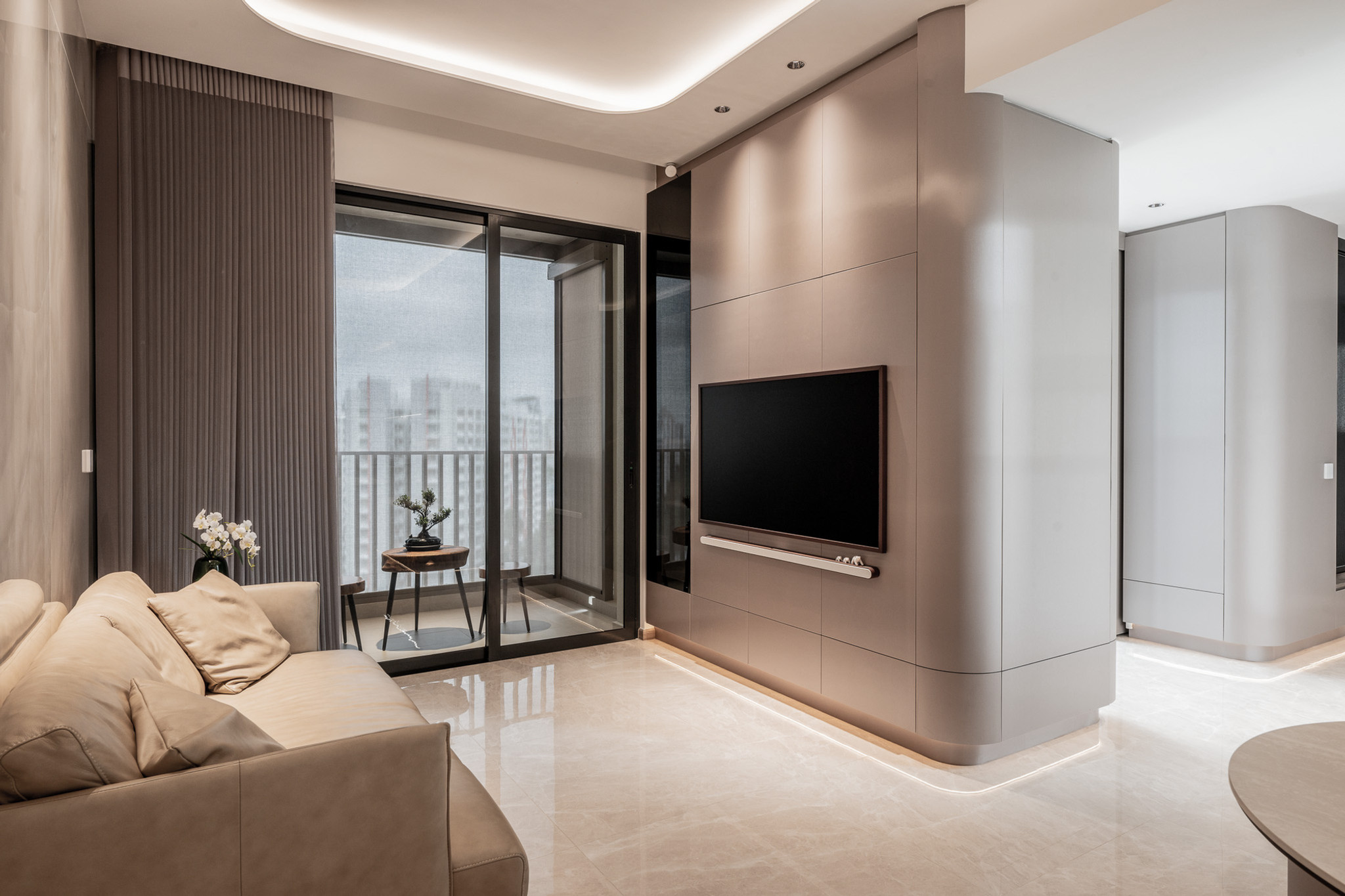 The main living area continues this visual rhythm. Walls are wrapped in matte champagne tones, while the floor gleams under soft polished marble—framing the space with understated grandeur. The living room is curated with gentle restraint: a sand-hued leather sofa anchors the space, and the media console wall is clad in full-height panels with floating detailing, hiding storage and framing the television with quiet drama. Cove lighting beneath the feature wall gives the illusion of weightlessness—an elevated nod to luxury.