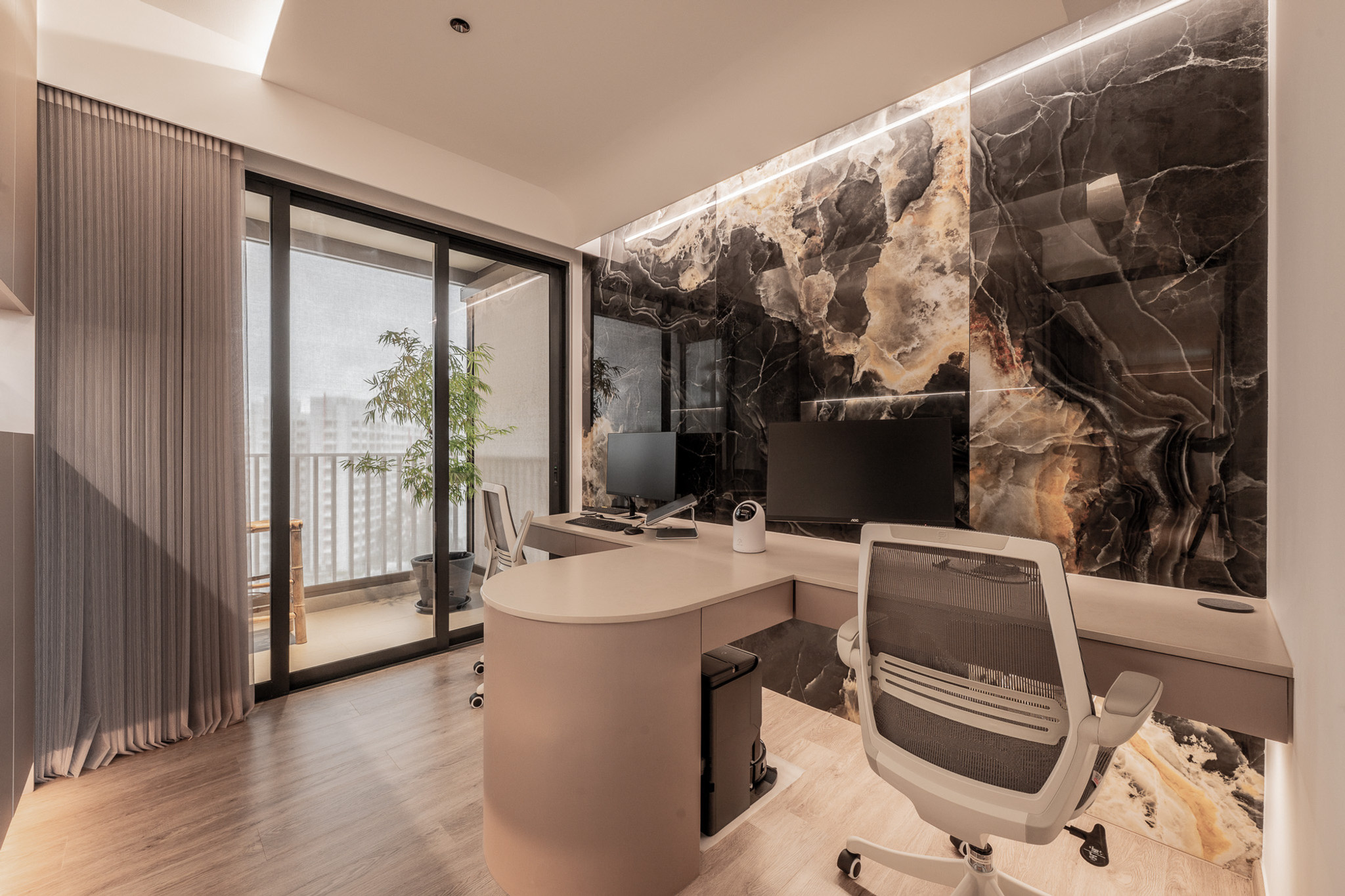 A consistent palette of mineral-inspired tones and curved volumes continues throughout the apartment, enhancing flow and serenity. Smart automation—climate, blinds, lighting—is effortlessly controlled via voice or mobile, affirming the couple’s embrace of design-led technology.