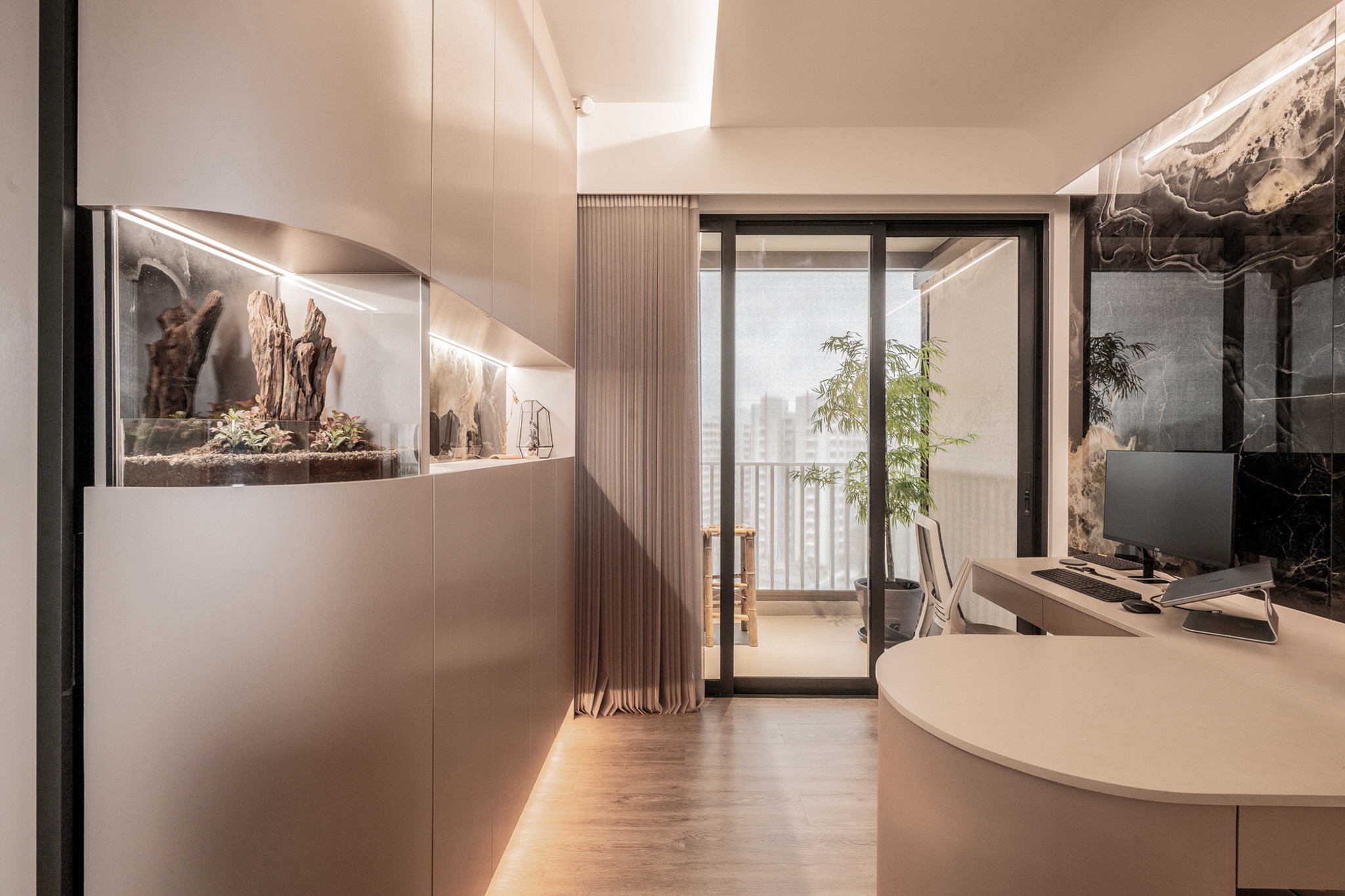 Elsewhere in the home, thoughtful corners unfold—like the ant colony and live plant setups in the secondary spaces. Rather than disrupt the design language, these are elegantly housed within custom niches and display cabinetry, turning passion into art. One bedroom is repurposed as a botanical lab and creative retreat; the other, a calming guest suite that doubles as a wellness nook.