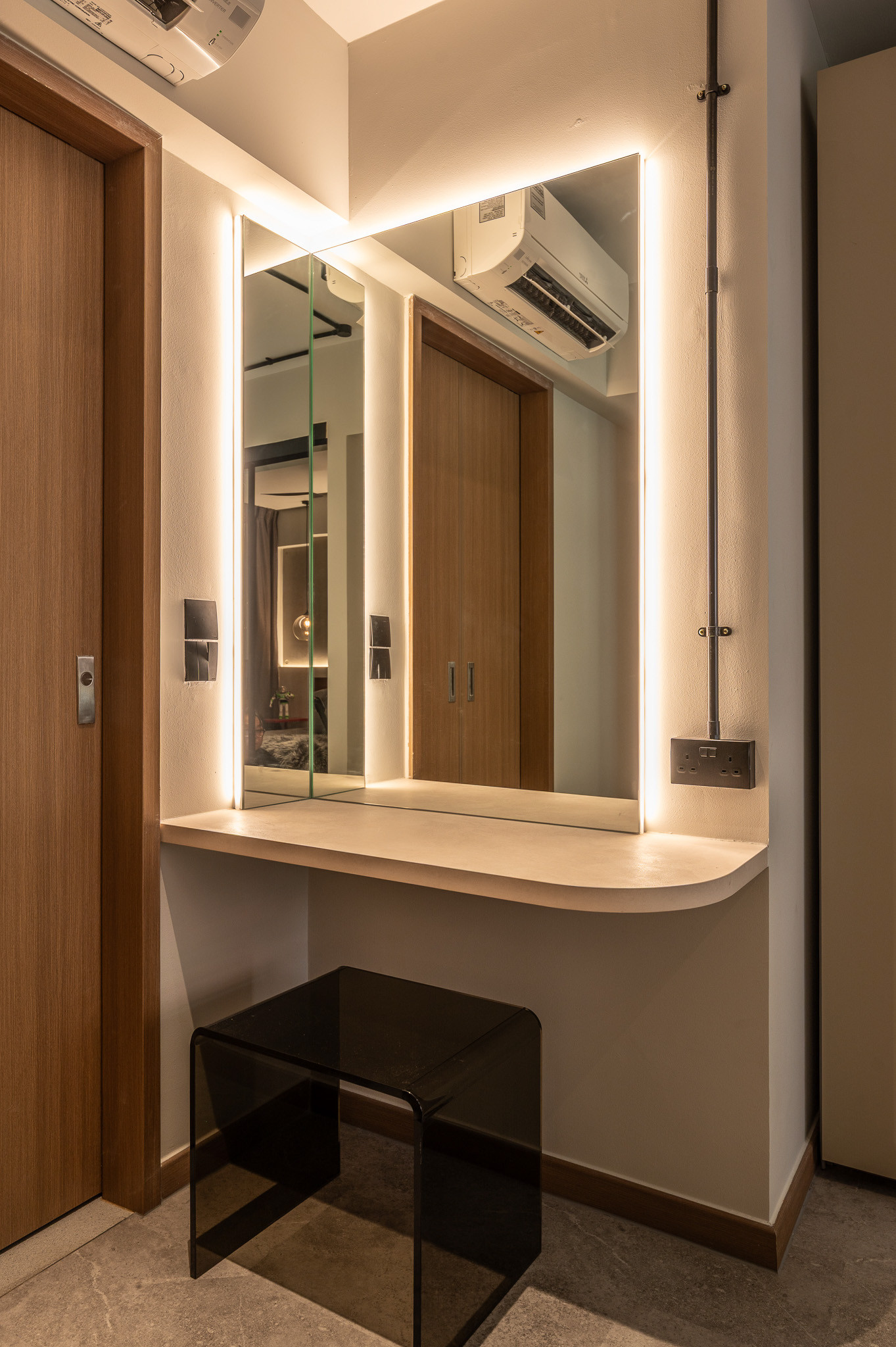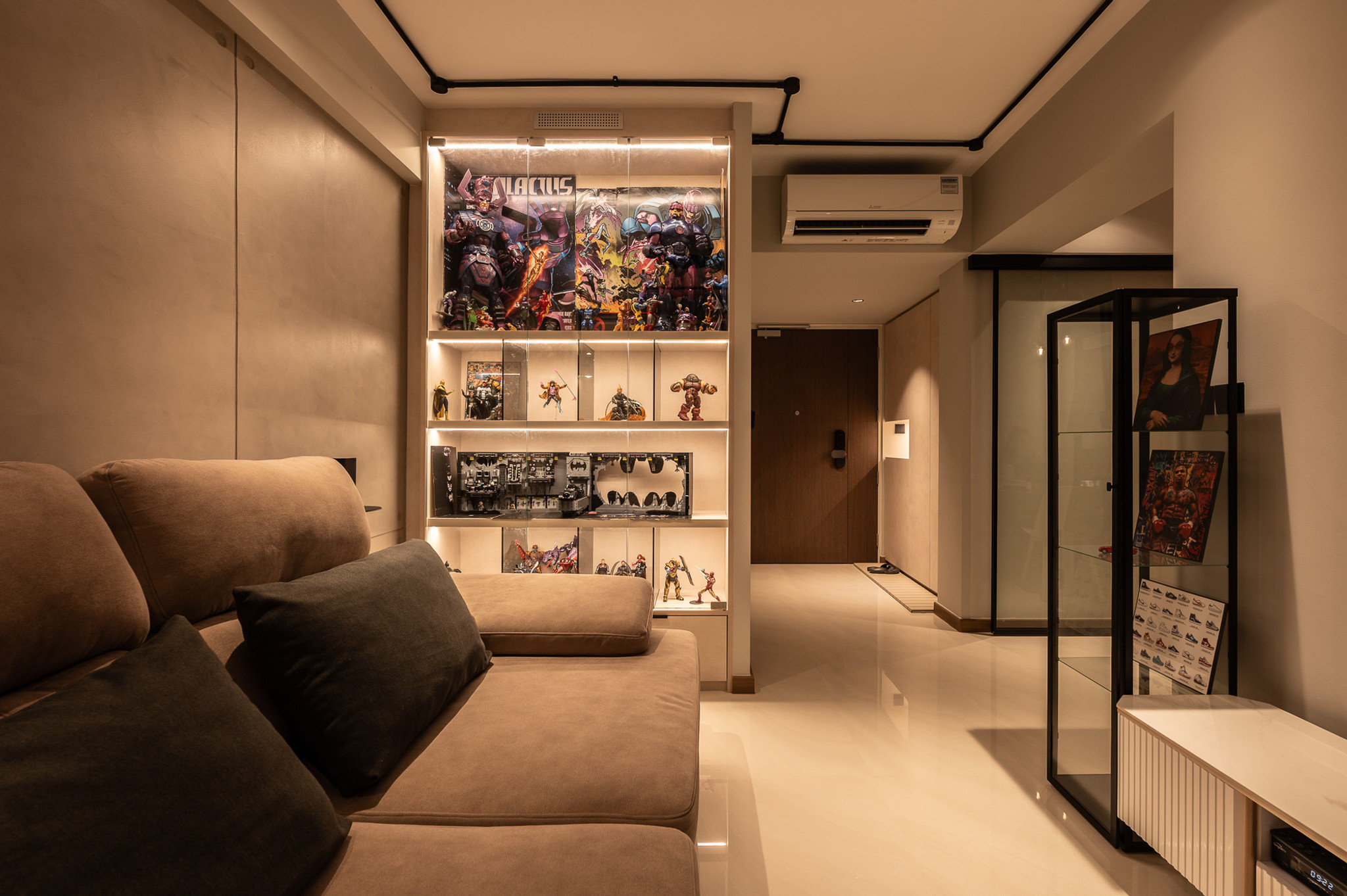 A key highlight of this home is the couple’s personal collection of Marvel hero figures and Lego builds. Instead of treating these as mere décor, Erstudio celebrates them as part of the home’s identity. Custom display niches and subtly illuminated shelving turn their collectibles into art pieces, integrating their passions seamlessly into the architecture. This creates a playful contrast within the industrial setting, adding character and a sense of storytelling.