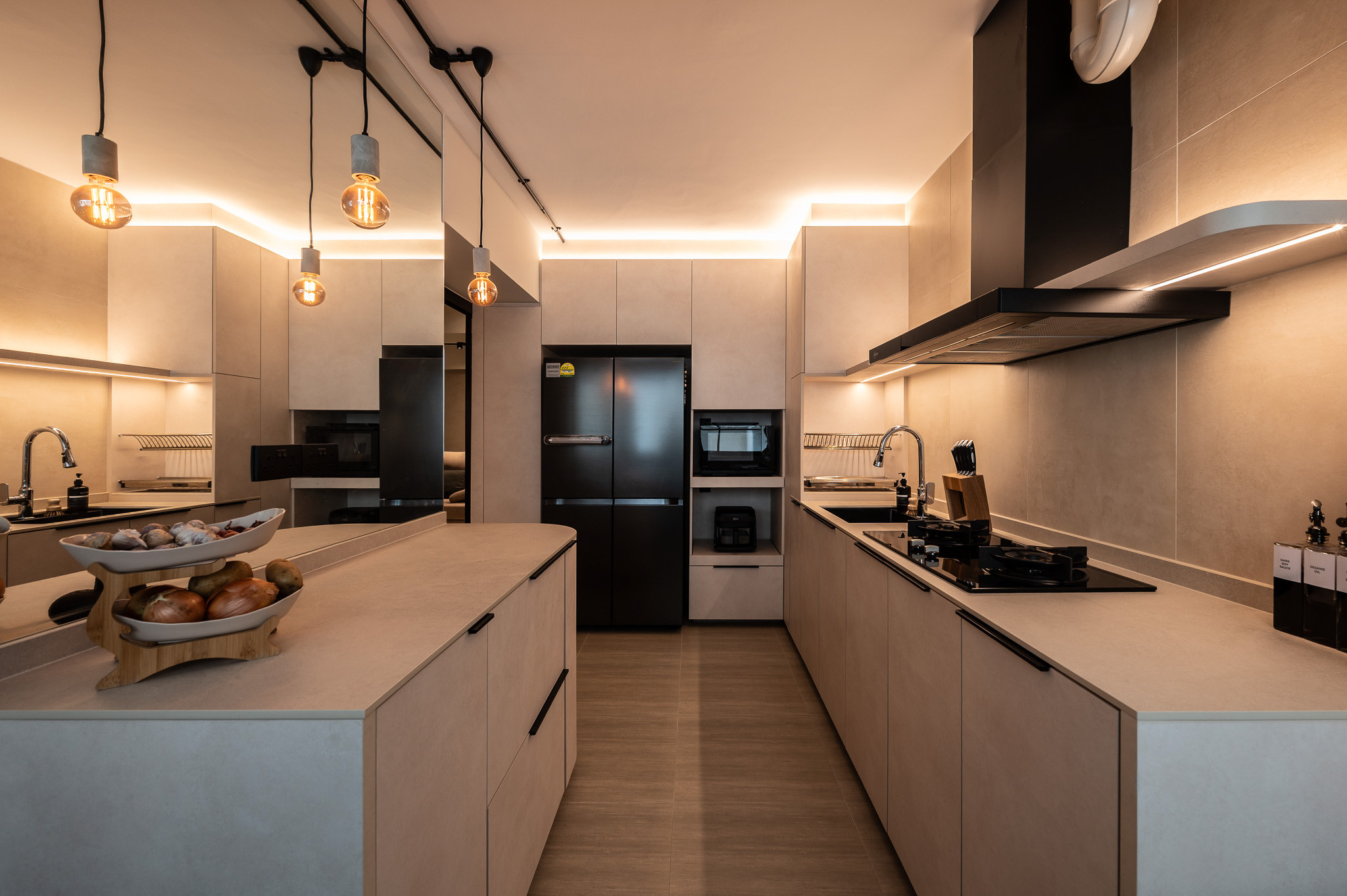 The heart of the home is its expressive materiality. Concrete finishes, matte black frames, and warm-toned wood form the foundation, creating a grounded backdrop for everyday life. Modern elements—sleek cabinetry, refined lighting profiles, and smooth architectural forms—introduce clarity and sophistication, ensuring the space feels fresh rather than rugged.