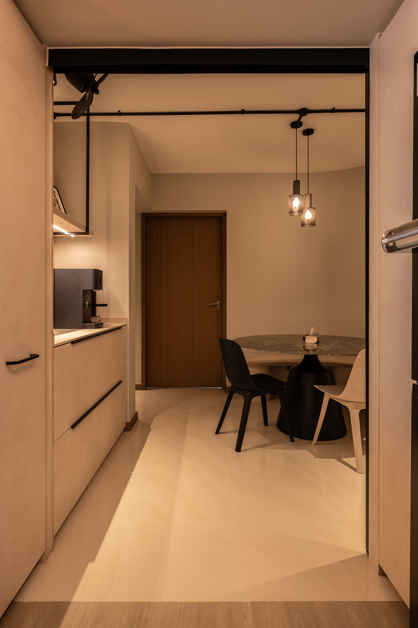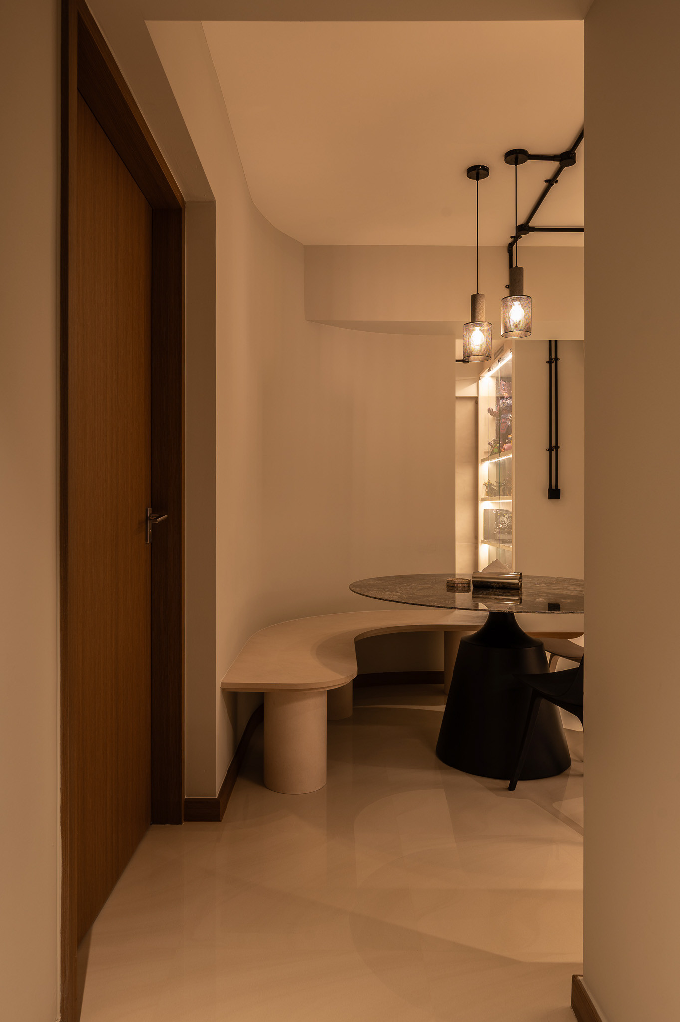 The layout is tailored for comfort and companionship. Open, breathable spaces allow the couple to move fluidly throughout their daily routines, while thoughtful nooks provide comfort zones for their small dog. The overall ambience remains airy yet intimate—structured but never stiff.