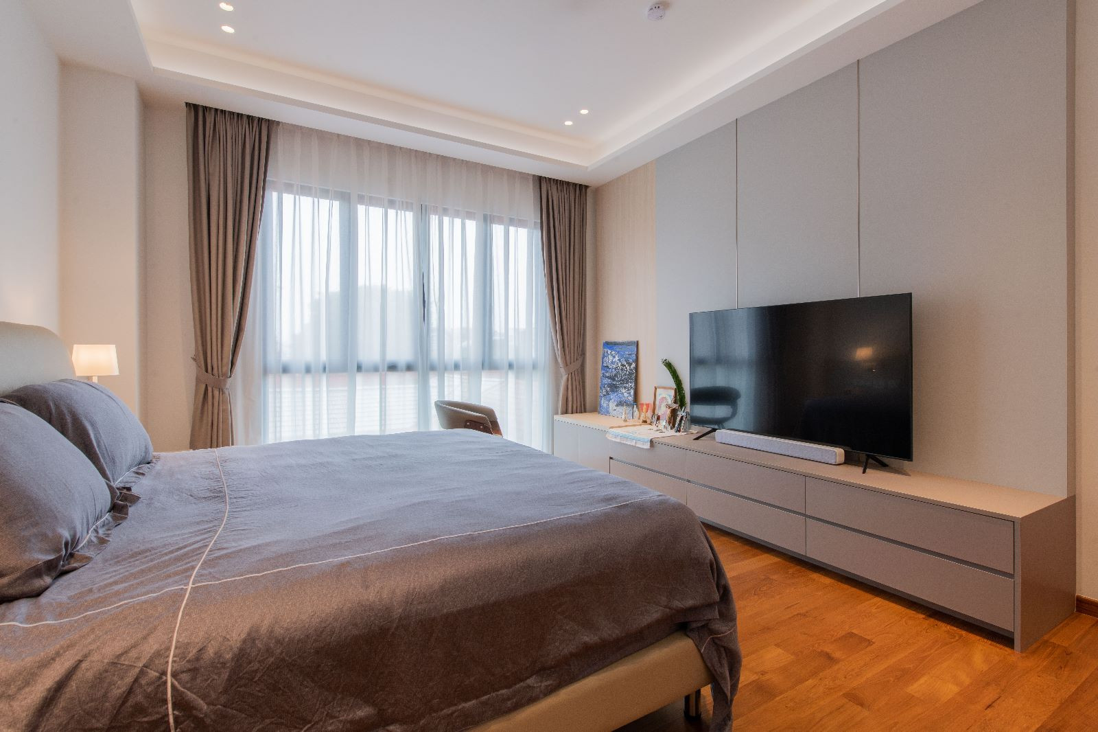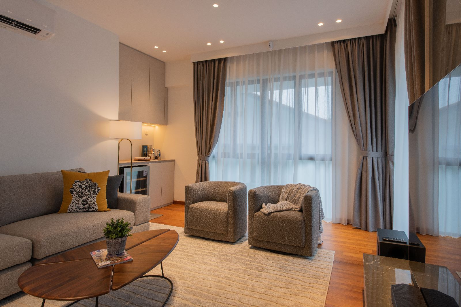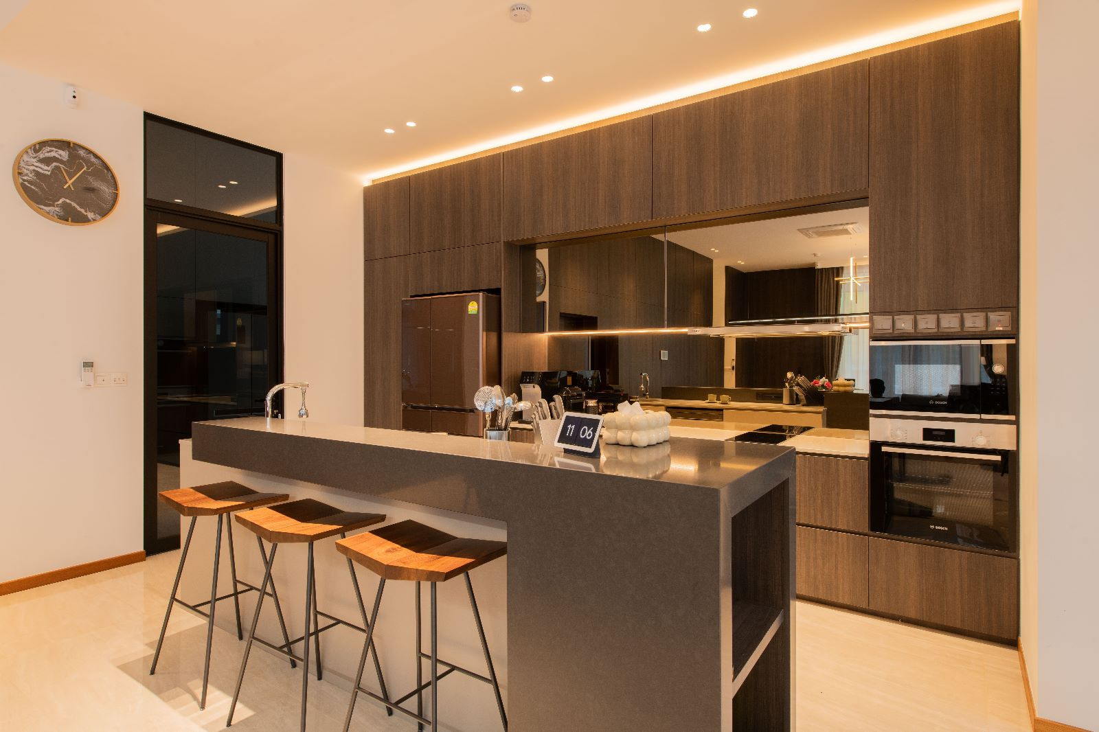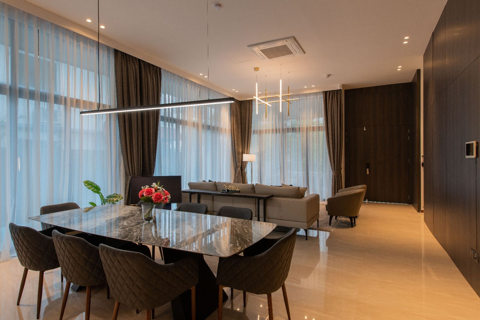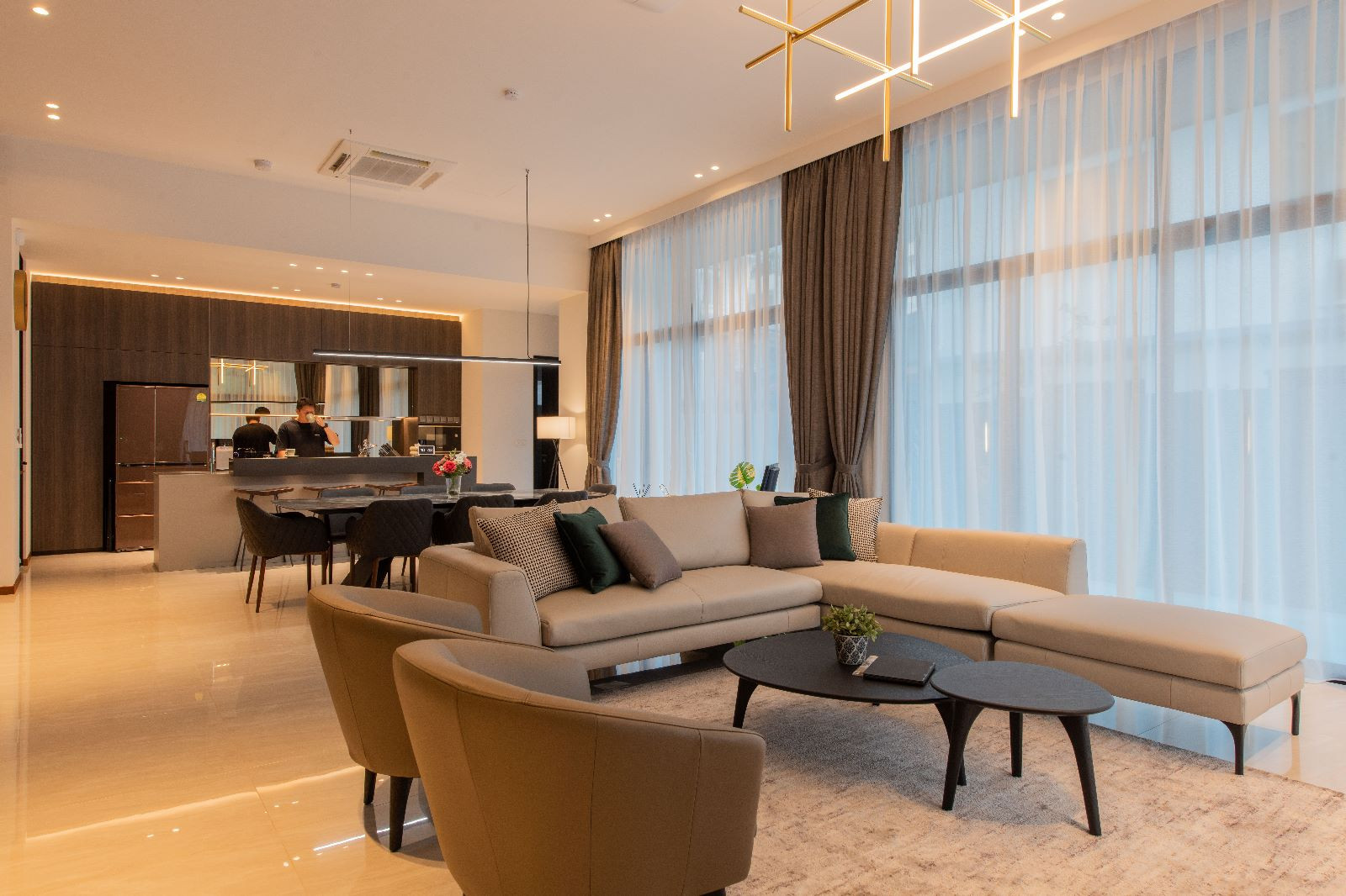 The architectural essence of the home is contemporary luxury. The aesthetic is clean and sophisticated, promising a style that transcends time. It’s an investment in a space they plan to call home for decades to come. Earthy tones have been chosen to harmonize with the house’s exterior, creating a consistent design language throughout the residence.